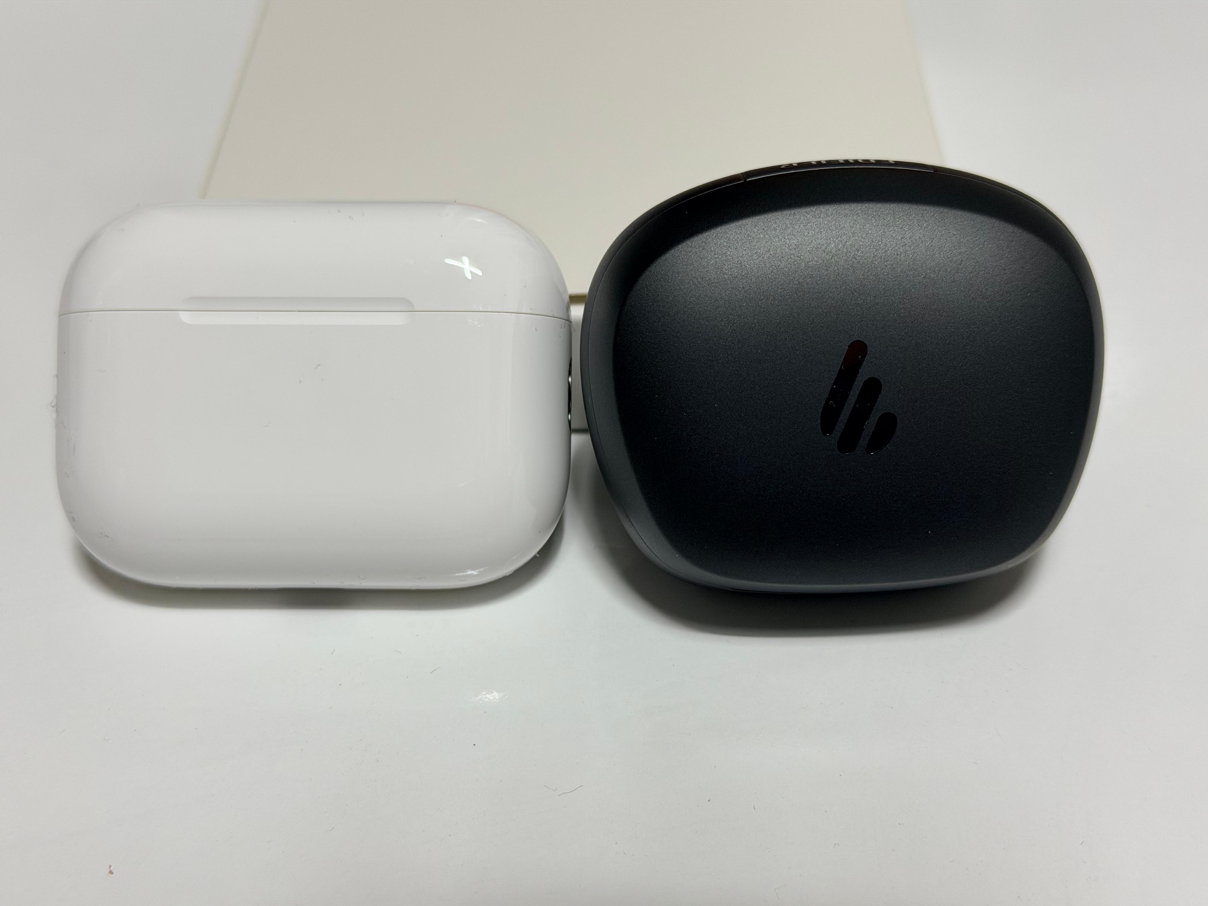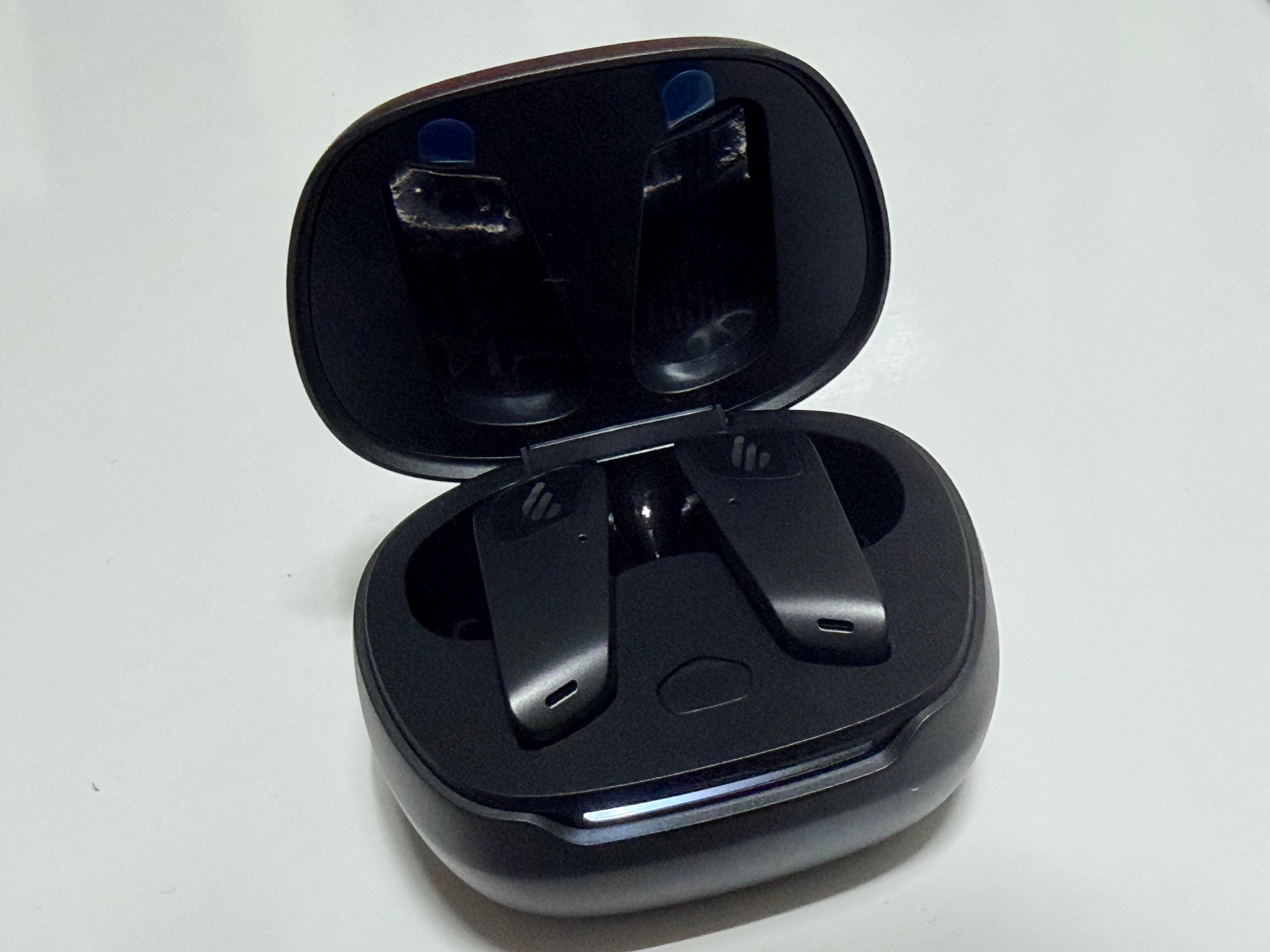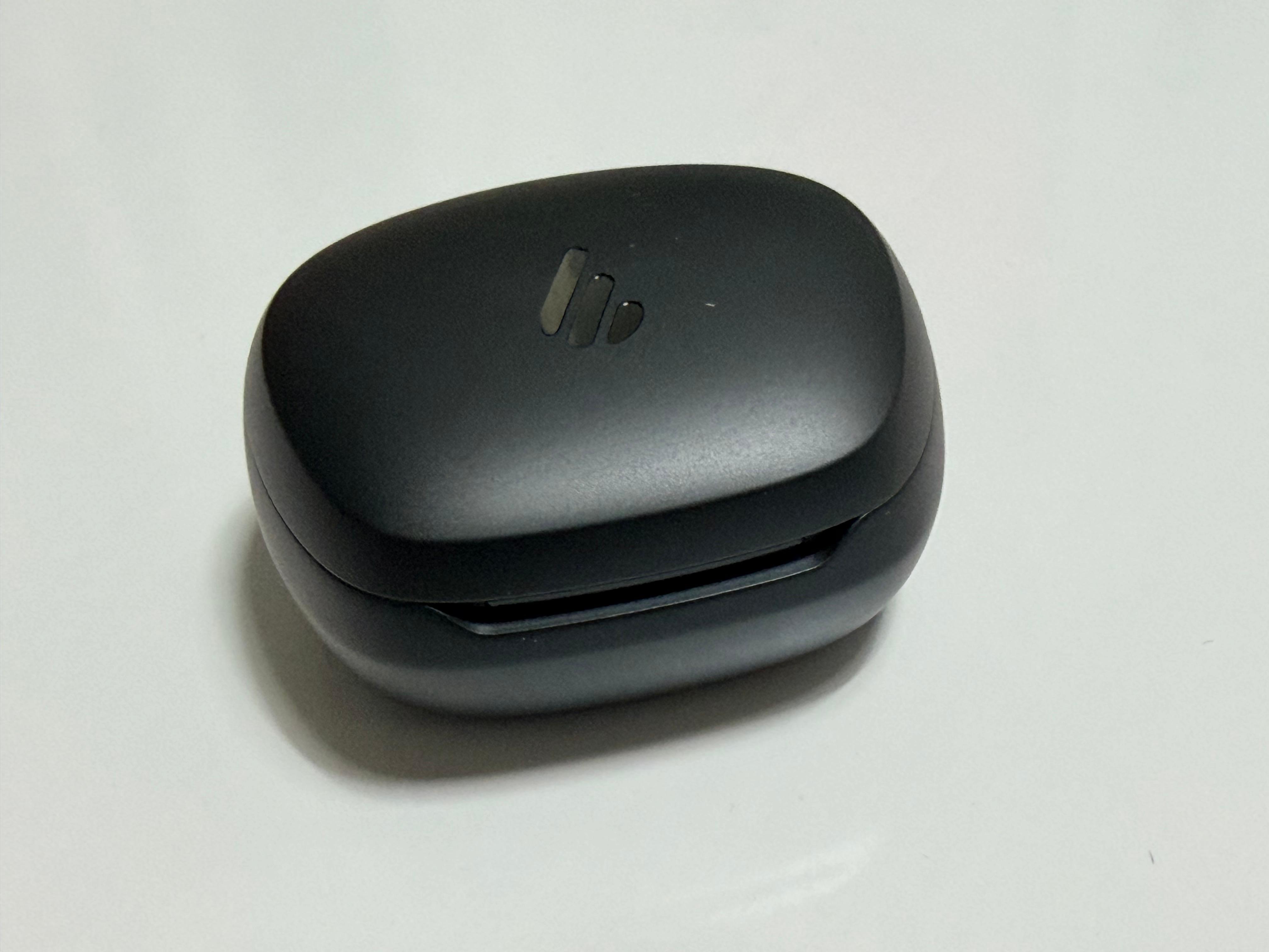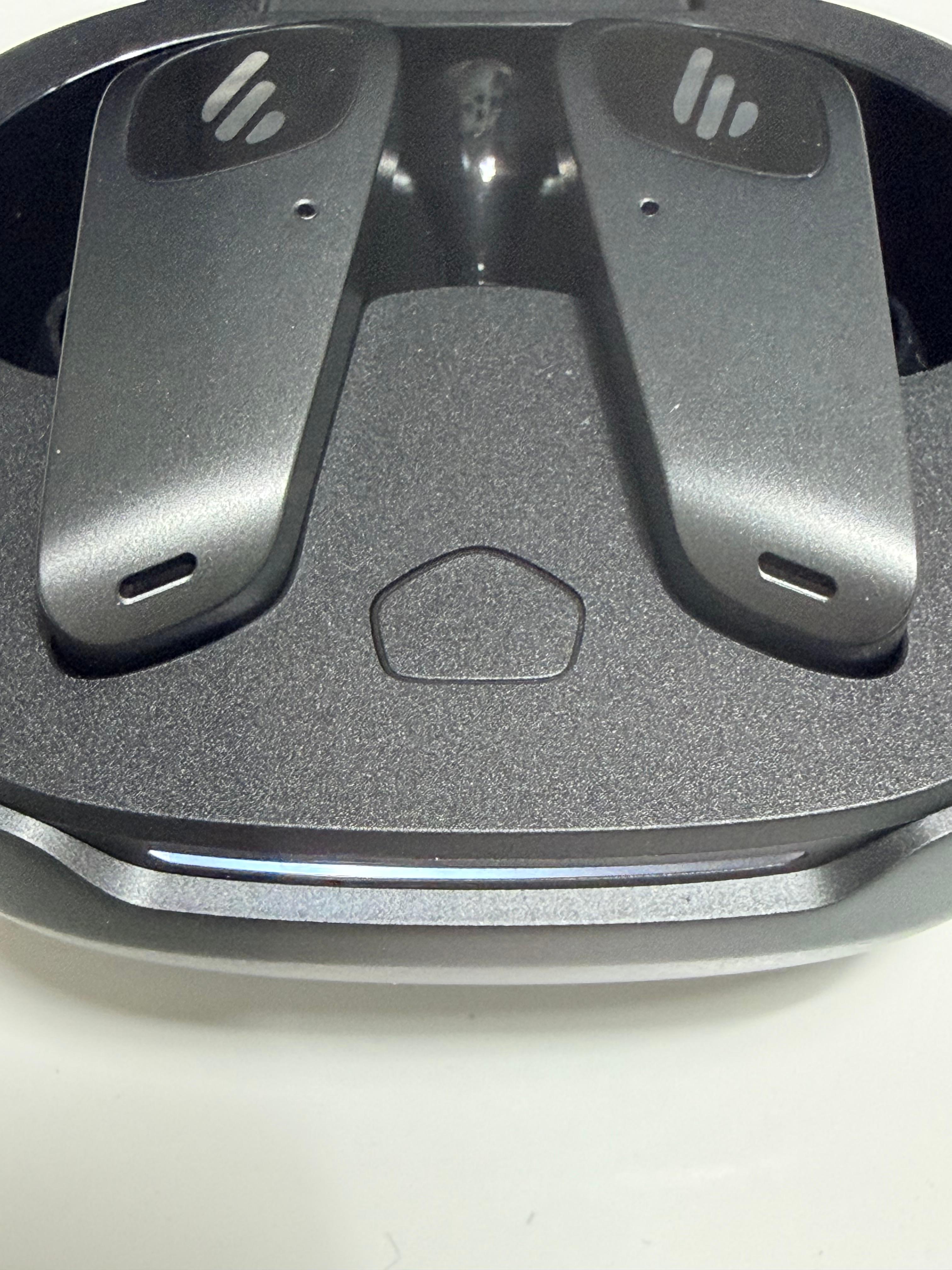 이어폰 케이스는 위에서 내려다 봤을 때는 크기가 그렇게 크다는 생각은 들지 않습니다. 에어팟 프로3 케이스보다 조금 더 큰 정도입니다만 옆에서 봤을 때는 에어팟 프로3 케이스에 비해 높이가 거의 1.5배 정도입니다. 케이스 자체에는 소리가 나는 스피커가 내장되어 있지는 않고, 무선충전은 지원합니다. 케이스를 열거나 충전중에는 전면부에 LED가 감각적으로 빛이 납니다. 같은 회사의 ES300 네트워크 홈스피커에서도 동일한 LED 발광 형태를 볼 수 있는데 아마도 회사의 시그니처인가 봅니다. 케이스에는 이전 STAX S10이 STAX 로고를 달고 있는 것과 달리 에디파이어 로고가 인쇄되어 있습니다. 케이스 안쪽에는 야구 홈베이스와 유사한 오각형의 페어링 버튼이 존재하고 있어서 자동으로 연결이 되지 않을 때 수동 페어링도 가능합니다.
