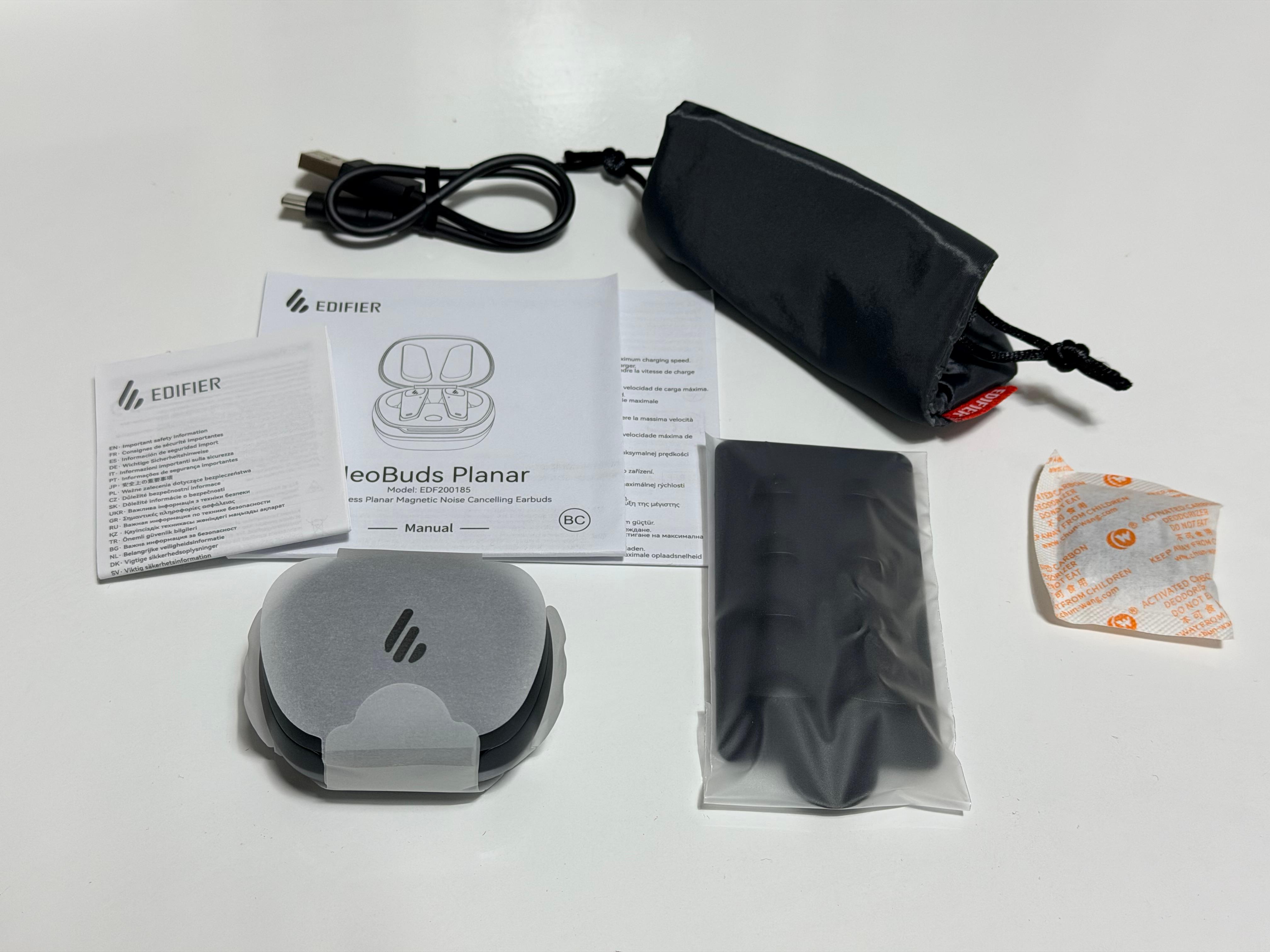 박스는 흰색이지만 정작 제품은 검은색이라 좀 이질감은 있습니다. 종이상자에는 설명서, 파우치, 이어팁, USB A to C 케이블, 방습제가 들어 있습니다. 이런 게 바로 '조그만한 파우치'죠. 디올 대신 제조사인 에디파이어 택이 붙어 있습니다. 어디 가서 명품이라고 구라도 못 칩니다. 뇌물로 주기엔 많이 부족한 조그만 파우치입니다. 이어팁은 이어폰에 꽂혀 있는 L 사이즈 외에 추가로 4개 사이즈가 더 들어 있습니다. XS, S, M, XL 입니다.