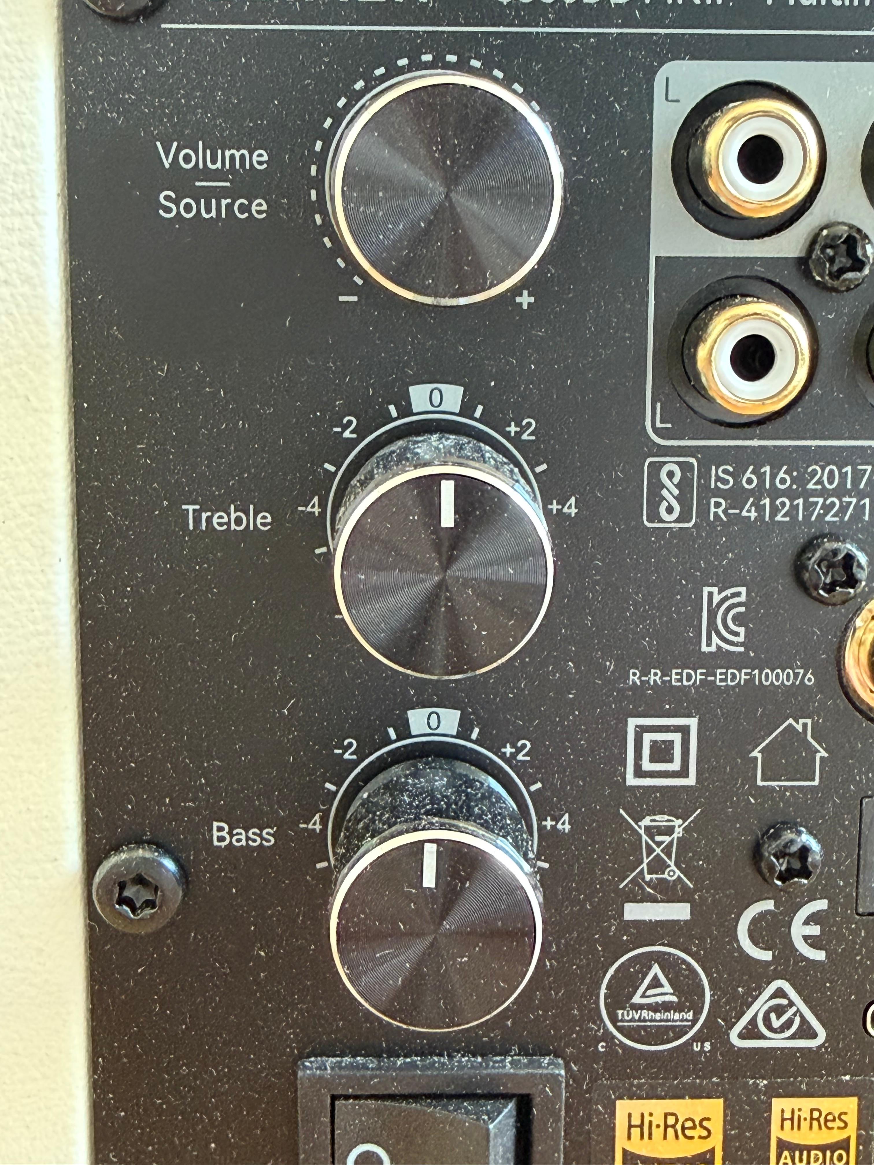 후면 가장 위에는 볼룸 다이얼과 소스 변경을 할 수 있는 버튼이 달려 있고, 그 아래에 Treble과 Bass 조절 다이얼이 있습니다. 이 다이얼은 아날로그가 아니라 디지털 방식입니다. 다이얼을 돌리면 전면 OLED에 +1, +2, -1, -2 이런 식으로 표시가 됩니다. 아날로그식을 좋아하는 분들도 있겠지만 디지털 방식 역시도 장점이 있는 만큼 저는 상관이 없다는 생각입니다. 다이얼을 돌리면 스피커에 굉장히 직관적이면서 명확하게 소리의 성향이 바뀌는 것을 확인할 수 있었습니다. 그러면 됐죠. 아날로그든 디지털이든 그게 문제는 아닙니다.