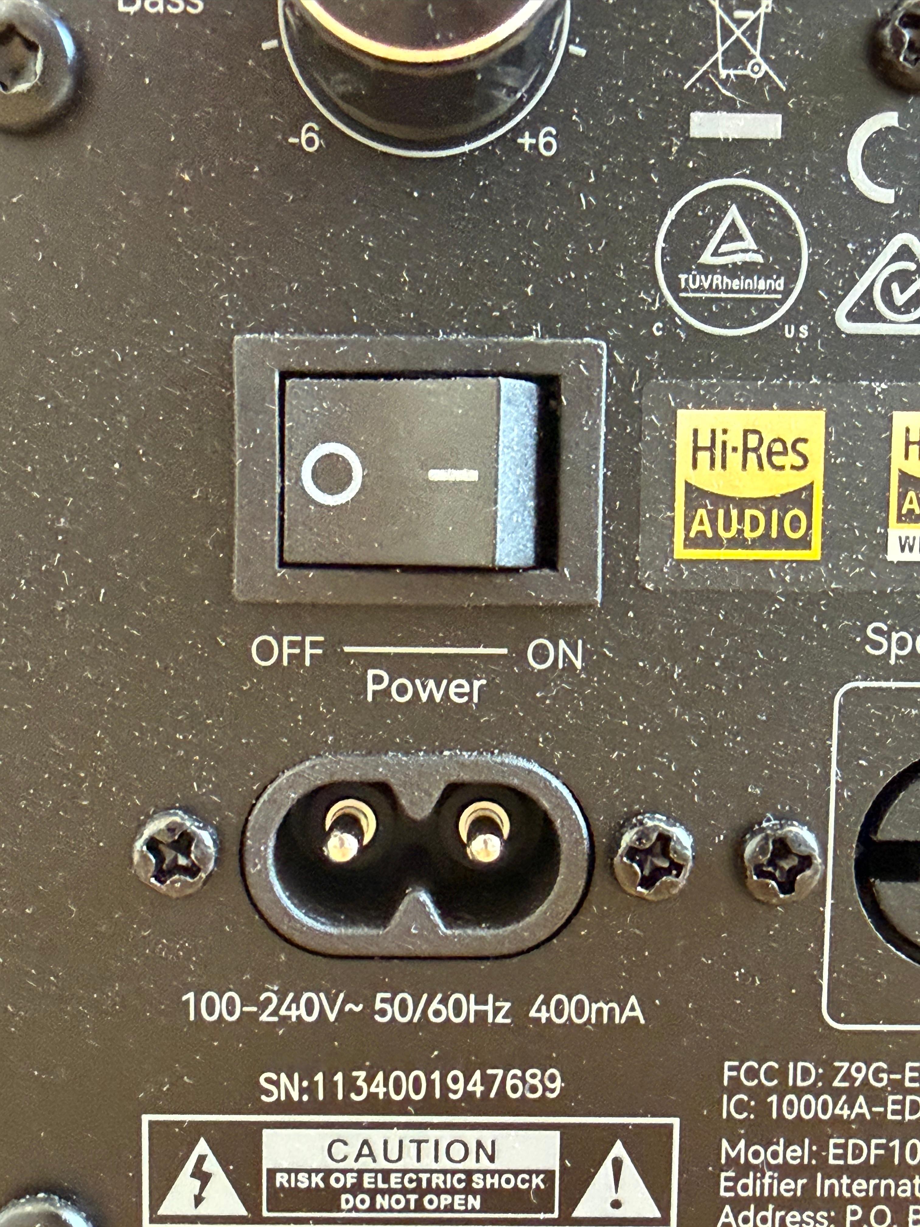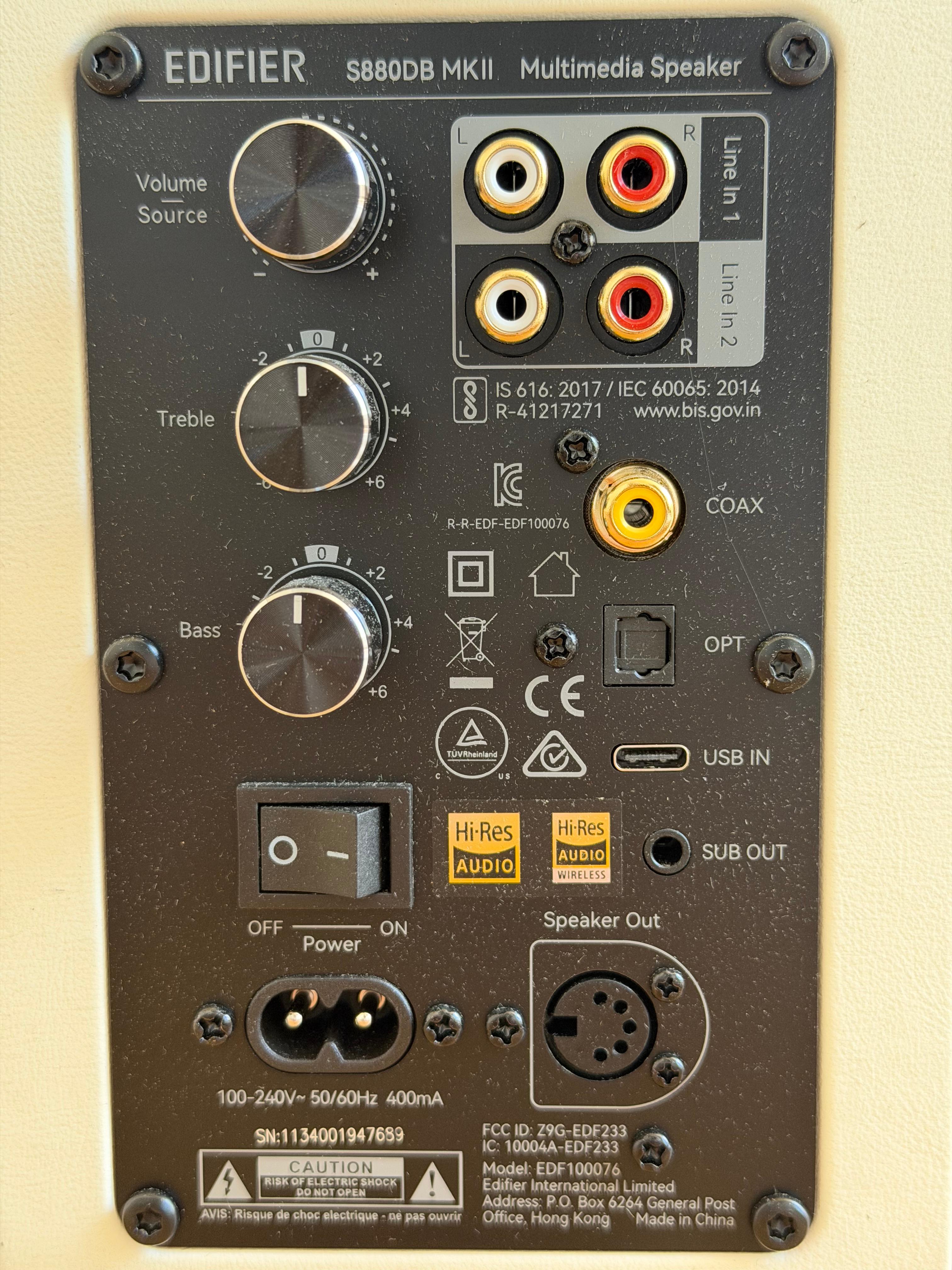스피커 뒷면의 상단에는 타원형 모양의 에어덕트가 있습니다. 저음이 다소 과하다 싶으면 이 에어덕트를 살짝 막는 것도 방법일 수 있습니다만 에디파이어 S880DB MKII는 뒷면에 고역과 저역을 조절할 수 있는 다이얼이 있어서 음색을 조절할 수 있습니다.