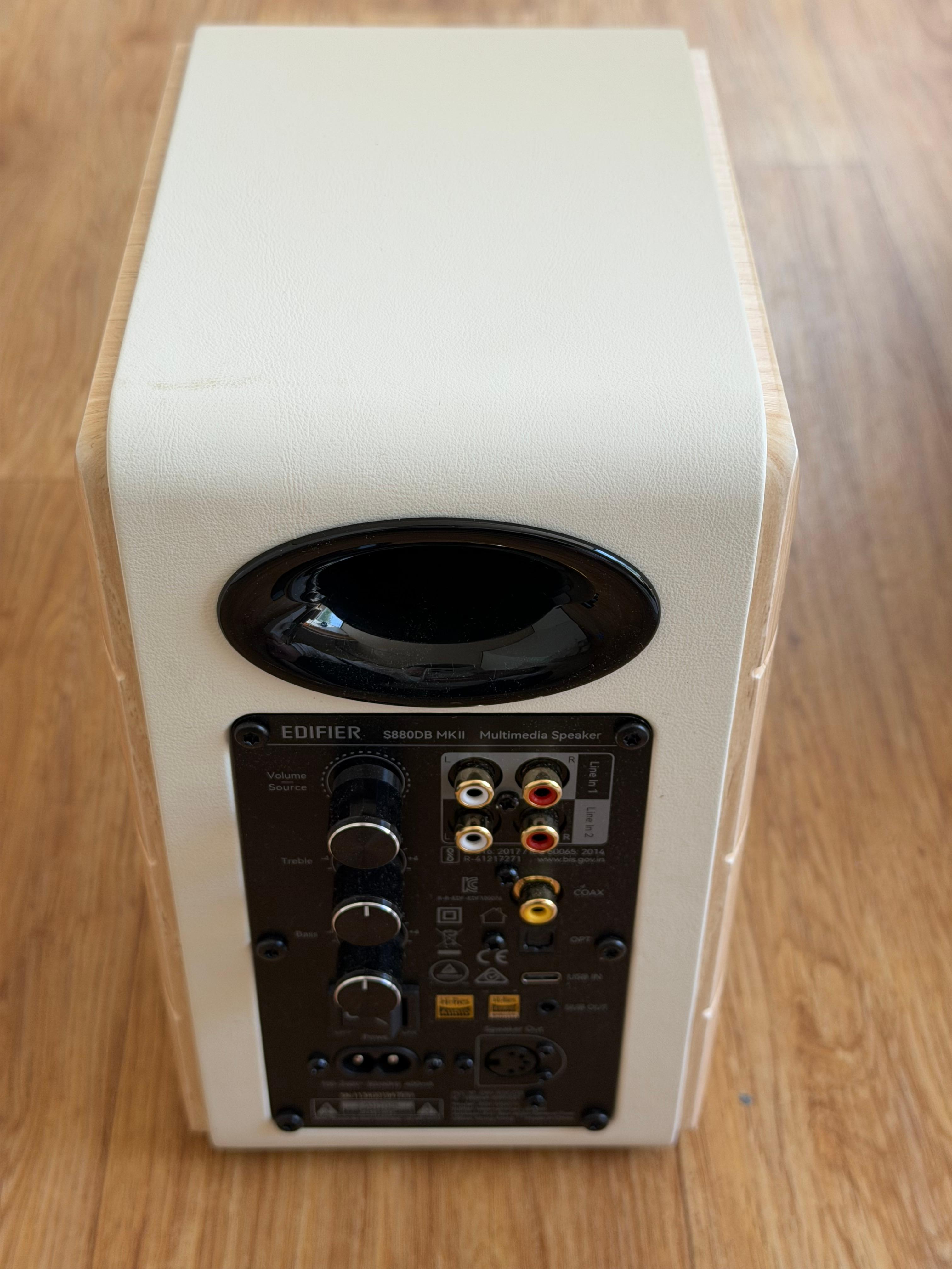 에디파이어 S880DB MKII는 전형적인 2채널 북쉘프 스피커입니다. 흰색과 나무색을 잘 섞어서 고급감을 주었고, 좌우 균형을 위해 오른쪽 유닛의 OLED 영역에 왼쪽 유닛에는 비슷한 크기의 회사 로고를 붙였습니다.