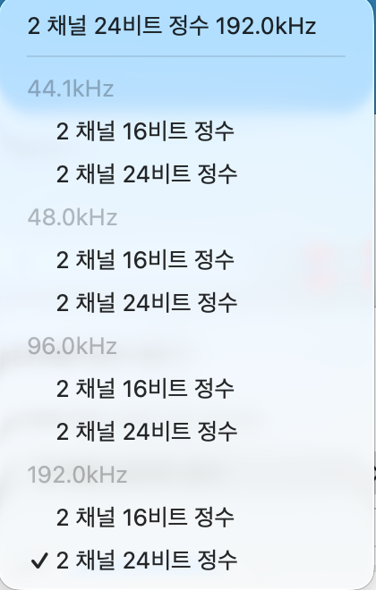 맥북에 USB C 케이블을 이용해서 연결해 봤습니다. 24비트 192KHz까지 지원하는 것을 확인할 수 있습니다. KANTO ORA가 24비트 96KHz까지만 지원하는 것에 비해서는 확실히 스펙이 높습니다. 물론 이 둘 간의 차이보다는 제품 자체가 가진 앰프와 유닛의 성능이 더 큰 의미가 있긴 합니다. 하지만 기분은 좋죠.
