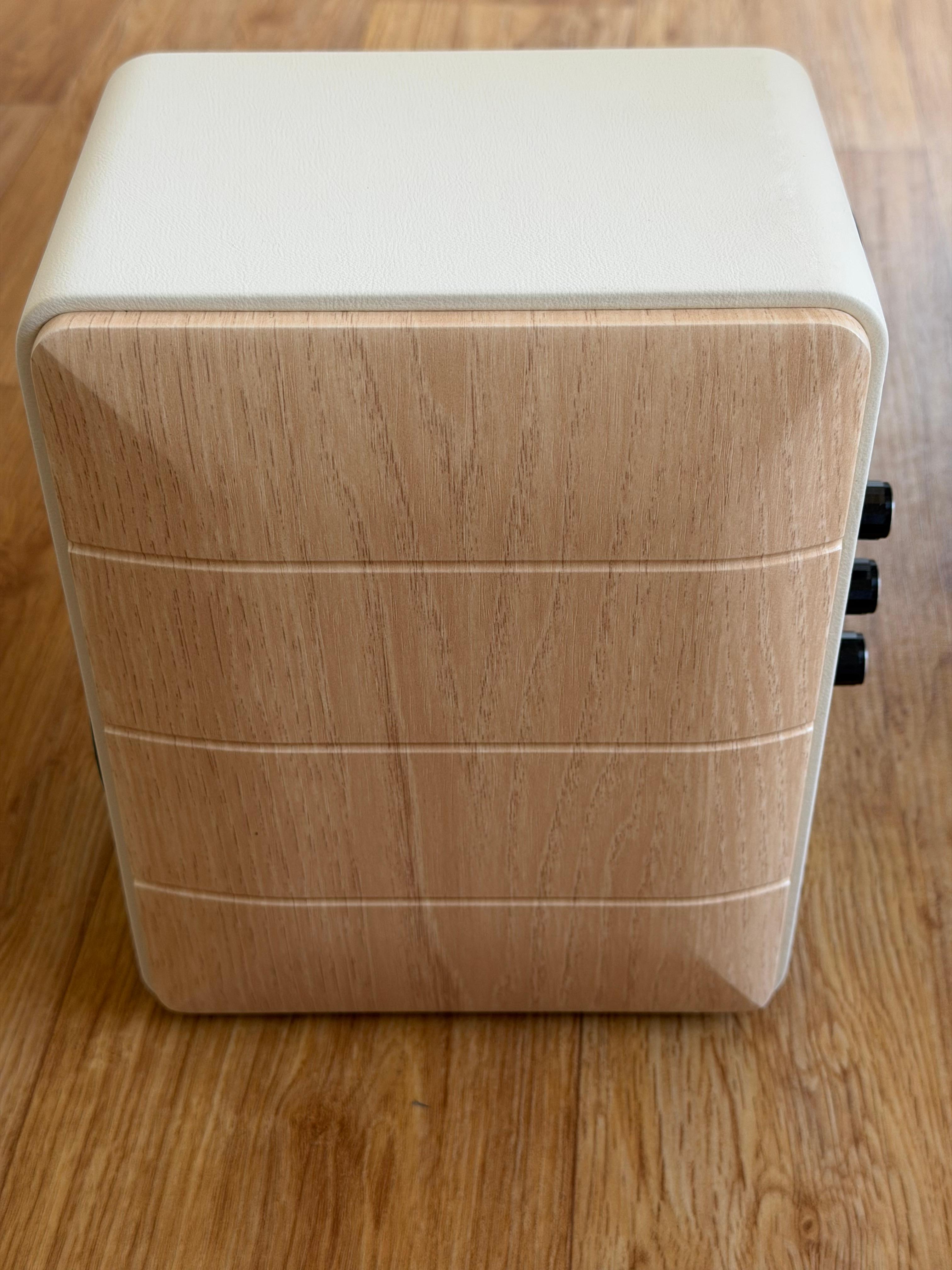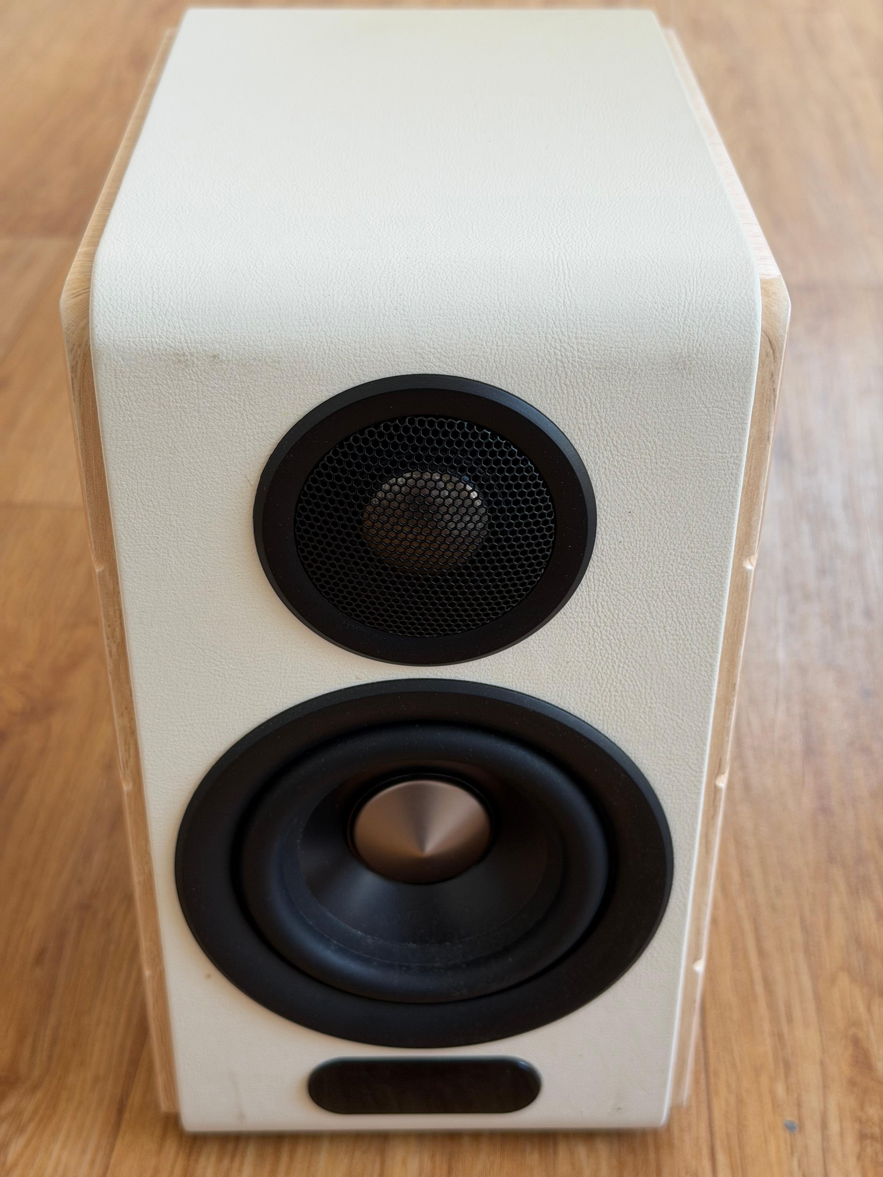 전면의 흰색 재질은 인조 가죽 느낌의 재질을 사용해서 플라스틱처럼 완전히 딱딱하지 않고 손으로 누르면 살짝 들어가는 느낌을 줍니다. 스피커 좌우측은 나무 모양의 필름을 붙인 것 같습니다. 이건 대부분의 중급기 이하의 북쉘프 스피커에서 볼 수 있는 방식이기 때문에 원목이 아니라고 트집을 잡을 수는 없을 겁니다.
