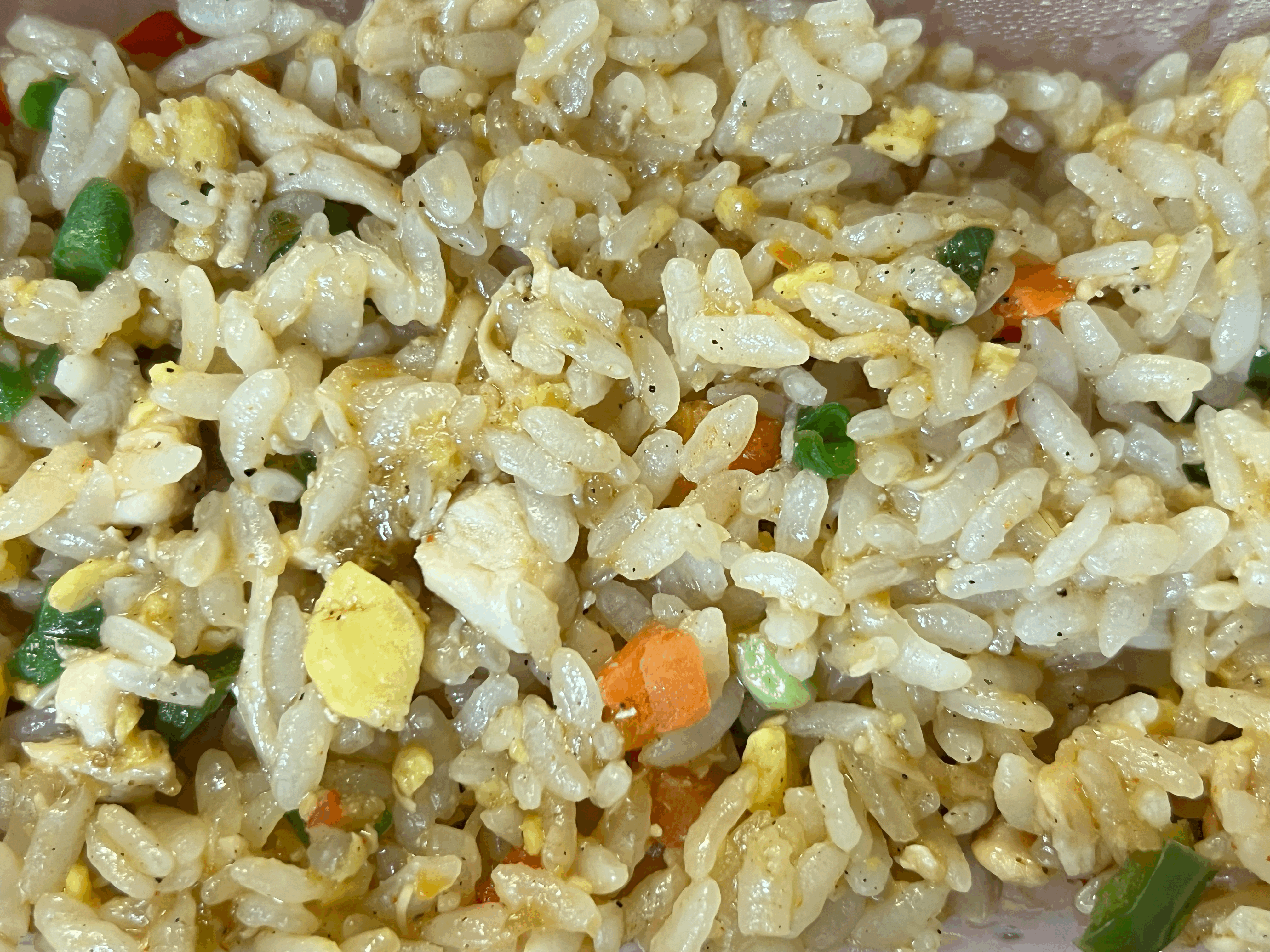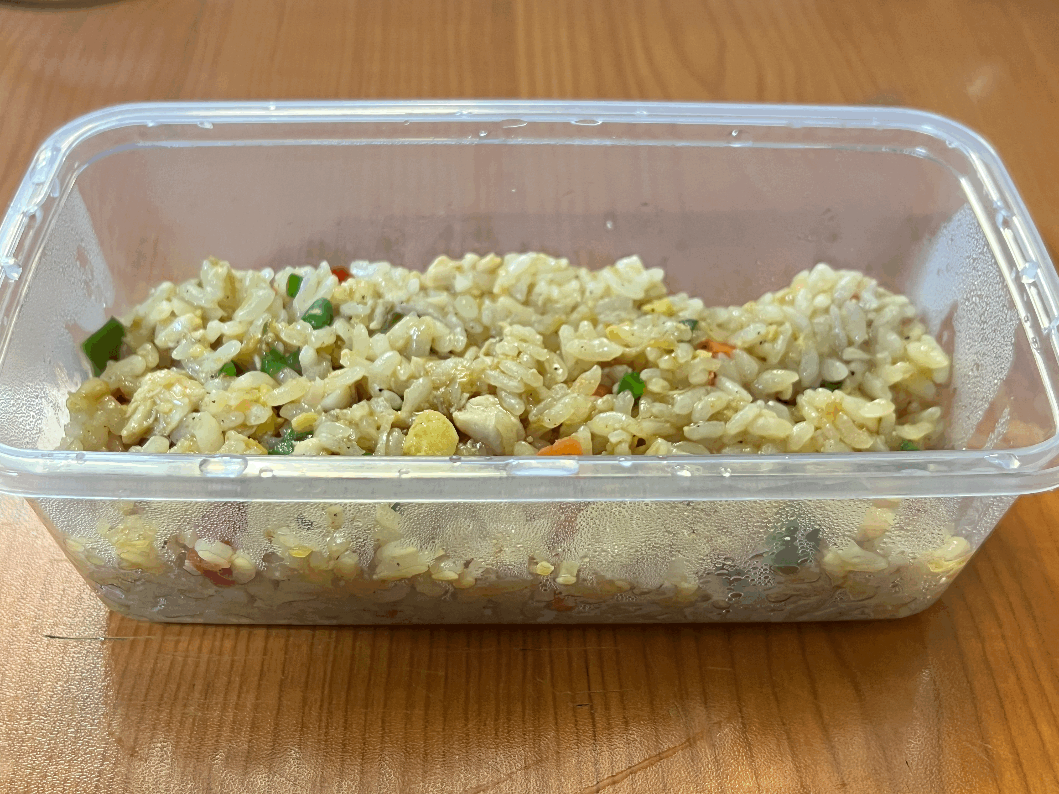 그래도 밥알의 상태를 보니까 꽤 고슬고슬하니 괜찮습니다. 닭고기만 많은 게 아니라 채소의 색깔도 많이 보이는 게 제대로 된 볶음밥 같아 보입니다. 그래서 일단 비주얼은 합격(양은 불합격)이라고 생각해서 한 숟가락 푹 퍼서 먹어 봤습니다.(입 천정 벗겨지는 줄 알았습니다)