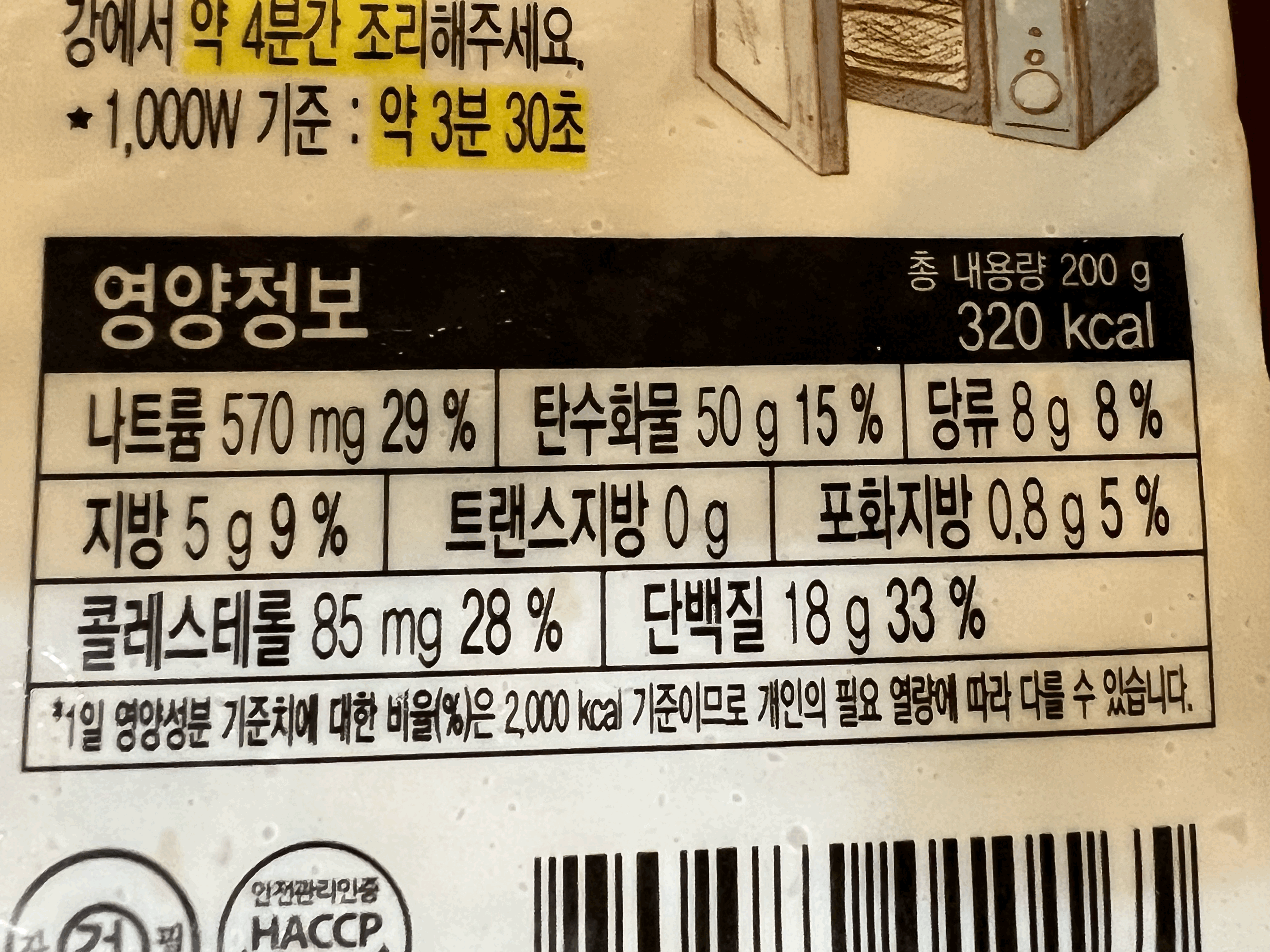 굽네 갈비천왕 치밥은 200그램이고 그 중 국산쌀 35.71%, 닭가슴살 20.16%가 들어 있다고 합니다. 소스가 17.07%나 들어 있는데, 닭가슴살이 의외로 많이 들어 있는 것 같아 놀랐습니다. 전체 중량의 20%면 약 40그램 남짓 들어 있는 셈이잖아요? 중량 대비 괜찮은 것 같습니다. 그 옆을 보면 가정용 전자렌지에 4분 돌리라고 써 있네요.