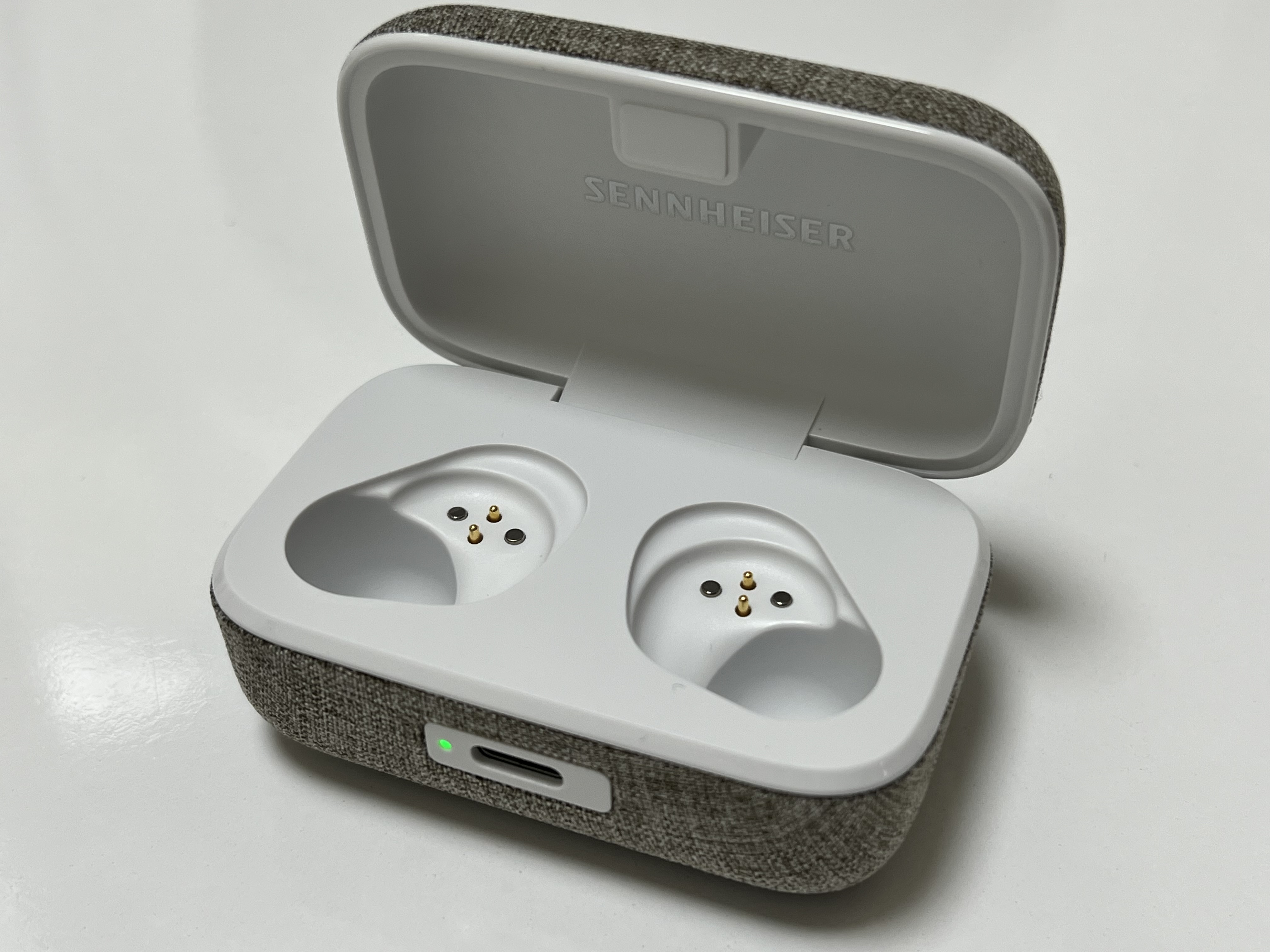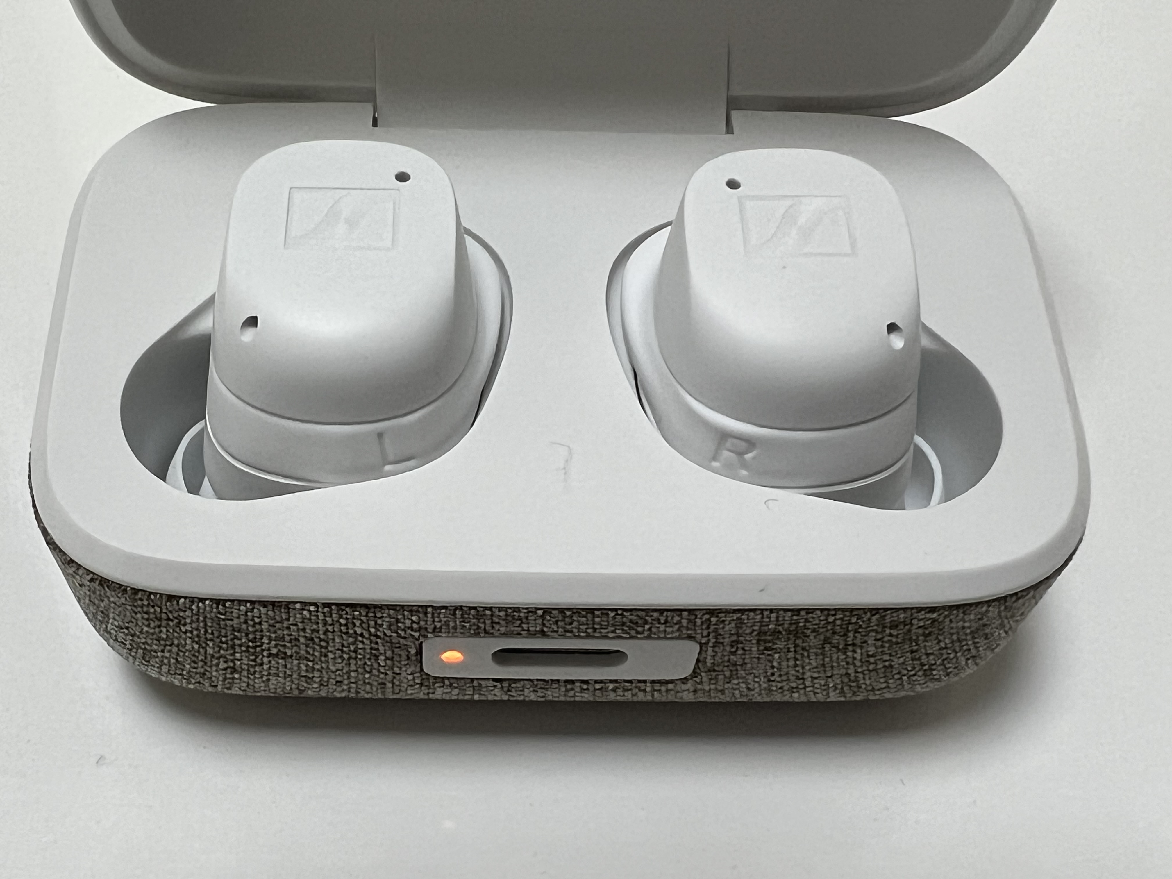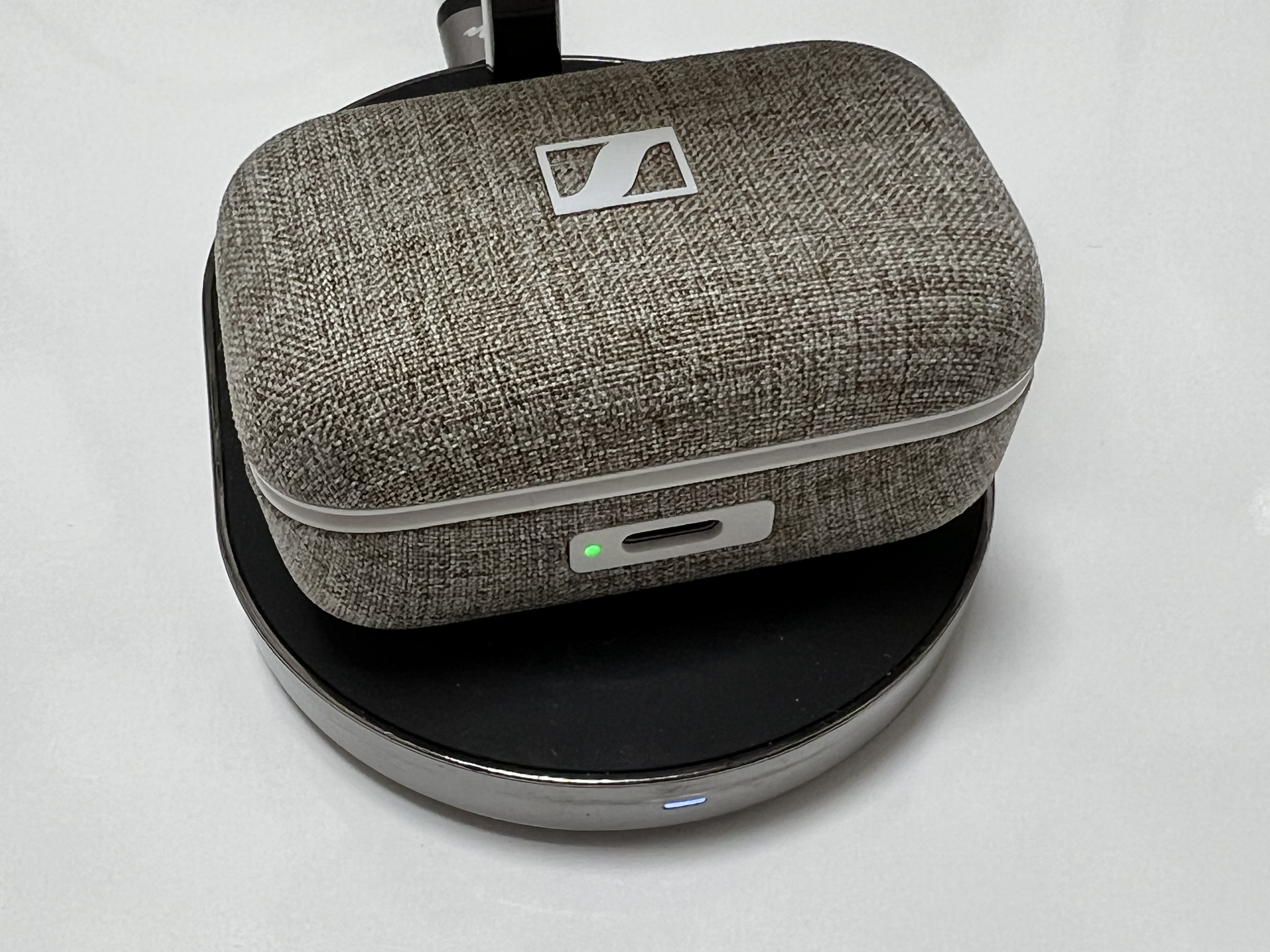 젠하이저 MTW3의 충전단자는 특이하게도 제품의 앞면에 있습니다. 에어팟 시리즈의 경우 아래쪽, 다른 대부분의 이어폰 본체는 뒤쪽에 자리하고 있는데 얘는 앞에 달려 있습니다. USB C 단자 옆에는 충전중 여부를 알 수 있는 LED가 있고요.