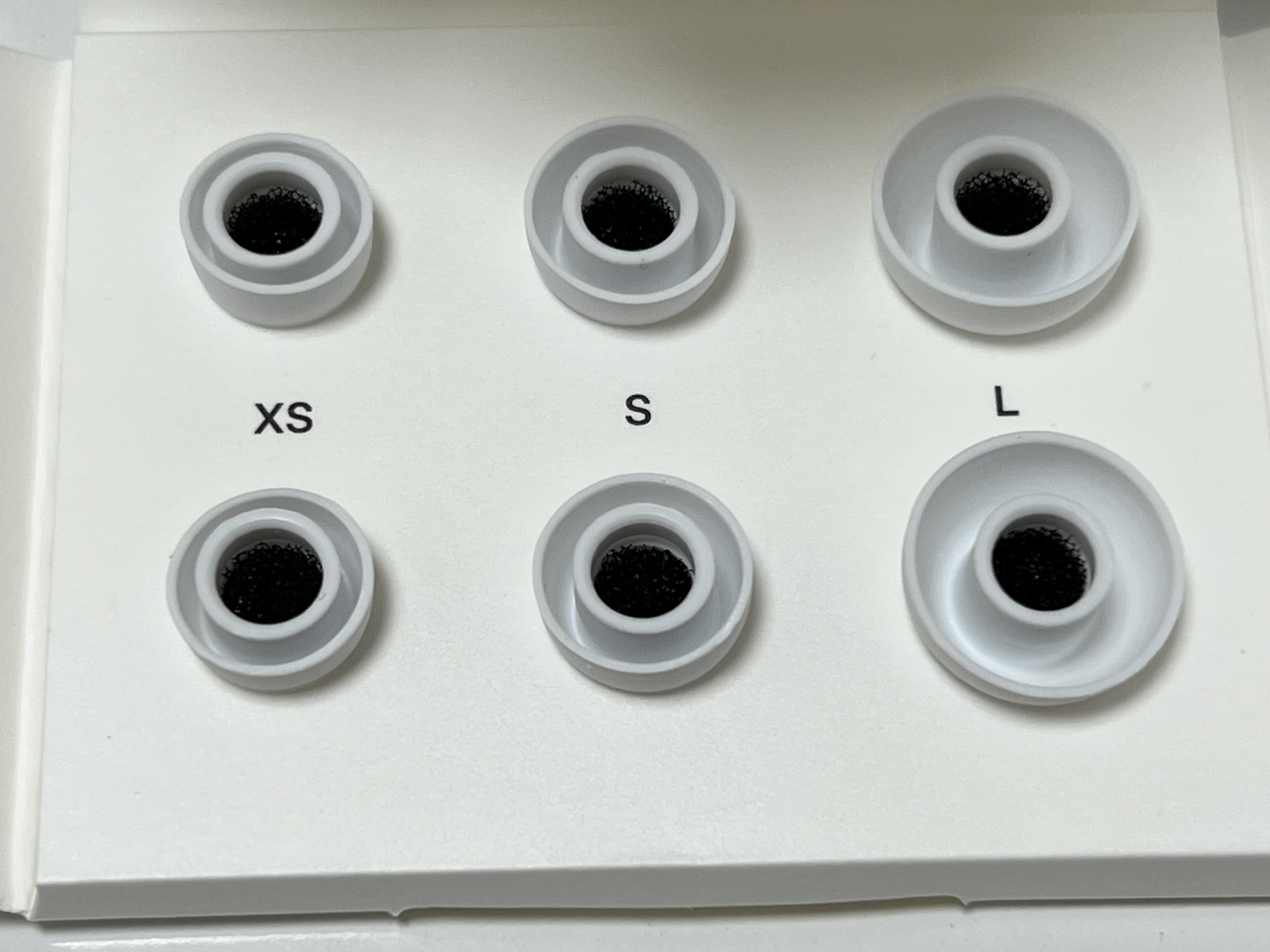 박스 안에는 이어윙 2세트, 이어팁 3세트가 들어 있습니다. 기본적으로 한 세트씩이 기본 이어버즈에 장착이 되어 있는 만큼 이어윙은 총 3세트, 이어팁은 4세트가 들어 있는 거죠. 이어팁의 사이즈는 XS, S, M, L 입니다. 기본은 M이 장착되어 있습니다.