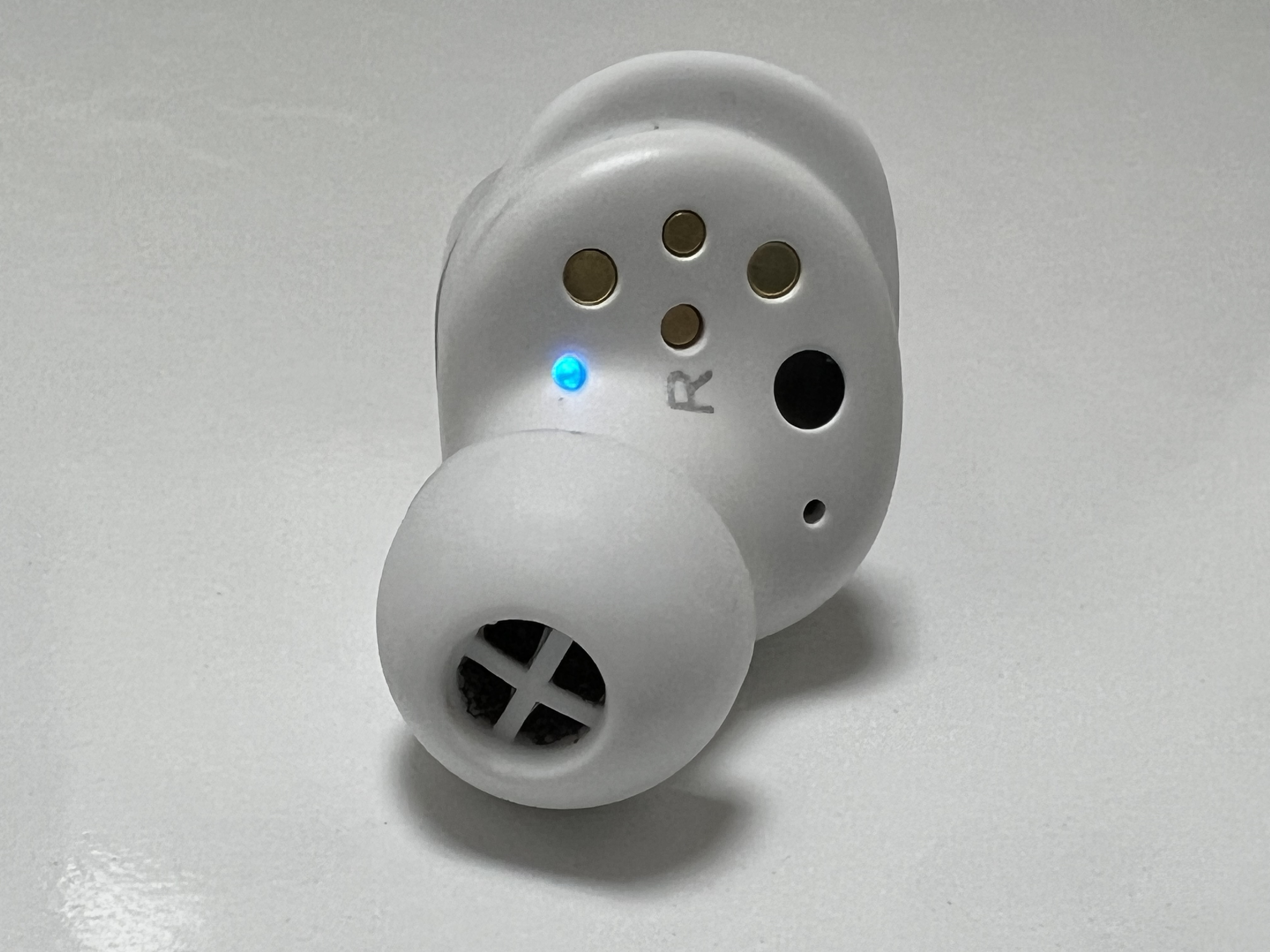 젠하이저 MTW3 이어버즈는 다소 길쭉한 디자인입니다. 그로 인해 제품의 착용감이 썩 좋다고 느껴지진 않습니다. 앞에서 보더라도 귀에서 약간 튀어나오는 편입니다. 이어윙은 리버티3 프로처럼 큼직하지는 않고 제공되는 3개 사이즈의 모양이 크게 다르지 않습니다. 미세한 차이만 있습니다. 충전단자 옆쪽으로 착용감지 센서(큰 검은색 원)와 이압을 줄여 주는 벤트홀(작은 구멍) 이 보입니다.