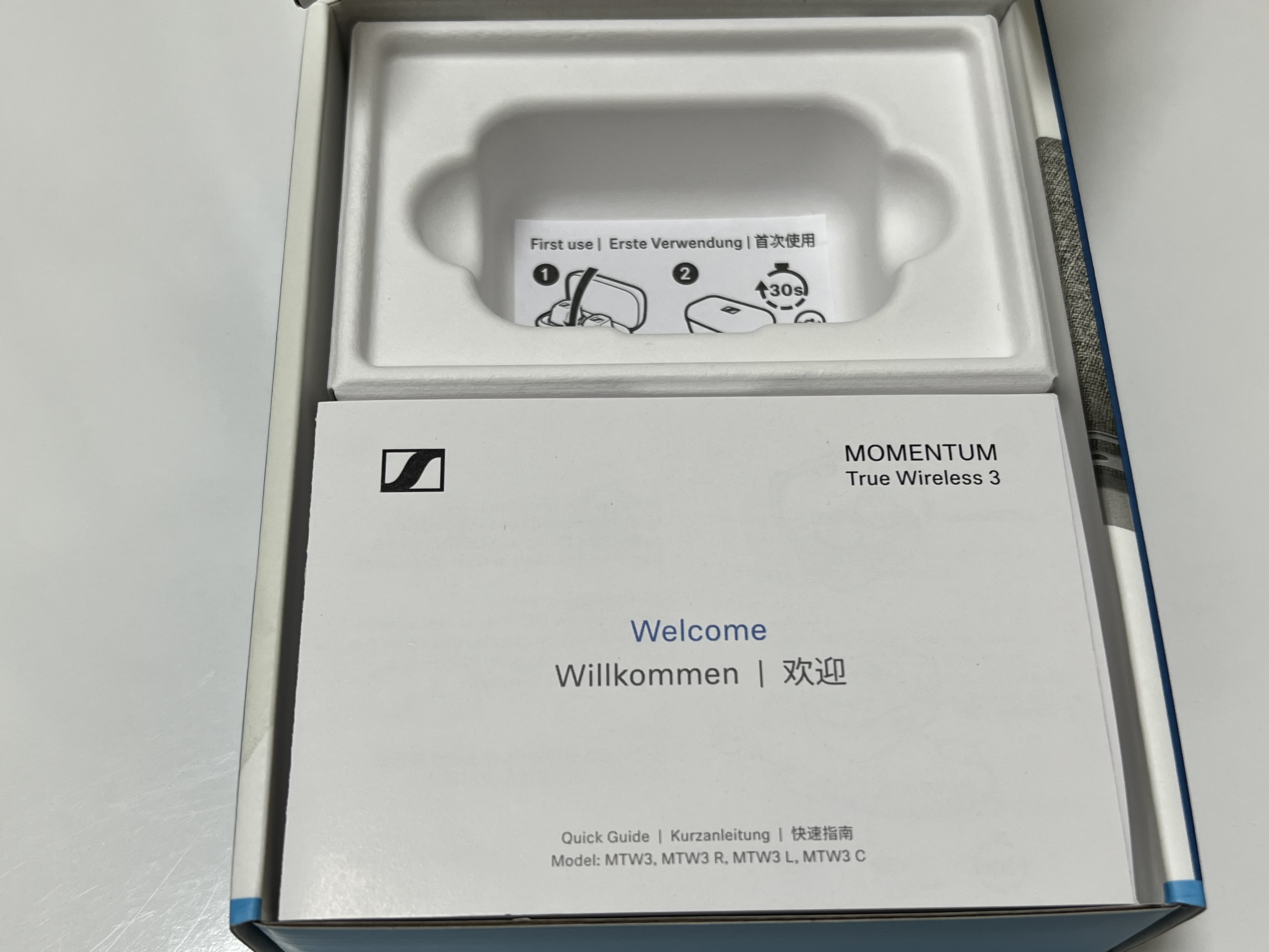 젠하이저 MTW3의 박스를 열어 보면 상단에 이어폰 본체가 들어 있고 아래쪽에는 각종 부자재가 들어 있습니다. 본체는 파손의 염려가 없도록 제법 안정적인 틀에 쏘옥 들어가게 포장이 되어 있습니다. 본체를 들어 보면 이어버즈를 활성화시키려면 제품의 뚜껑을 열었다 닫고 충전 케이블을 30초 정도 연결해 놓으라고 설명하는 쪽지가 들어 있습니다.