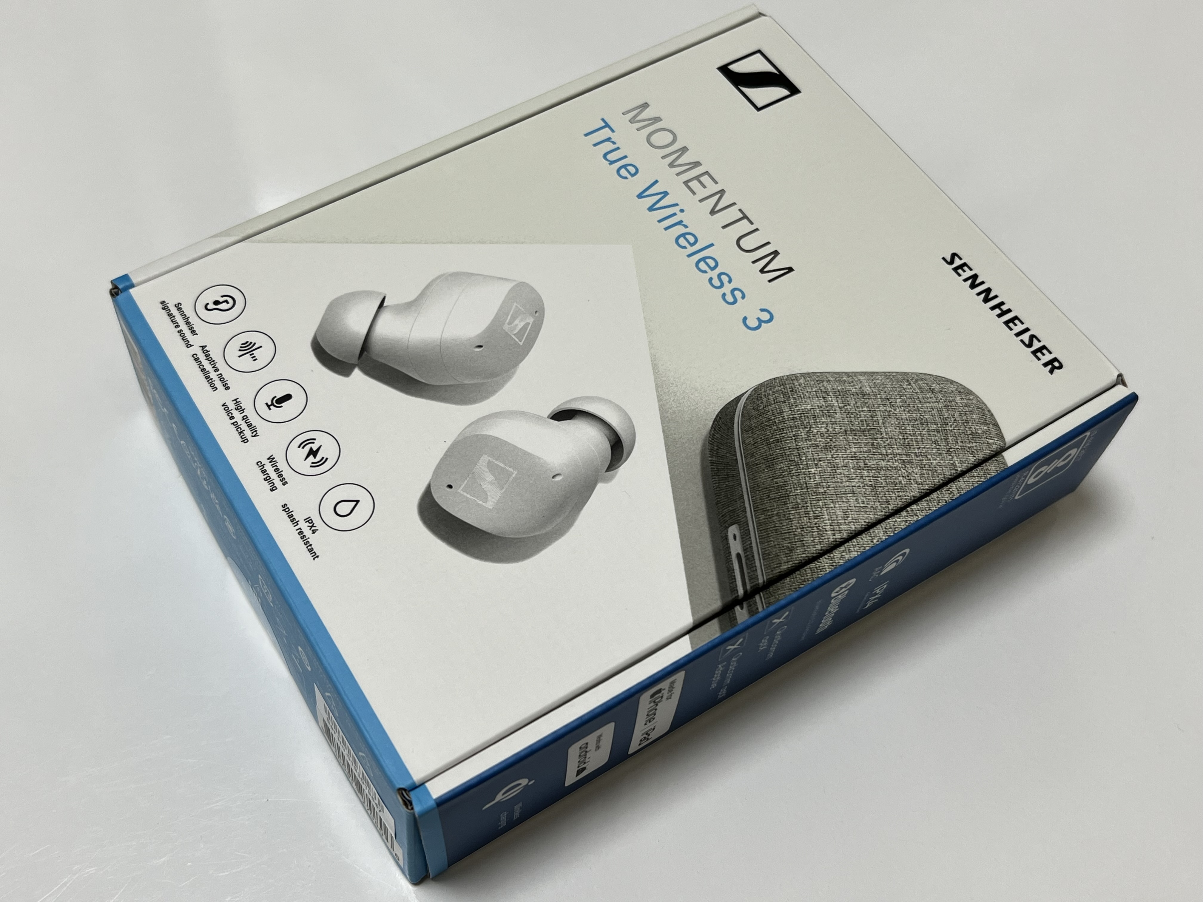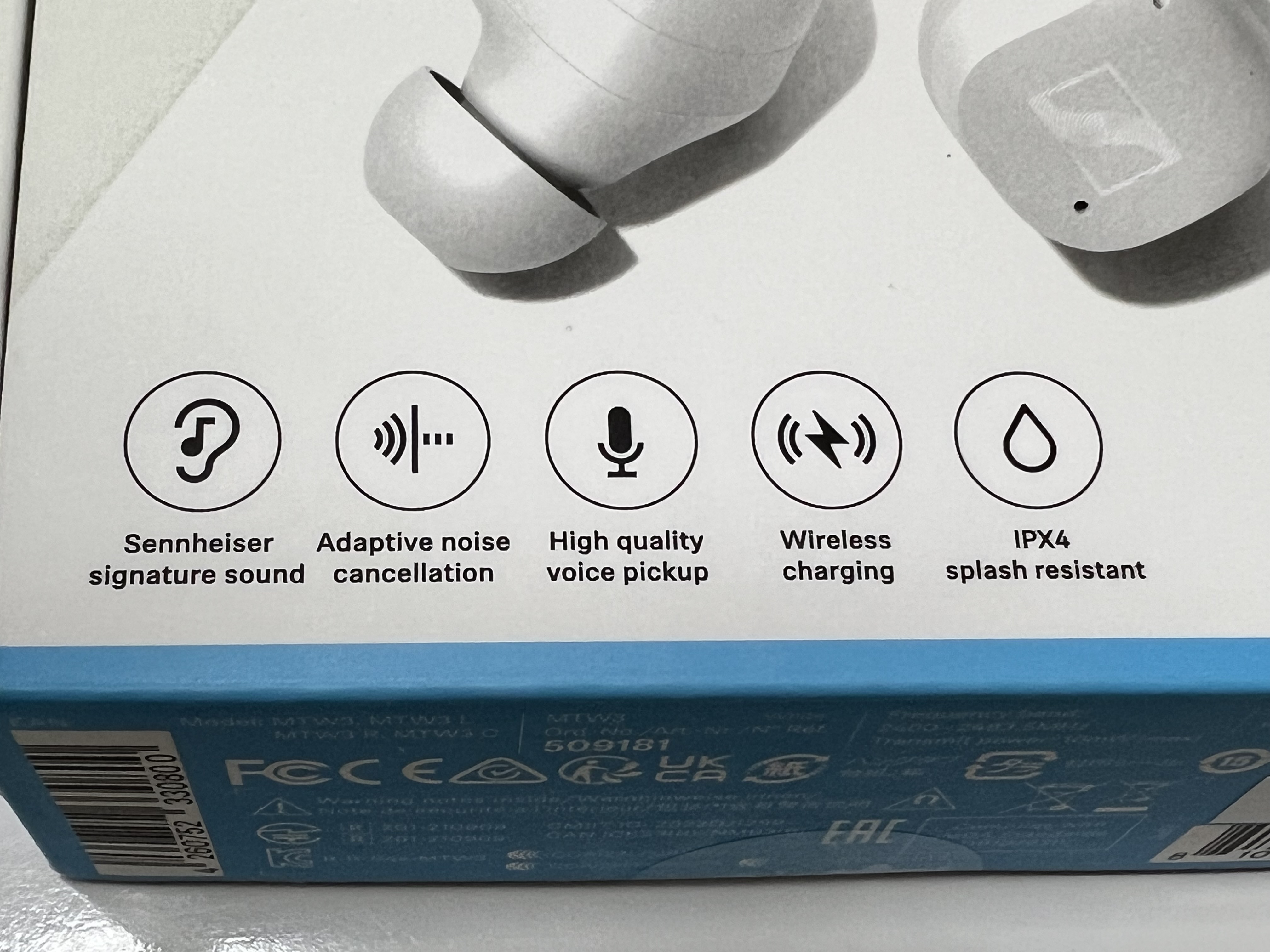 젠하이저 MTW3 박스 하단에 보면 여러 기능이 표시되어 있습니다. 가장 앞에는 젠하이저 시그니처 사운드를 내세우고 있네요. 젠하이저 고유의 사운드를 내주고 있다는 뜻이겠지요. 그리고 어댑티드 노이즈 캔슬레이션, 고음질 음성 픽업?(아마도 음성 인식 기능을 얘기하는 모양입니다), 무선 충전, IPX4등급의 방수등급에 대해서 써 있습니다. 기능은 특별할 게 없어 보입니다. 왜냐면 요즘은 10만원 이하 제품에서도 저런 것들을 지원하는 경우가 많거든요. 다만 그것을 얼마나 '잘' 구현하느냐의 문제겠지요.