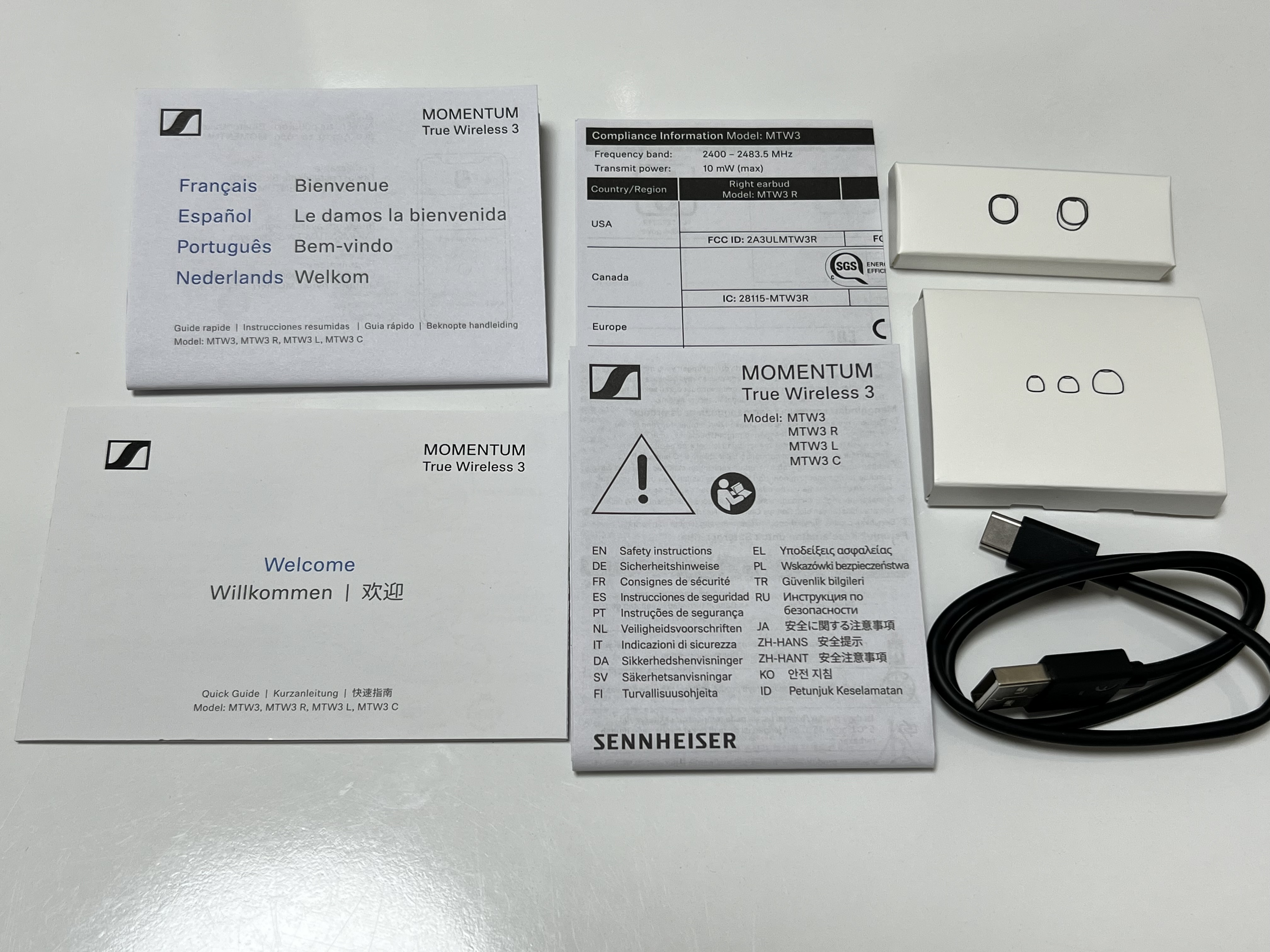 젠하이저 MTW3의 구성품에는 이어윙, 이어팁, USB A to C 케이블, 안전지침, 퀵가이드와 매뉴얼이 들어 있습니다. 매뉴얼은 여러 언어로 되어 있는데 실질적으로 한글화가 부실하기 때문에 그냥 그림을 보고 이해하는 편이 좋습니다. 혹은 다른 이어폰의 앱을 사용한 분들은 크게 어려움 없이 사용할 수 있기 때문에 굳이 매뉴얼을 자세히 볼 필요는 없을 것 같습니다. 다만 첫번째 페어링 과정만 살펴 보면 됩니다.