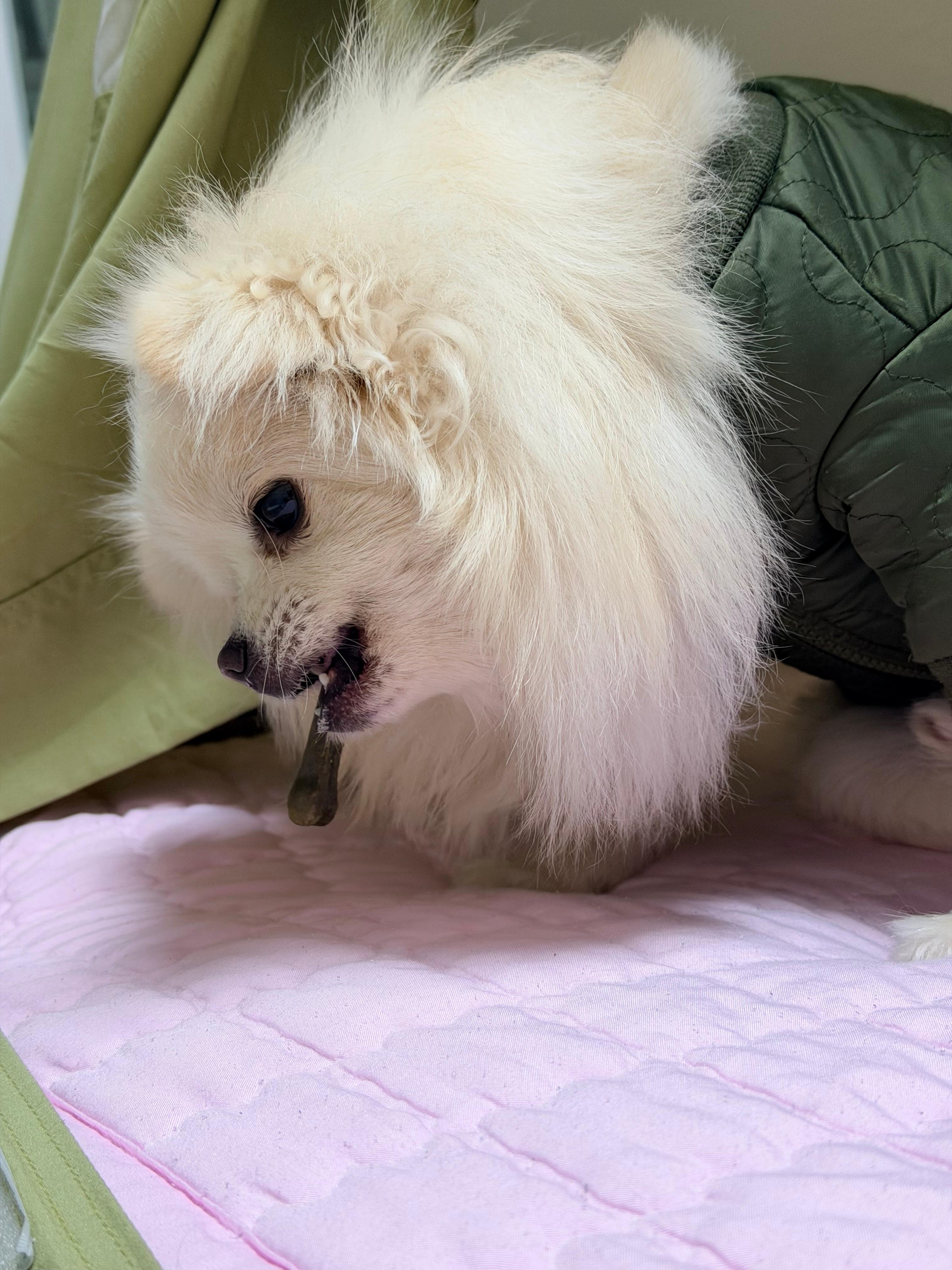 밥풀이는 공복을 못 참아하는 편입니다. 공복이 길어지면 구토를 하기도 해서 어쩔 수 없이 하루 세 번에 걸쳐 밥을 소량씩 나누어 급식을 하고 있습니다. 아침 저녁은 많이 주는 편이고, 점심은 사료를 적게 주면서 그리니즈 개껌을 하나씩 주고 있습니다. 처음과 다르게 그리니즈 개껌을 아주 잘 먹습니다.