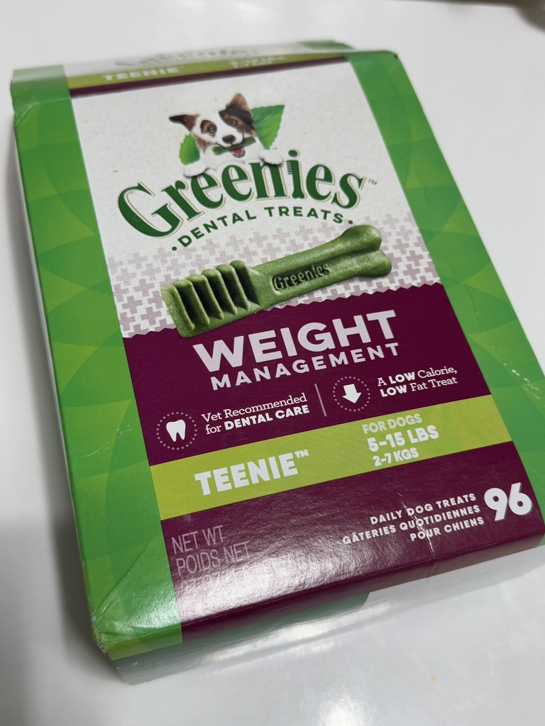 워낙 식탐이 강한 아이여서 다이어트를 하는 게 늘 미안하고 죄책감을 저에게 주곤 합니다. 그래서 사료도 다이어트 사료를 동물병원에서 사다가 먹이고, 간식도 가급적 살이 안 찌는 것 위주로 주고 있습니다. 그 중 오늘 알아 볼 것은 그리니즈 체중관리 덴탈껌입니다.