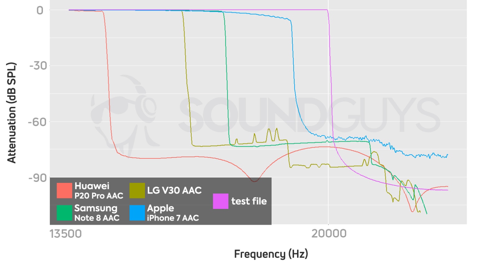 첫째, 고음질 코덱의 부재입니다. 갤럭시의 경우 LDAC 라는 높은 대역폭을 가지는 코덱을 지원합니다. LDAC 코덱 자체가 고음질을 보장하는 것은 아니지만, 일단 대역폭이 넓으니 그 만큼 전송할 수 있는 데이터의 양이 많아지고, 그로 인해 AAC 코덱에서는 불가능한 18KHz 이상의 고주파 영역도 전송이 가능합니다. 가청주파수 끝쪽에 있는 영역이기 때문에 그 주파수 대에 의미있는 소리가 재생이 되느냐 여부는 일단 제쳐 두더라도 되는 것과 되지 않는 건 분명 차이가 있으니까요.