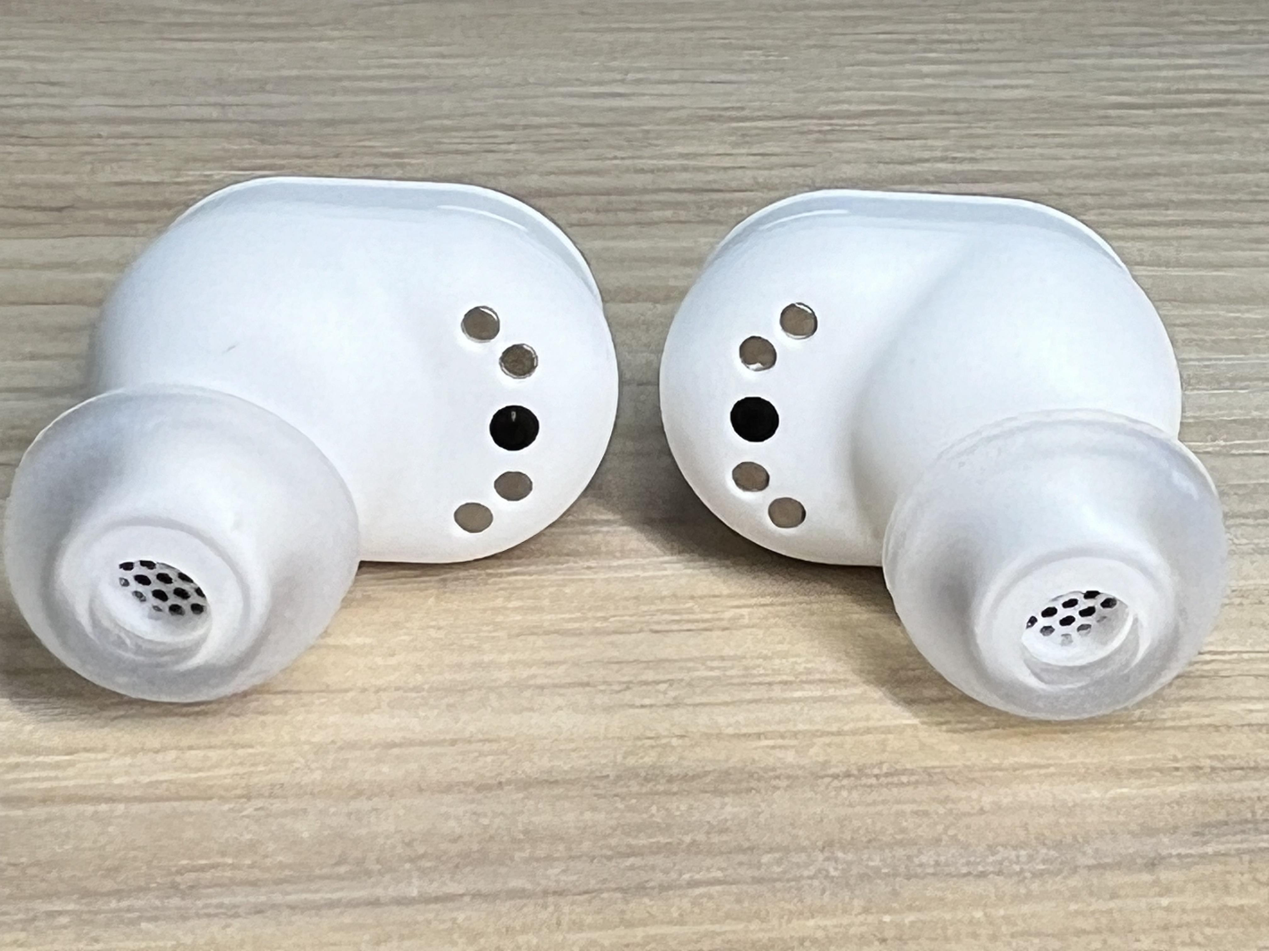 뚜껑은 열면 예상보다 작은 크기의 이어버즈가 나란히 꽂혀 있습니다. 이어버즈의 무게는 6그램으로 여타의 다른 제품들과 크게 차이가 나지 않습니다. 에어팟 프로2의 이어버즈 무게는 5.3그램으로 약 10% 정도 더 가볍습니다.