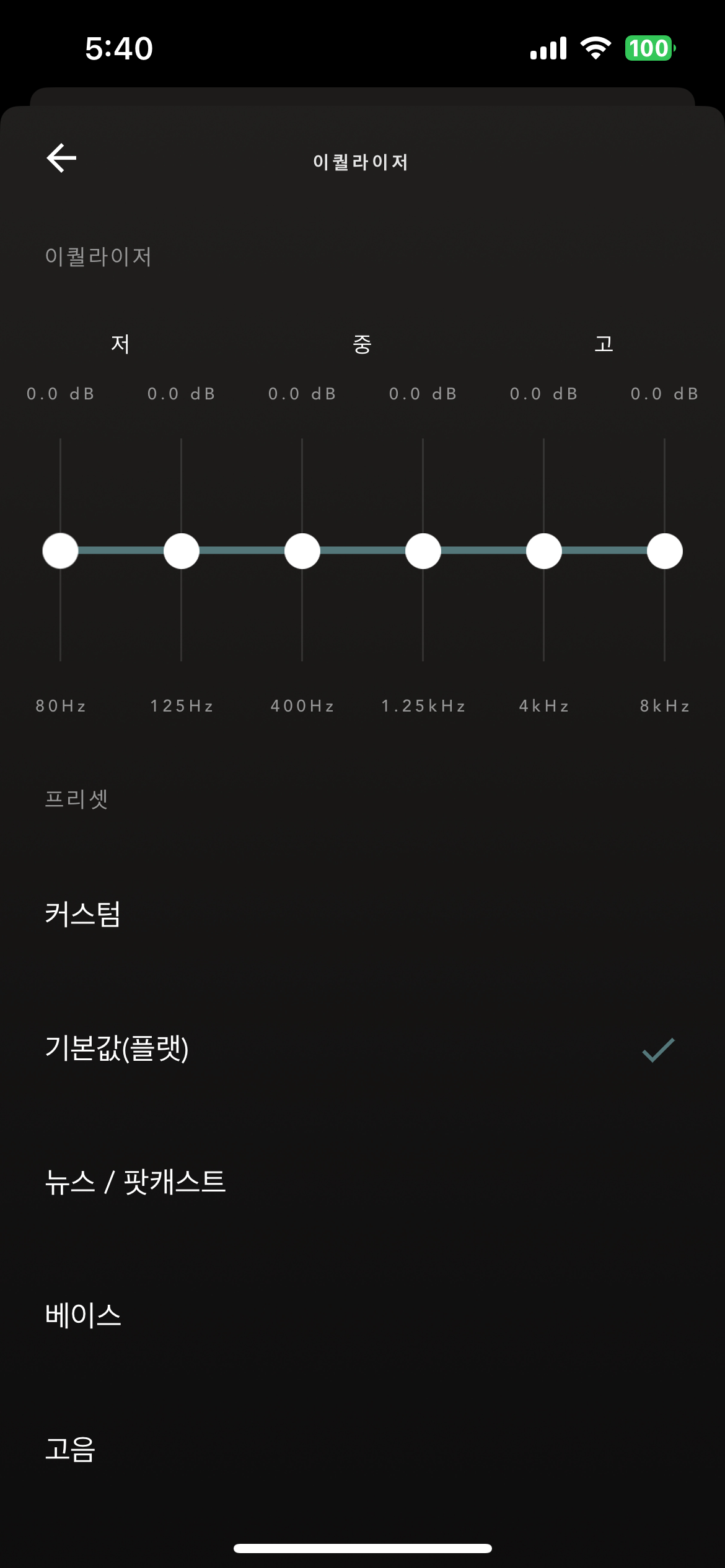 어쩌면 가장 중요할 수도 있는 이퀄라이저는 6밴드짜리입니다. 저는 기본값인 플랫 모드로 쓰고 있지만, 베이스를 강조하거나 고음을 강조하는 등의 커스텀이 가능합니다. 저는 치찰음 영역이 귀에 살짝살짝 걸리는 부분이 있어서 나중에라도 8KHz 영역을 다소 낮추는 방식으로 조절해 볼 생각은 갖고 있습니다만, 그렇게 하지 않더라도 대단히 만족스런 소리를 들려 주고 있어서 만족합니다. 베이스와 보컬 영역은 충분하기 때문에 굳이 보컬 영역을 강조하는 늇/팟캐스트 모드나 저음역대를 보강하는 베이스 모드로 바꿀 필요는 없어 보입니다. 기본값이라곤 해도 충분히 펀사운드를 제공합니다.