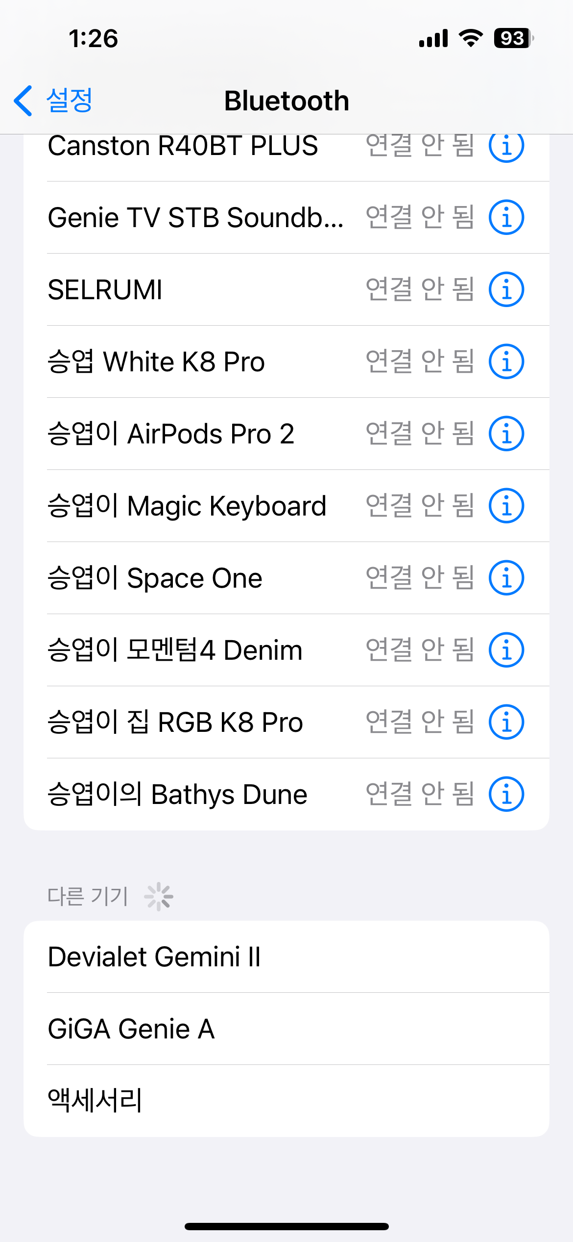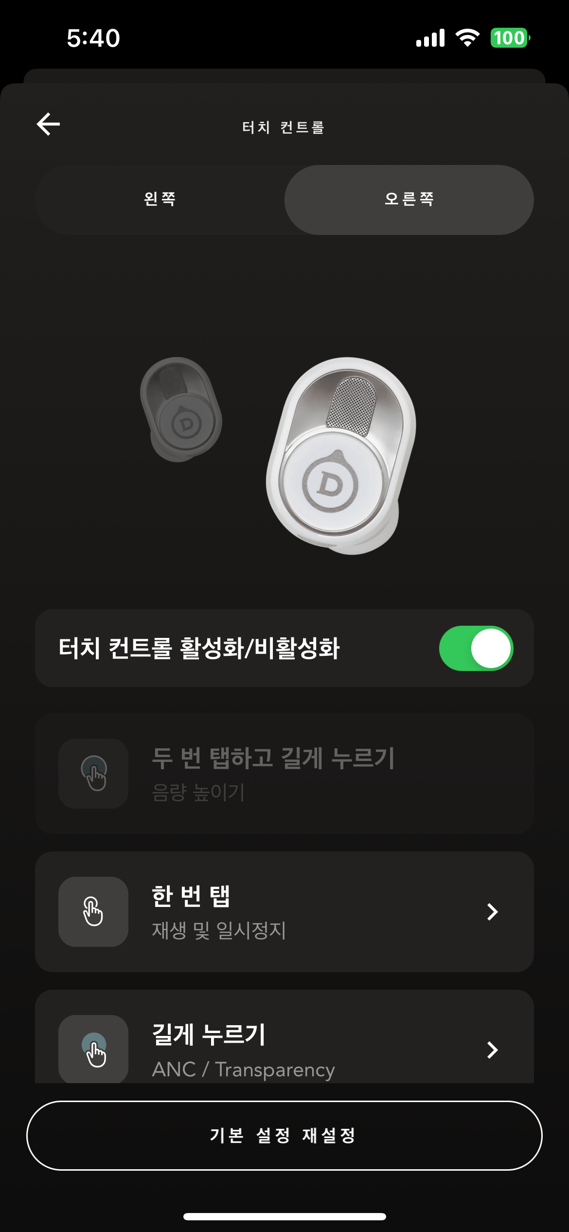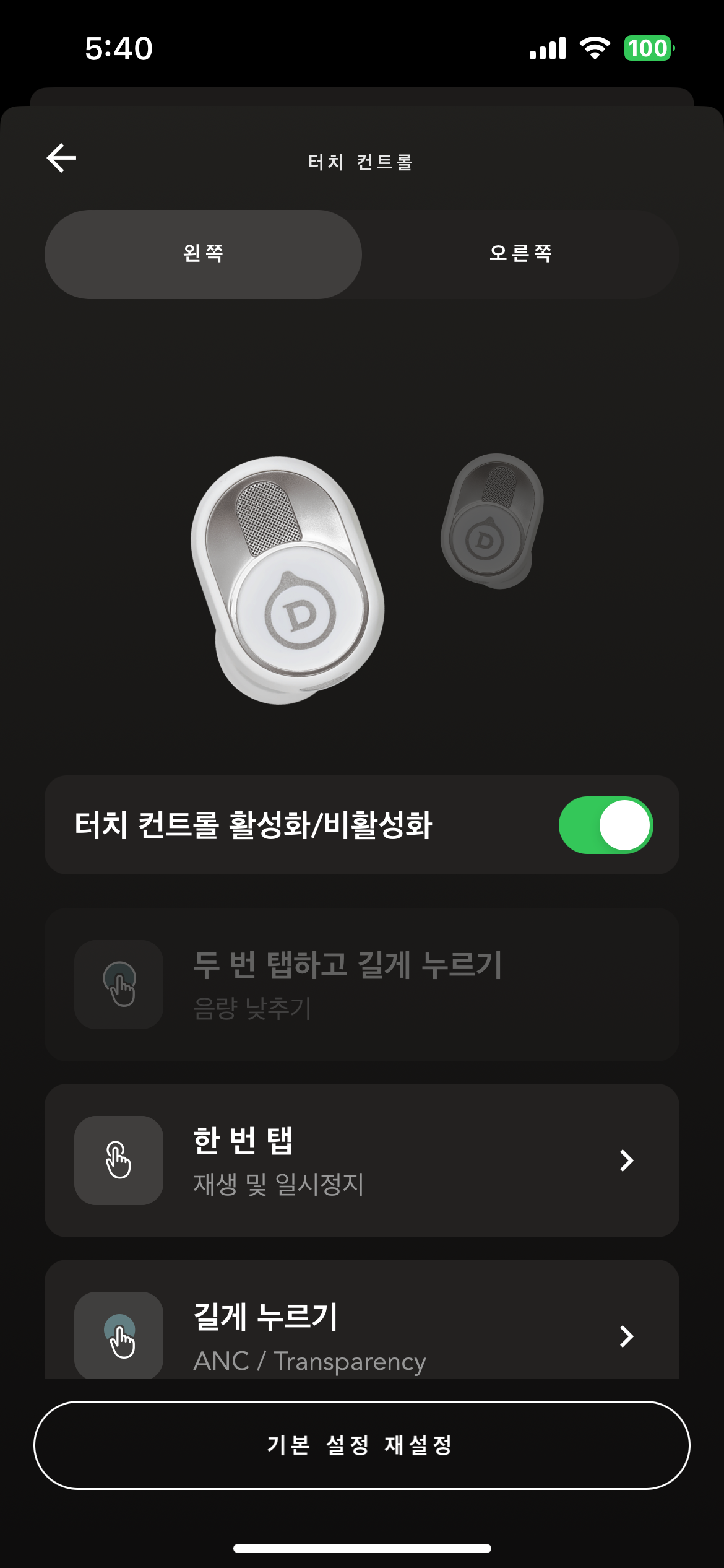 앱에 연결하면 본체와 좌우 배터리 잔량을 각각 볼 수 있습니다. 기존 제미니1의 가장 큰 고질적인 문제로 여겨졌던 것이 좌우 배터리 불균형 문제였습니다. 좌우 편차가 10%, 15%씩 나는 문제가 있어서 사용성에 있어서 큰 제약을 주었고, 사용자에게도 불만사항이었습니다. 그래서 저도 제품을 받자마자 음악을 들으면서 배터리 잔량을 테스트 해 봤습니다.