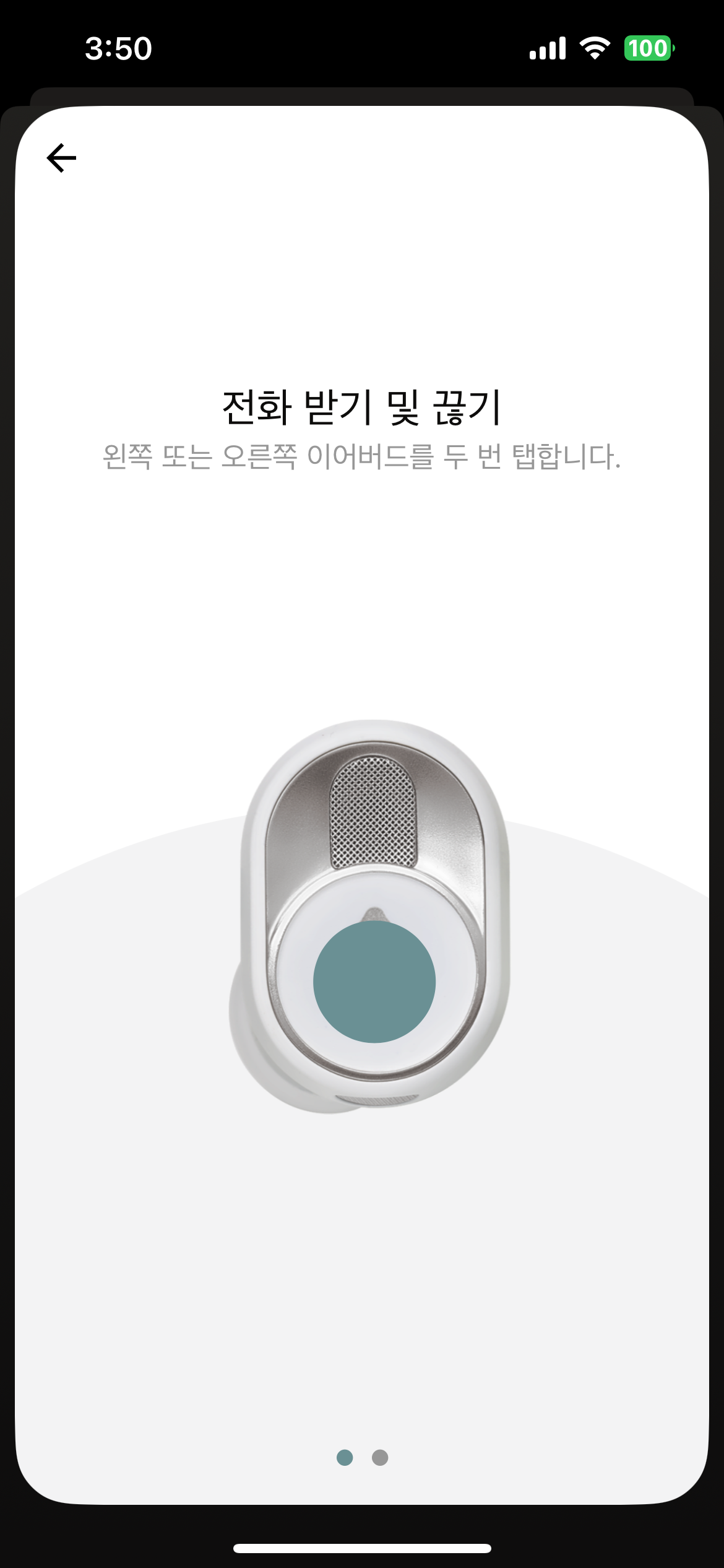 전화를 받을 때는 터치패널을 두 번 터치해 주고, 끊을 때도 마찬가지입니다. 수신거부 때는 터치패널을 길게 눌러 주면 됩니다. 그리고 이어폰의 정착용 화면을 볼 수 있는데 전화 수신과 정착용은 애니메이션으로 보여 주어 명시성을 높여 줍니다.
