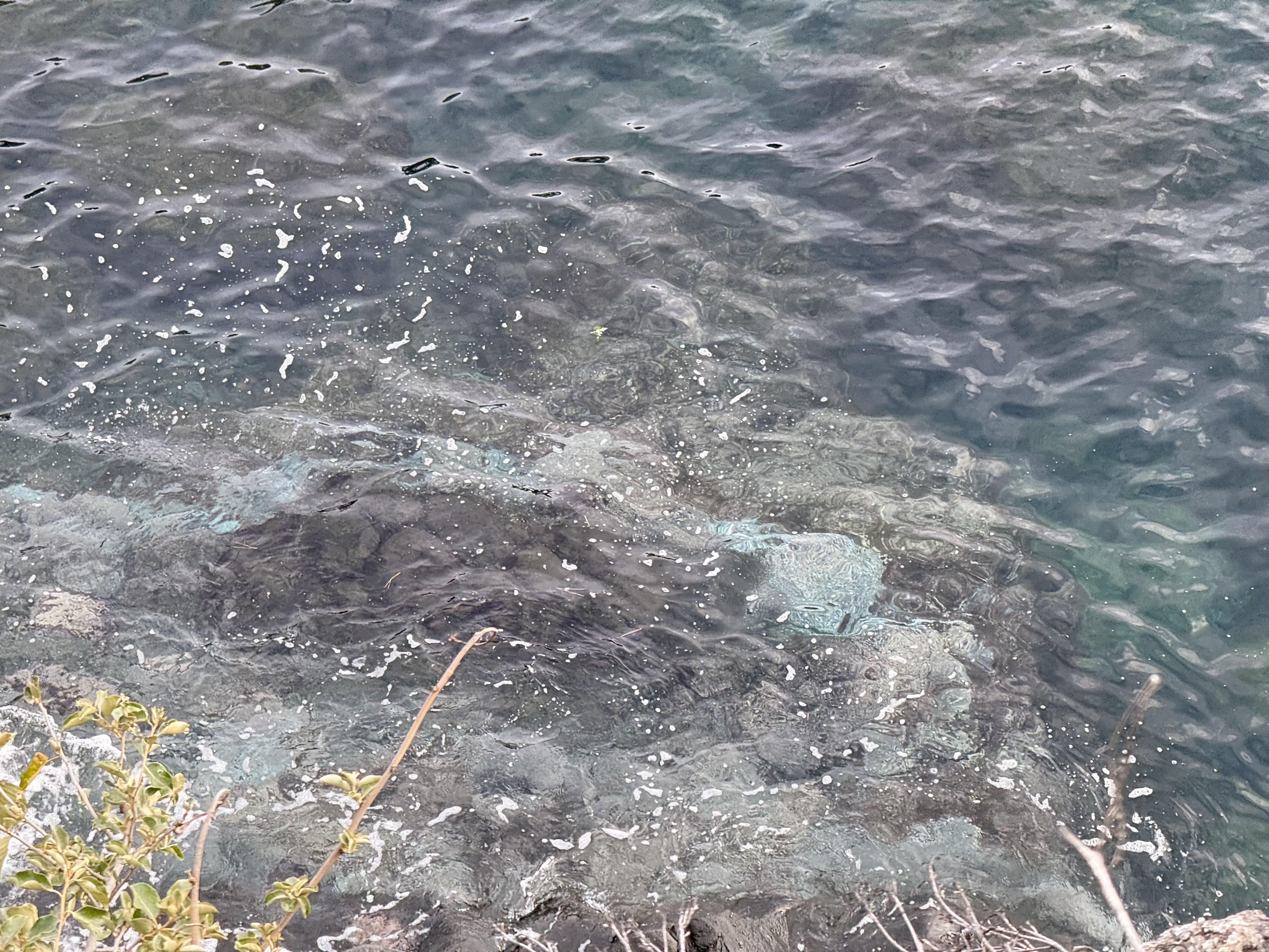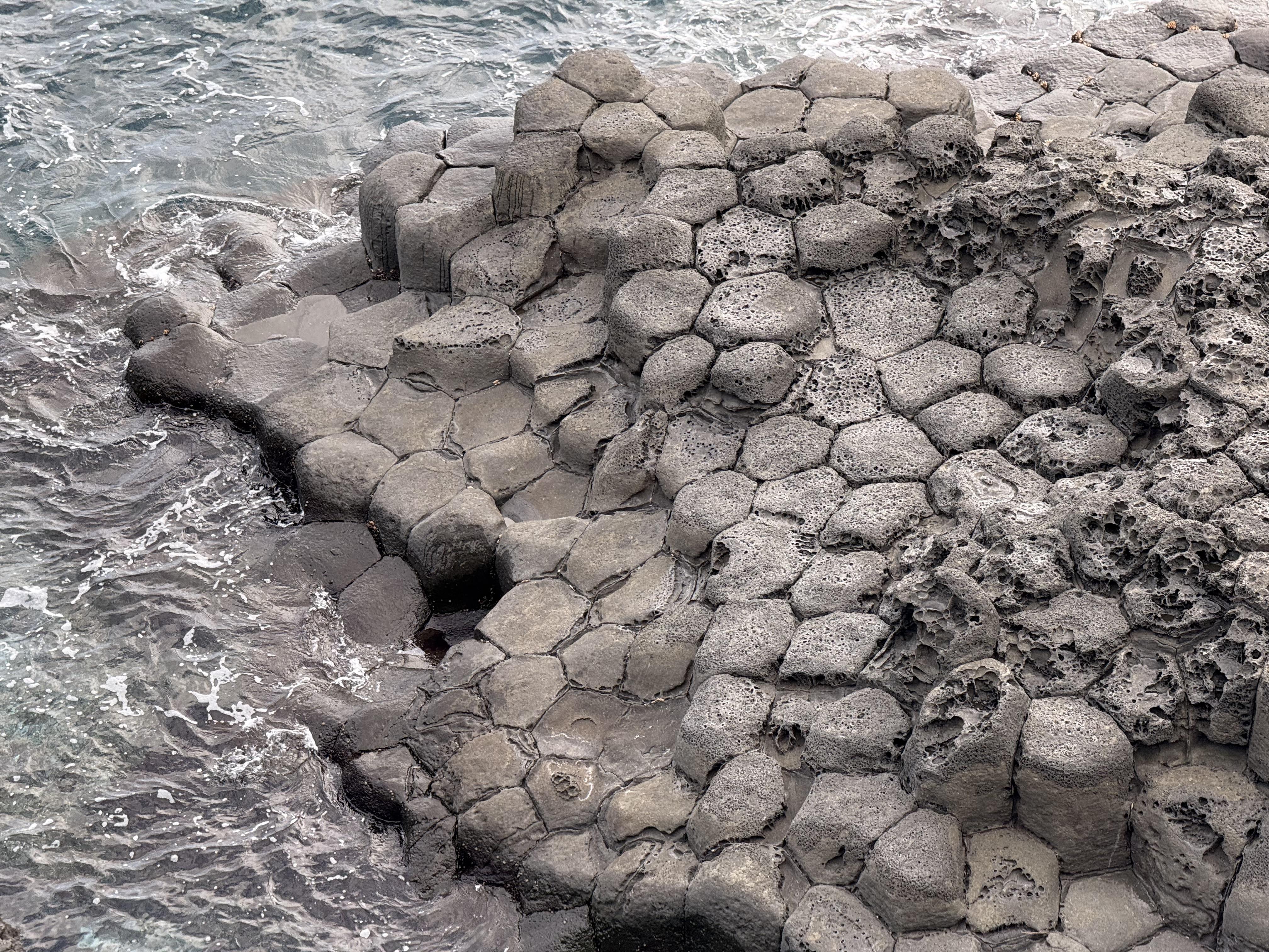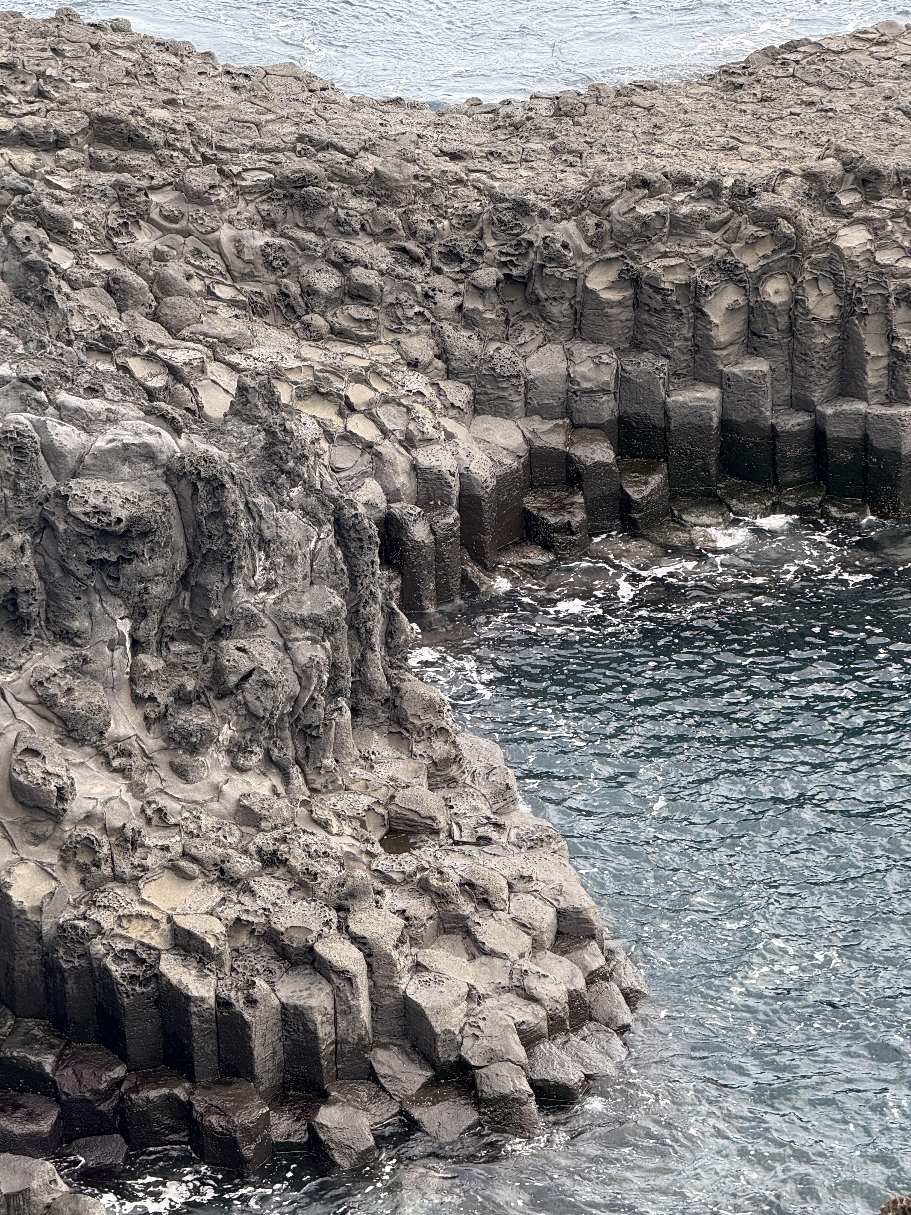 물이 맑아서 물 속에 있는 주상절리 바위가 어른어른 눈에 보이는데 바닷물의 파도 모양마저도 주상절리 모양인 것처럼 보여 더욱 신비롭습니다.