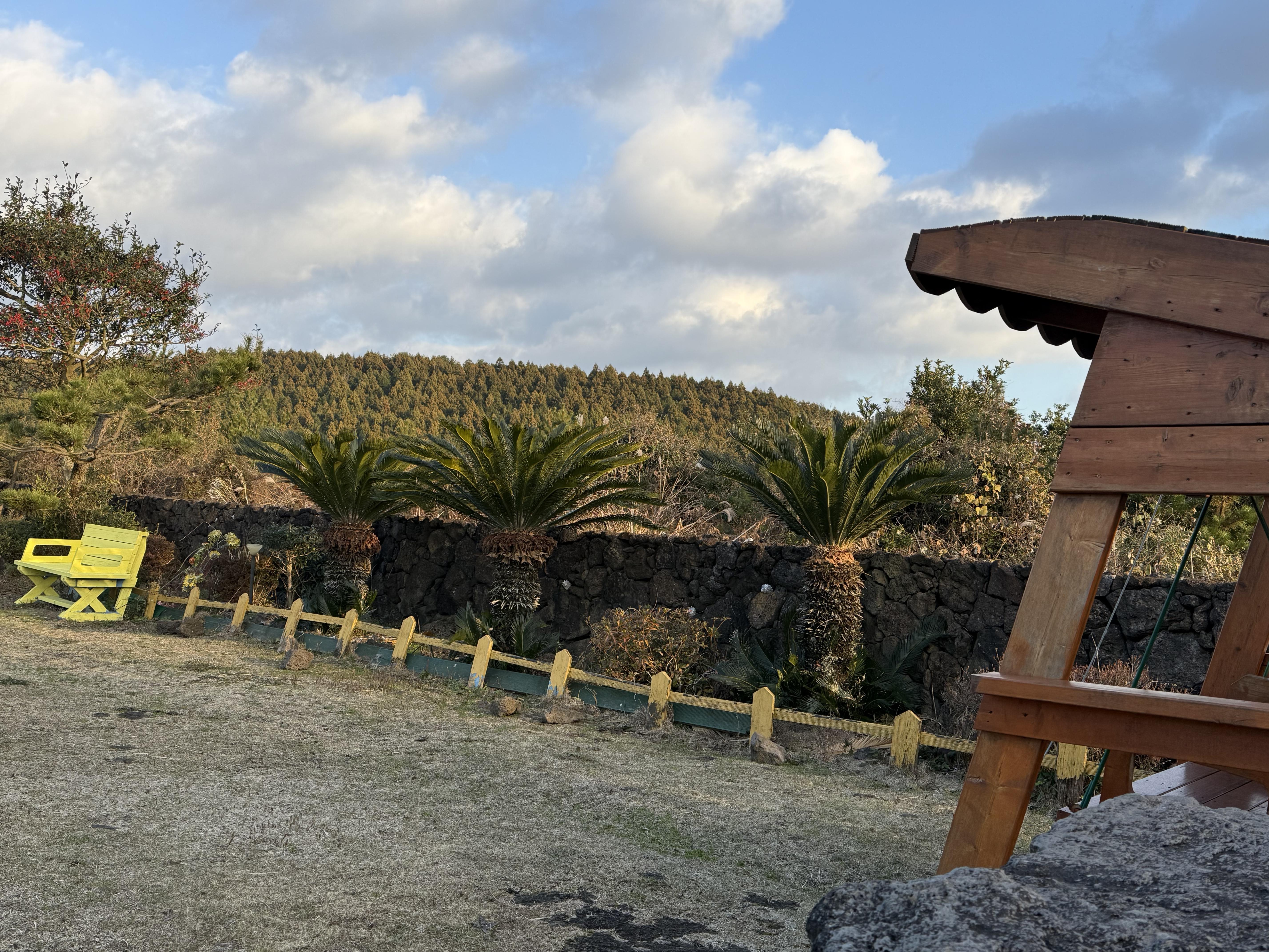 펜션 바로 옆에는 작은 오름이 있고, 펜션 내부에는 벤치와 그네벤치도 놓아져 있습니다. 주차장은 마당 바로 바깥쪽에 10대 정도는 가능한 걸로 보였습니다. 연말에 가까운 평일이어서 펜션에 주차된 차량은 저희 것밖에 없었지만 그래도 성수기에도 주차장이 부족할 일은 없을 것 같았습니다.