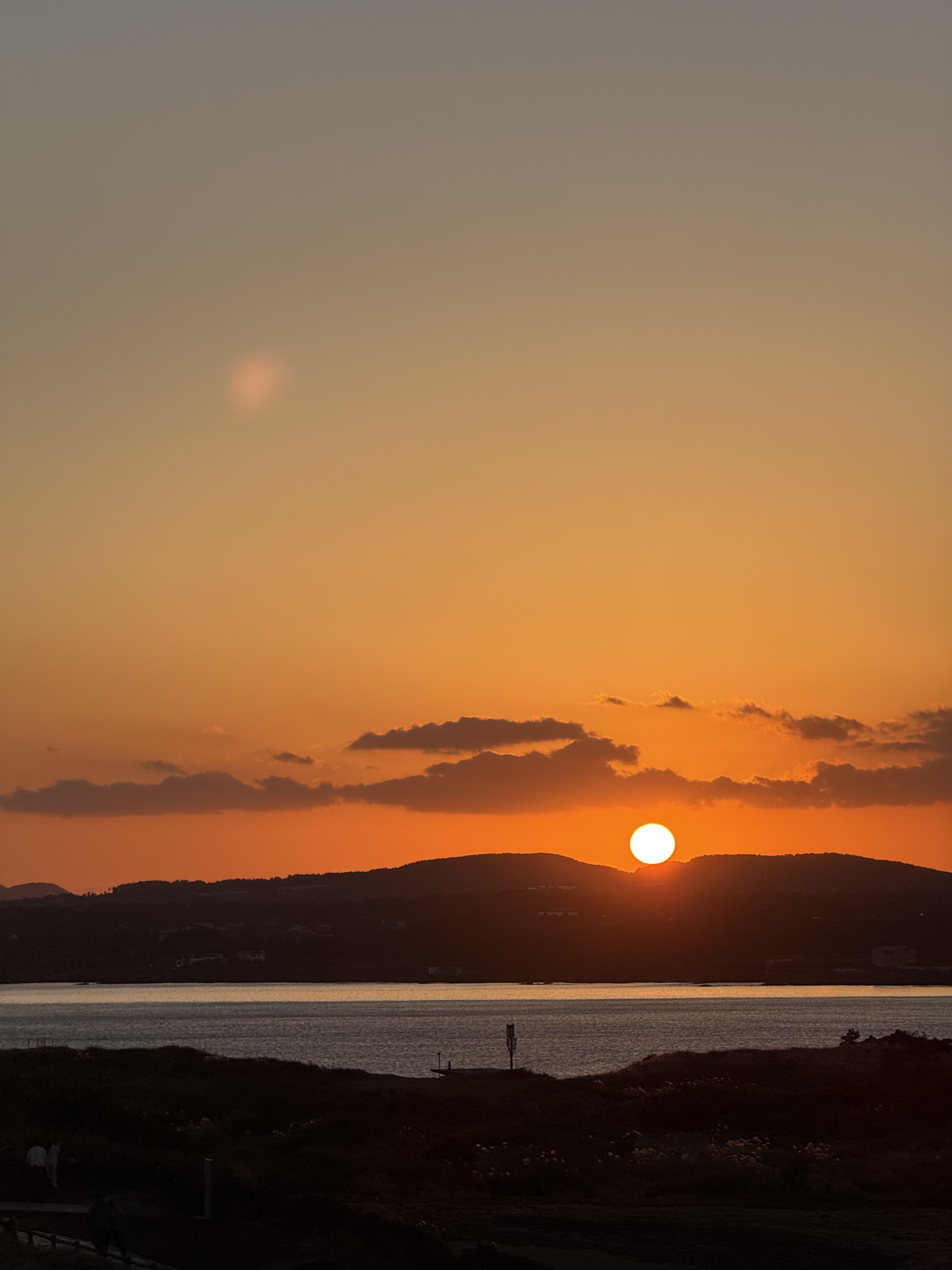 제주에서 바다로 떨어지는 일몰을 보기 위해서는 섬의 서쪽 방향의 바닷가에서 봐야겠지요. 일출을 동쪽에서 봐야 하는 것처럼요. 하지만 섭지코지에서 한라산 방향으로 떨어지는 일몰을 보는 것도 색다른 경험이긴 했습니다. 물론 땅으로 떨어지는 일몰은 굳이 제주까지 오지 않더라도 얼마든지 볼 수 있긴 합니다. 심지어 서울 하늘 아래에서도 말이죠. 하지만 제주에서 한라산을 바라보면서 해가 땅밑으로 꺼져 가는 순간을 사랑하는 사람과 함께 바라 보는 건 그 자체로 꽤 기억에 오래 남는 경험이긴 했습니다.
