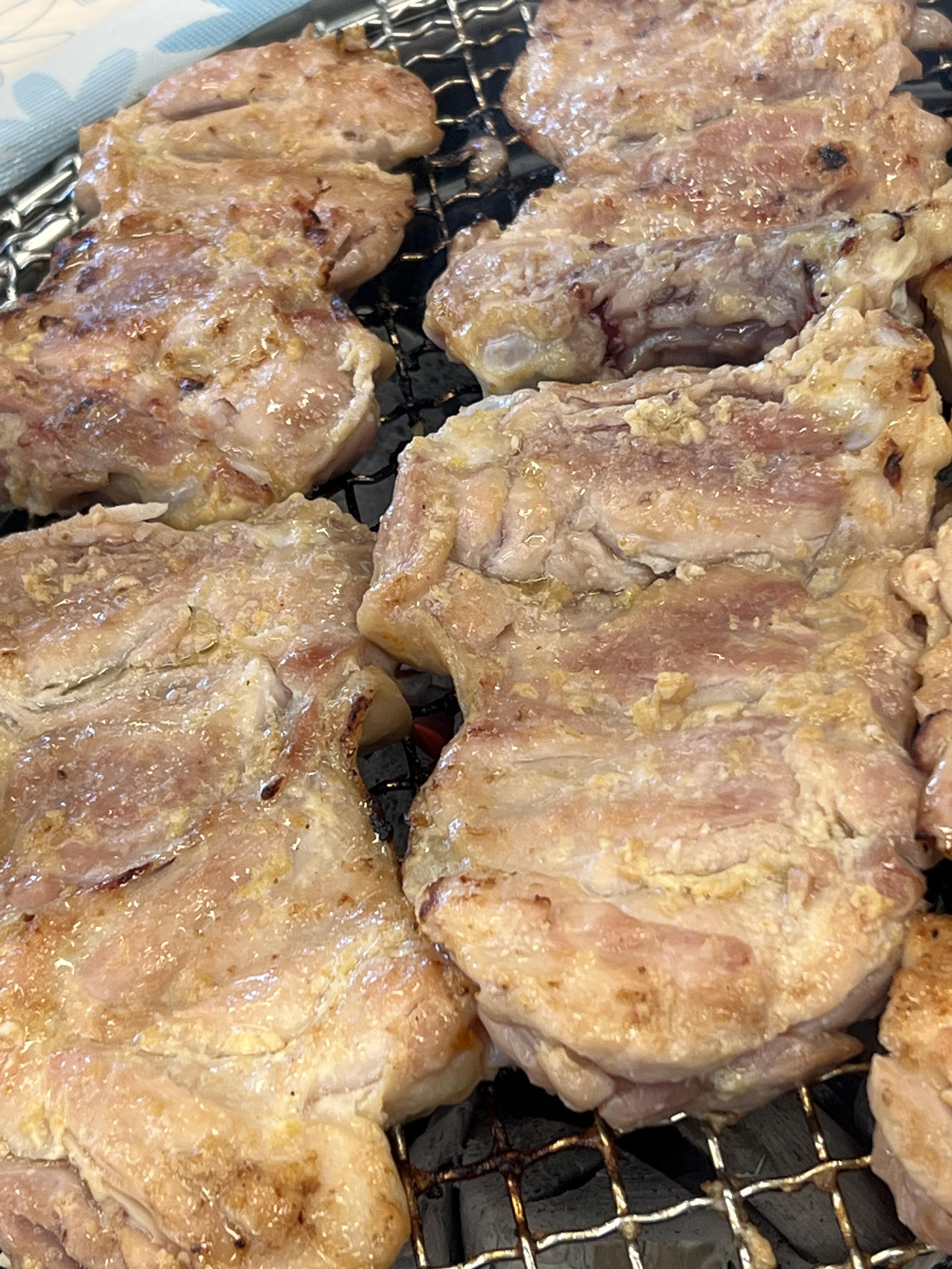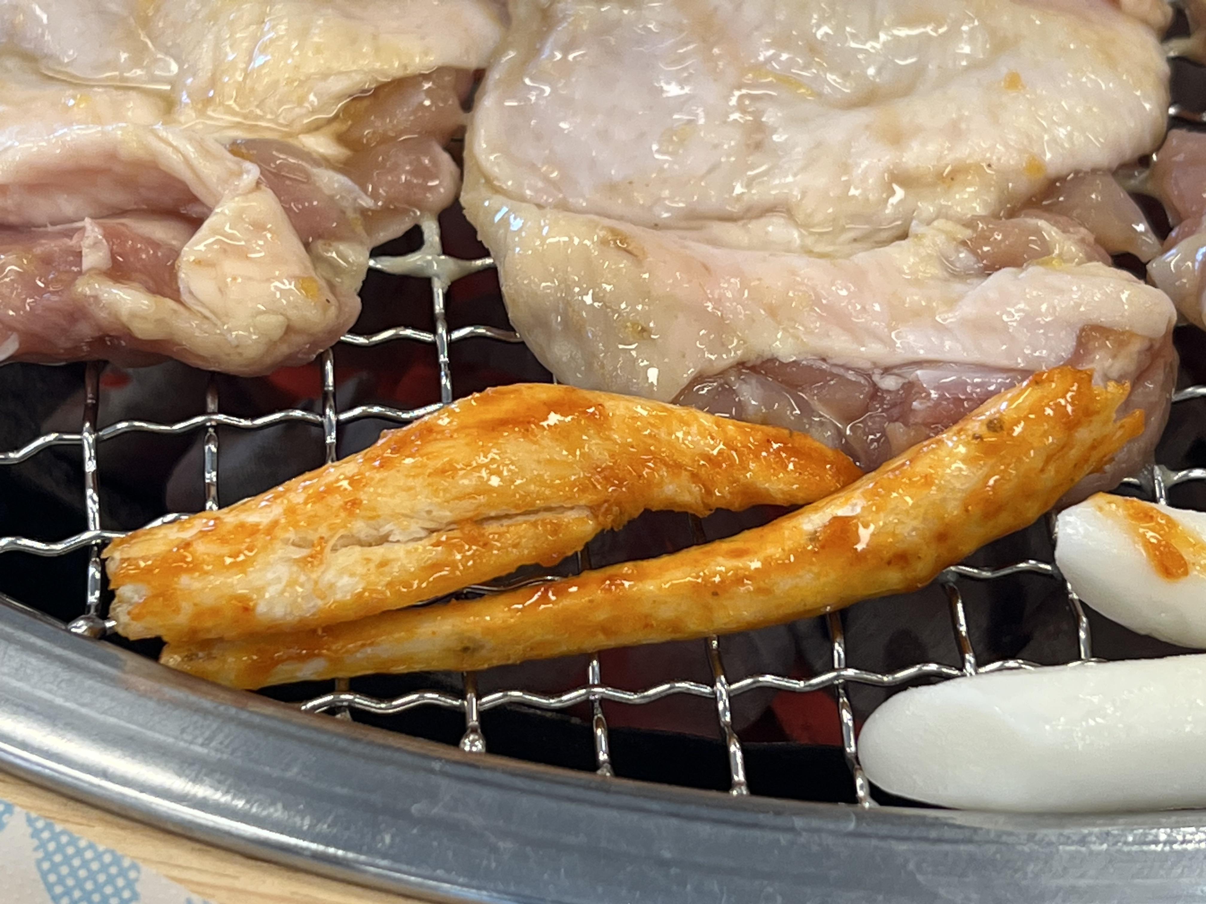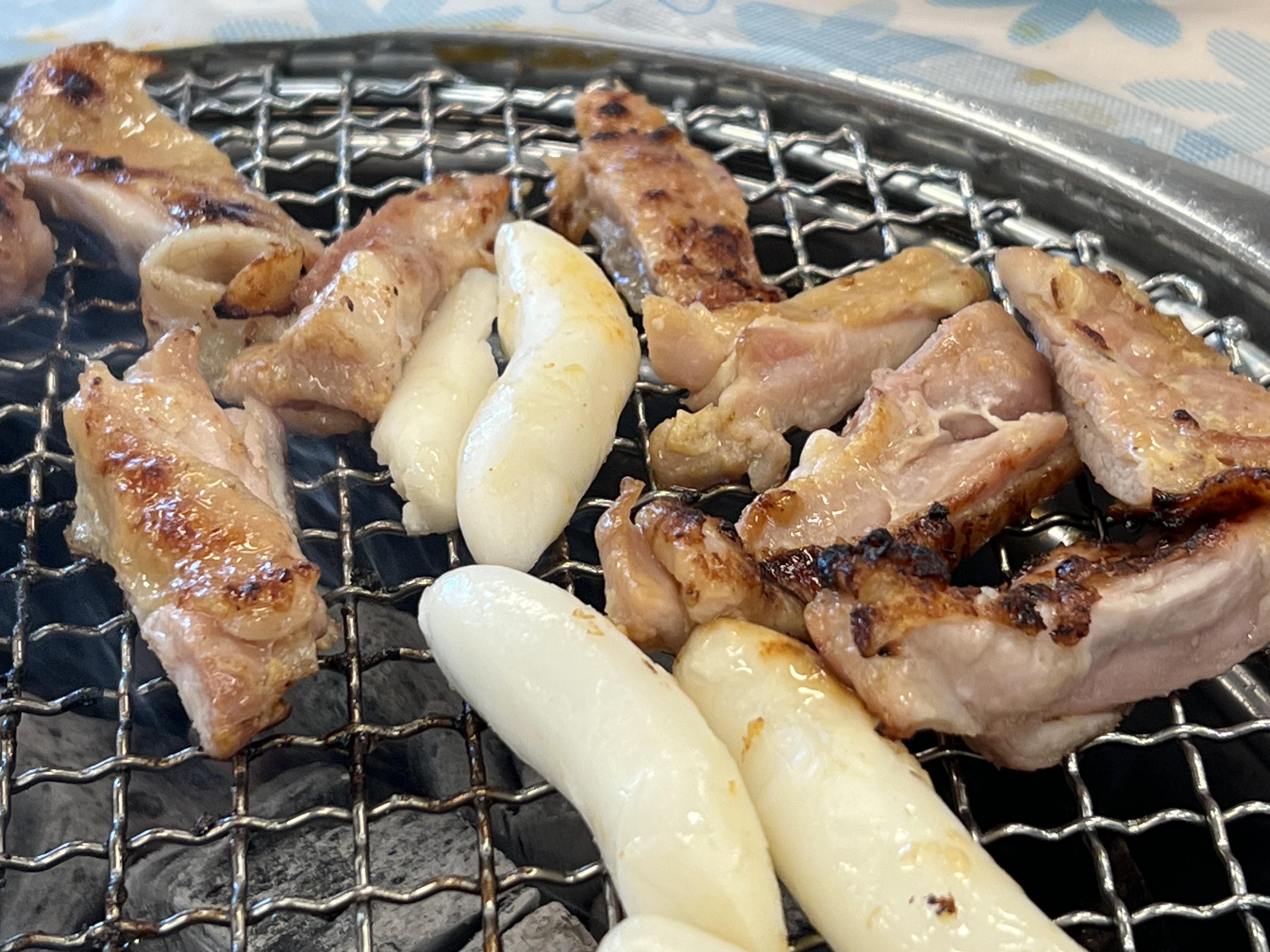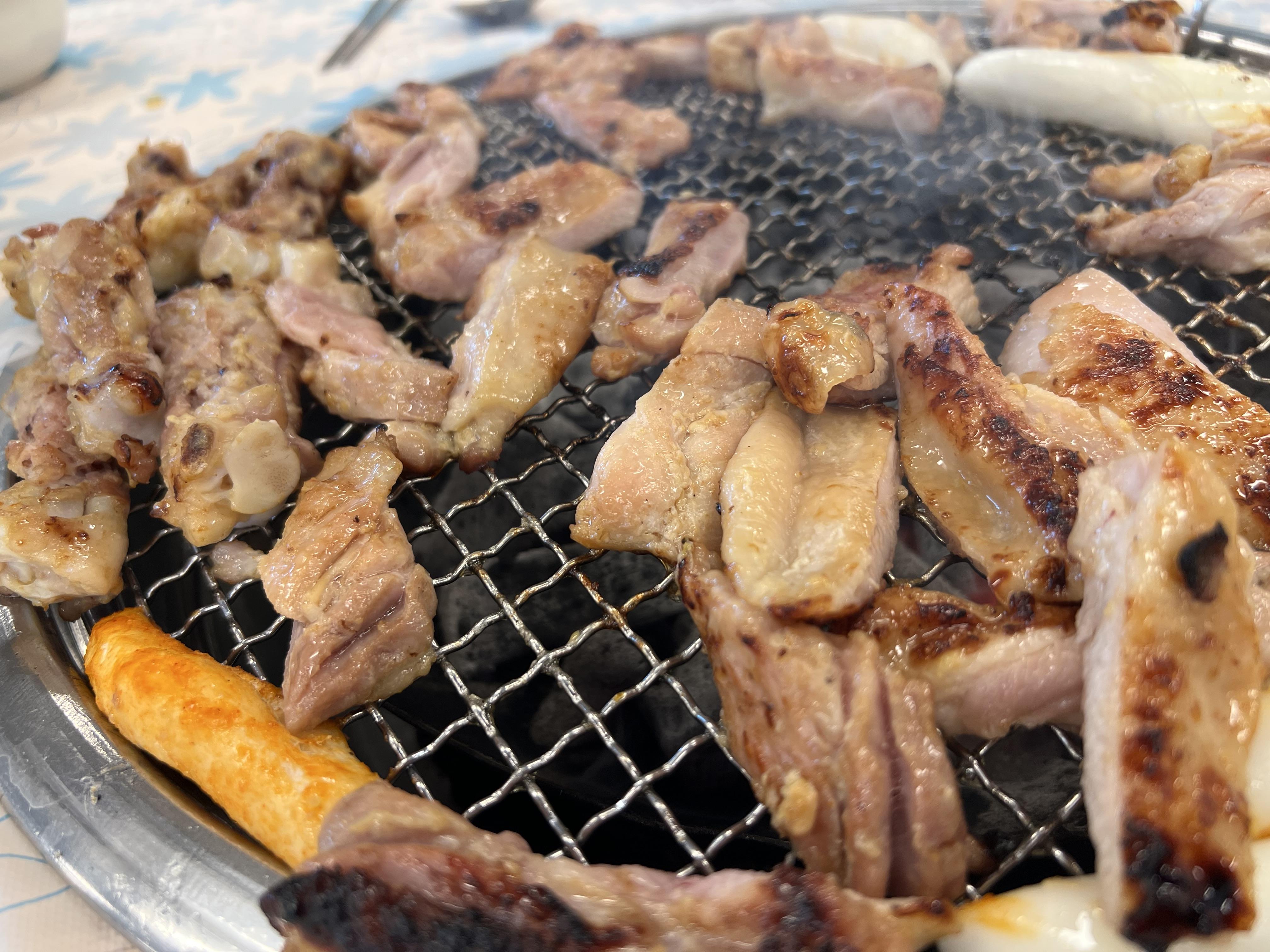 숯불에 구워먹는 닭갈비입니다. 흔히 우리가 먹는 뻘건 양념의 양배추 볶음 닭갈비는 철판에 구워 먹습니다만, 숯에 구워 먹으면 기본적인 풍미가 다릅니다.