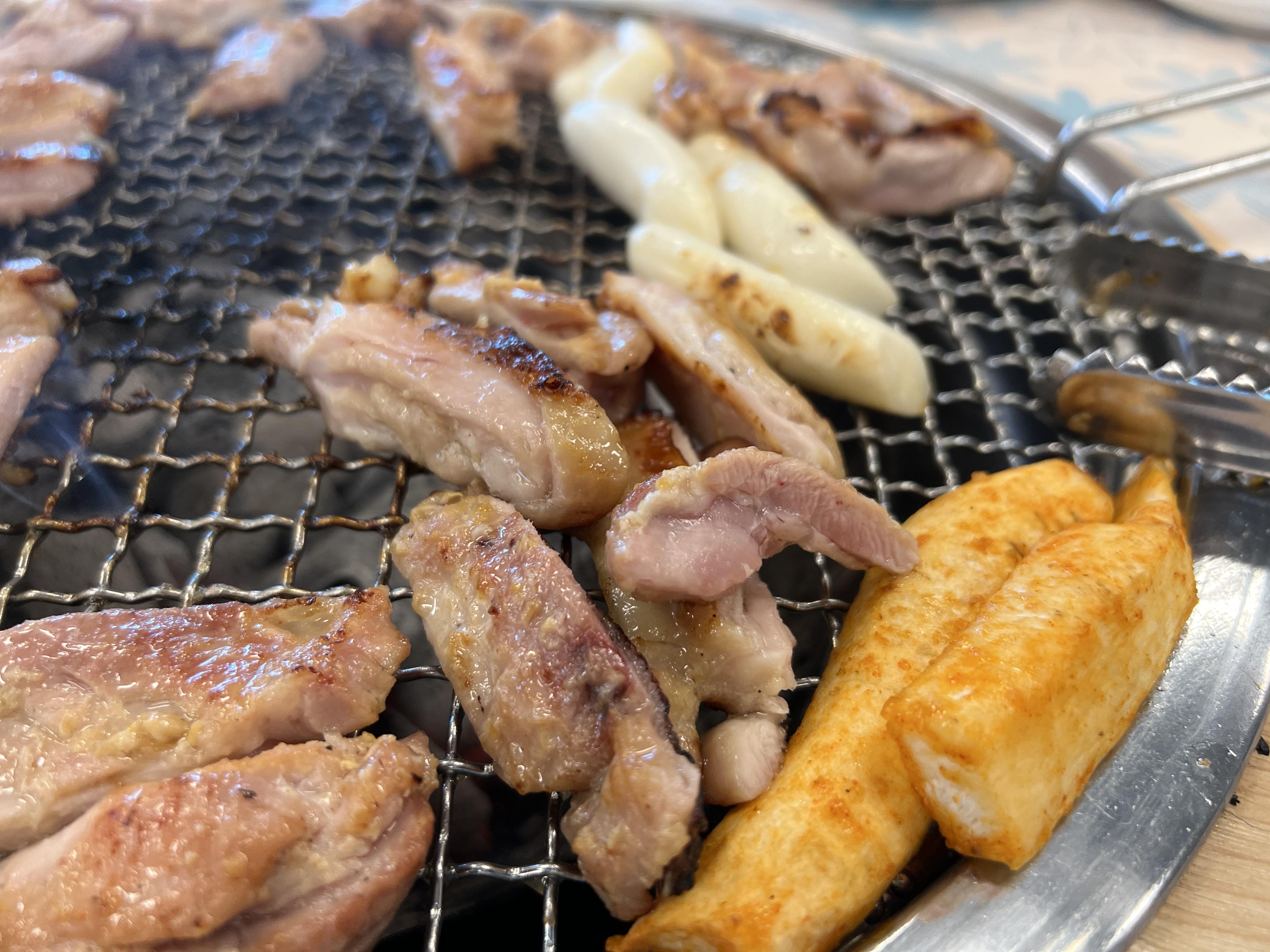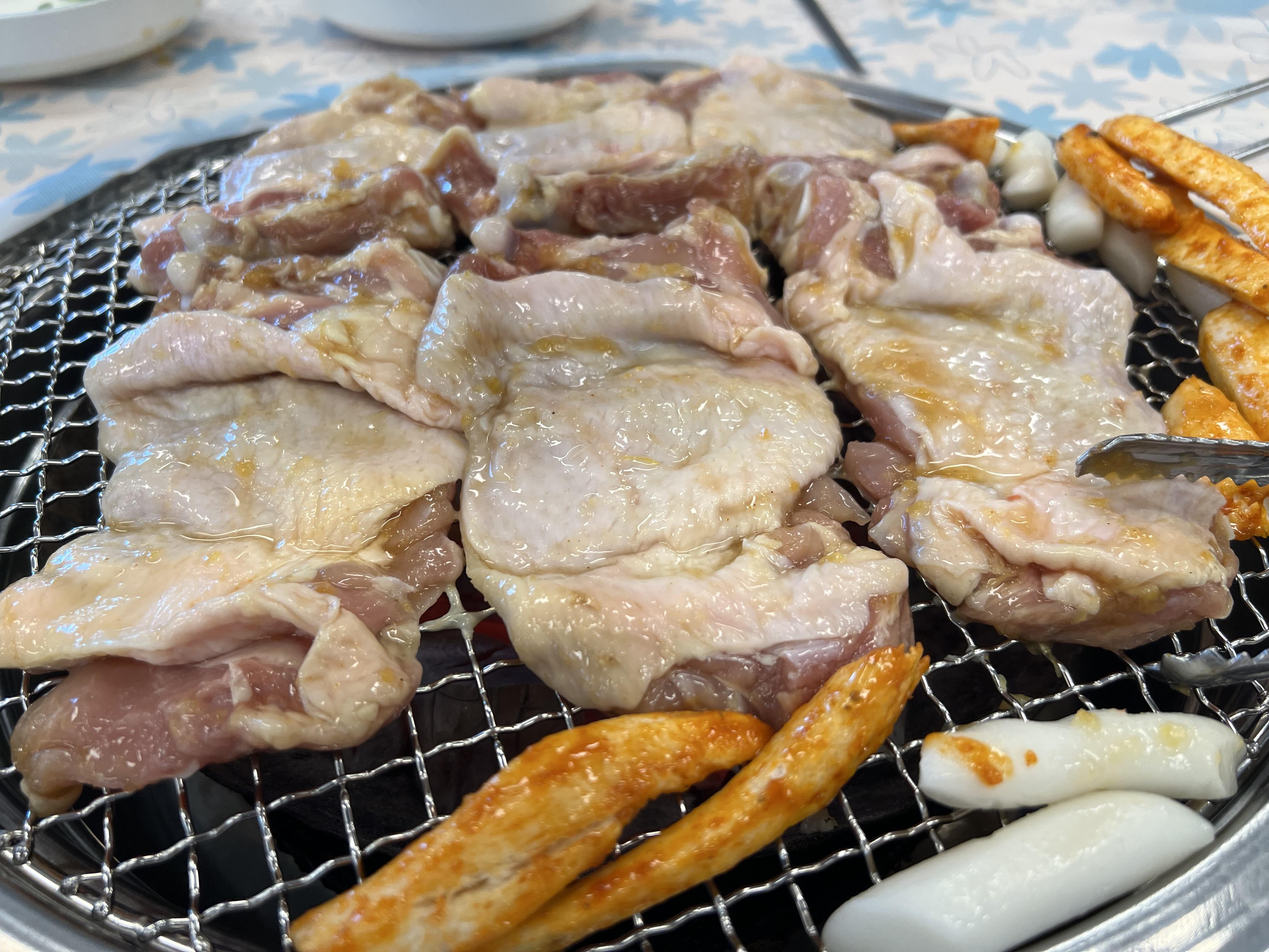 메인 닭갈비가 나왔습니다. 닭갈비가 간장에 적당히 간이 돼서 나오고, 갈비라고는 하지만 실제로는 닭다리(닭봉 근처의 살로 추정은 합니다)여서 살이 굉장히 보들보들하고 육즙이 가득합니다. 닭갈비라고 해서 진짜 가슴살 정도라고 생각하시면 안 됩니다. 돼지나 소의 갈빗대처럼 고기를 아주 얇게 저며서 보드랍고 식감이 살아 있는 쫄깃함을 함께 느낄 수 있습니다. 고기와 함께 양념이 된 더덕과 쌀떡을 함께 구워 먹는데 이게 또 별미입니다.