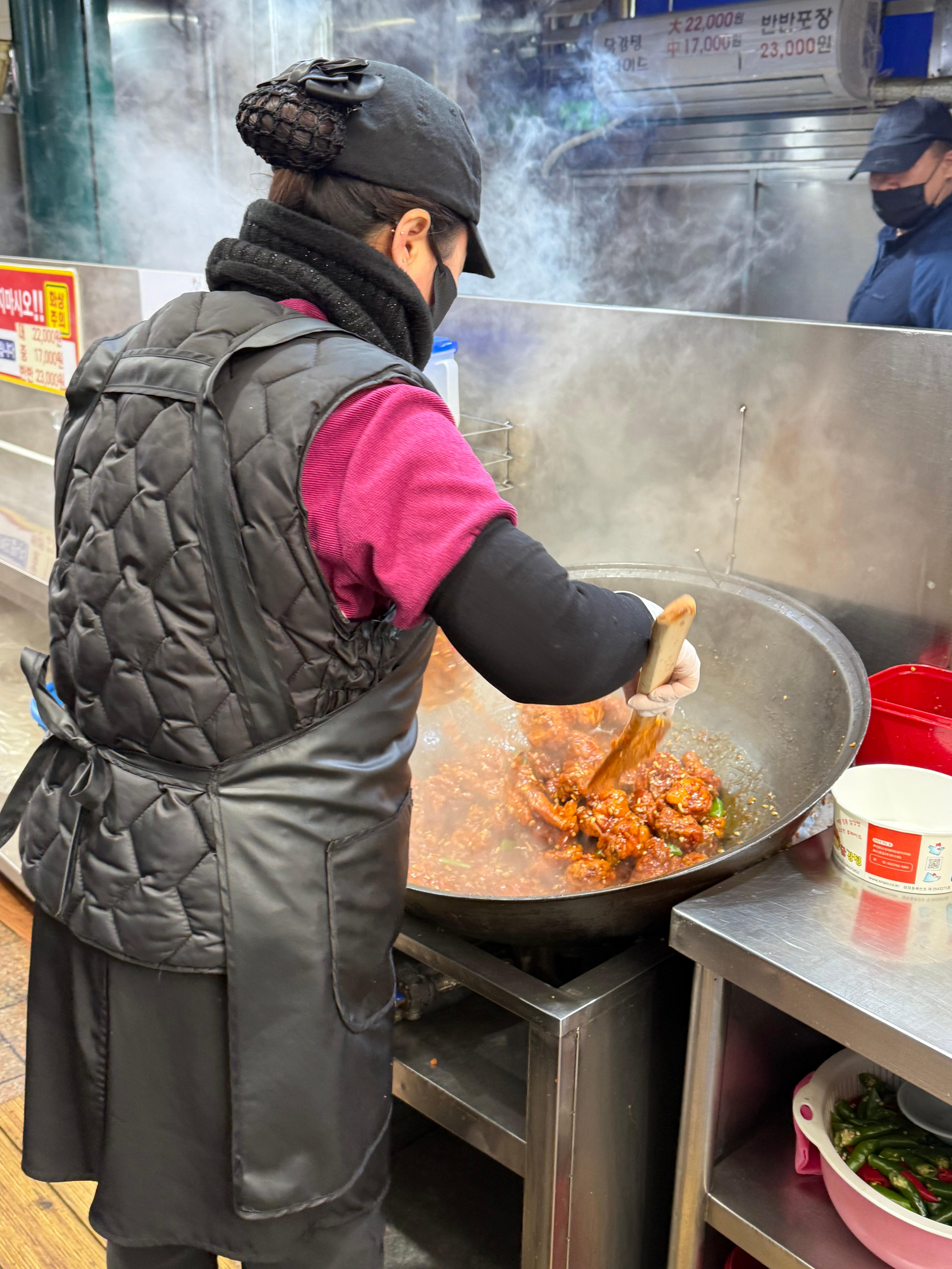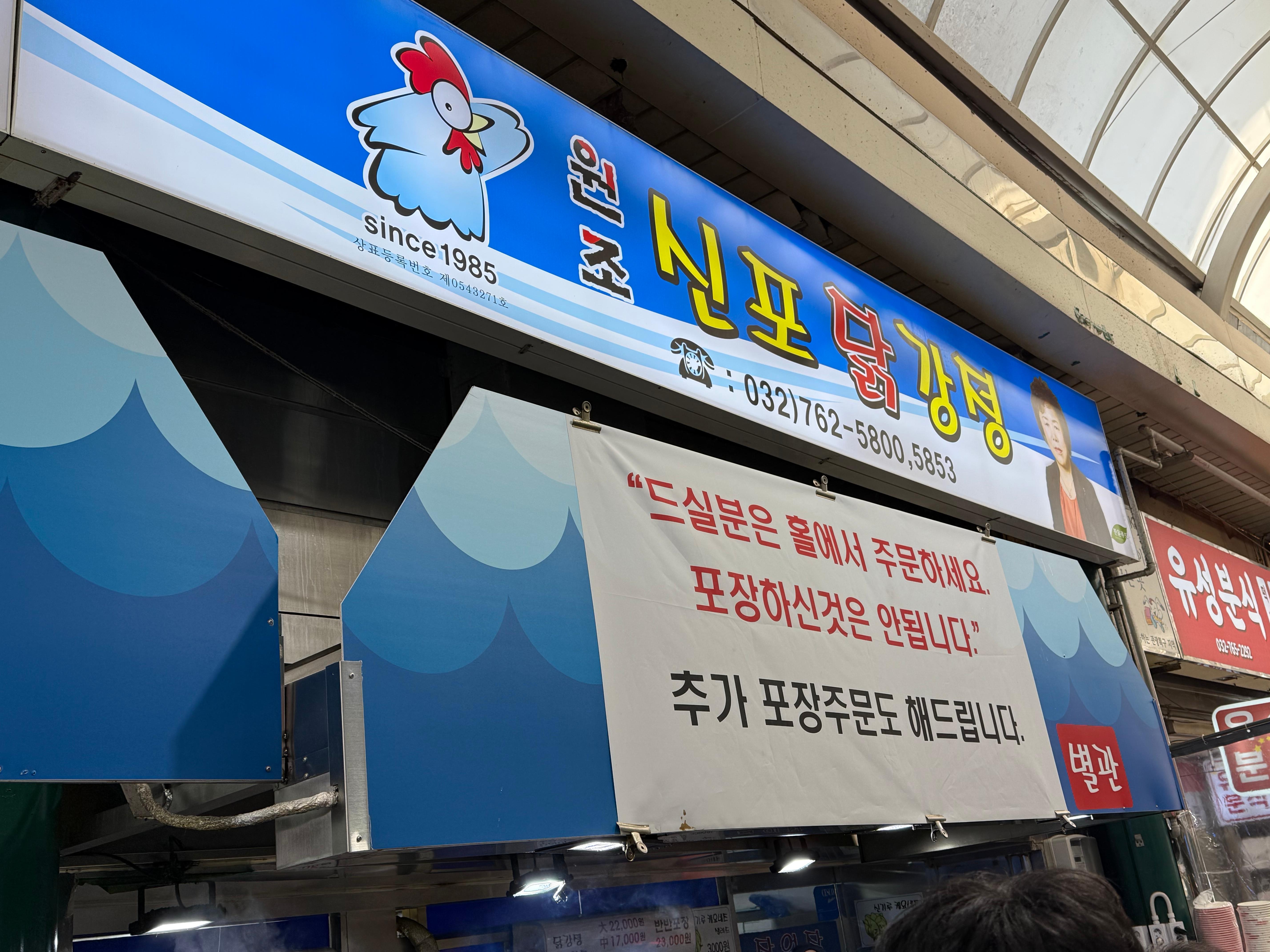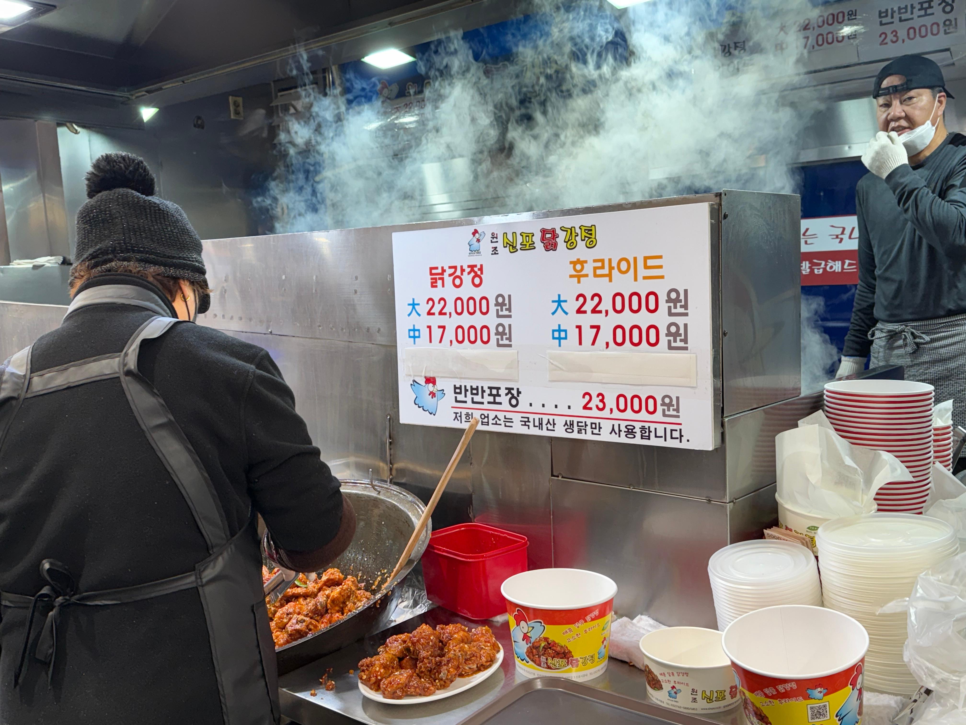 신포닭강정은 시장 골목에서 서로 마주하고 왼쪽에선 제조를 하고, 오른쪽에선 좌석이 있어 손님들이 식사를 할 수 있습니다. 그래서 신포닭강정 주변은 항상 닭은 든 사람들이 정신없이 오가는 편입니다. 제가 방문한 날도 손님은 웨이팅을 해야 할 만큼 줄이 있었습니다.