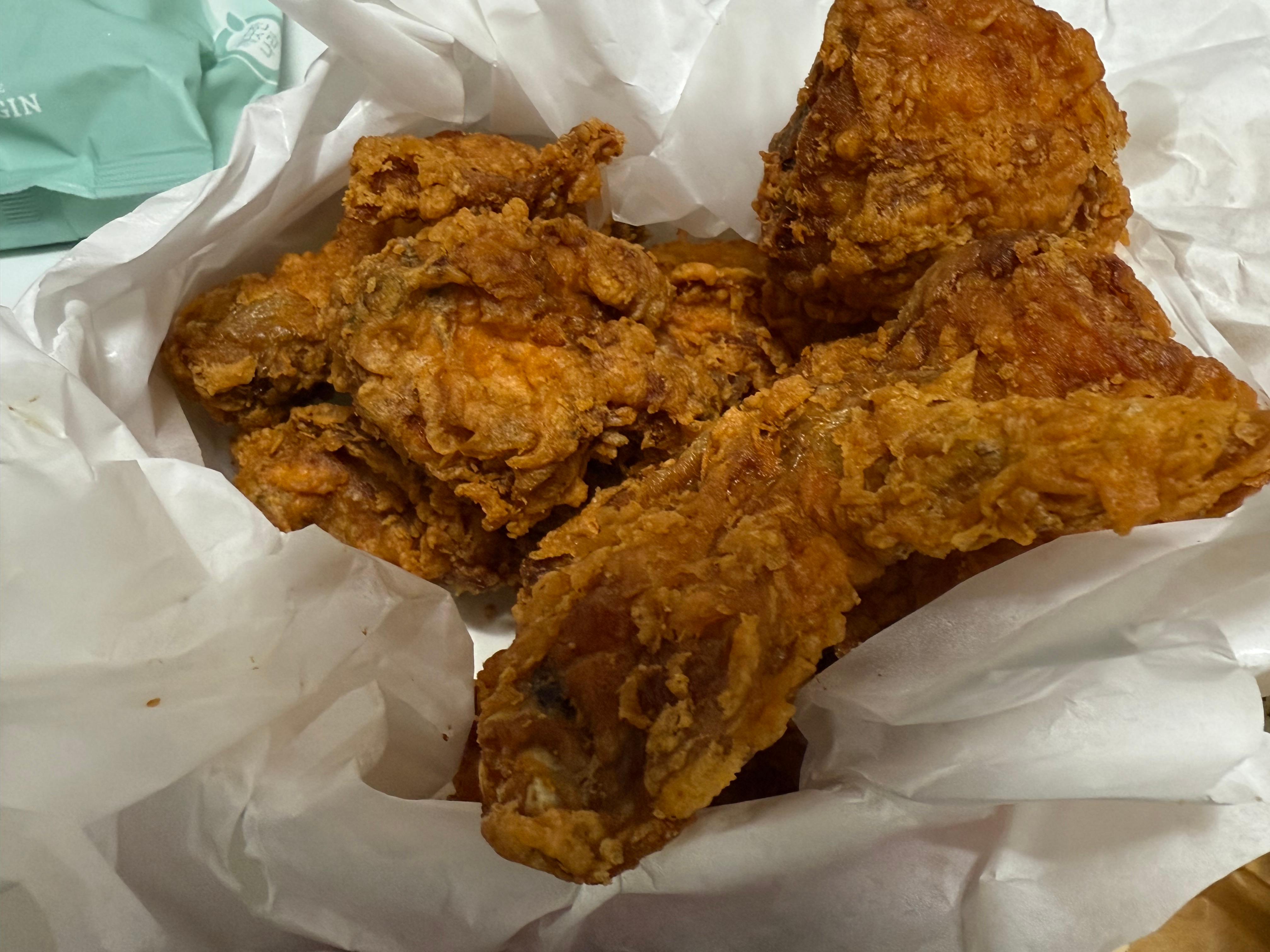 중 사이즈의 후라이드를 열어 보면 닭의 양이 한 마리는 아니라는 것을 확인할 수 있습니다. 중과 대를 구분하는 건 애초부터 닭의 크기가 다른 게 아니라 한 마리냐 2/3이냐 정도의 차이인 듯합니다. 시간이 지났지만 후라이드의 바삭함은 그대로 살아 있었습니다.