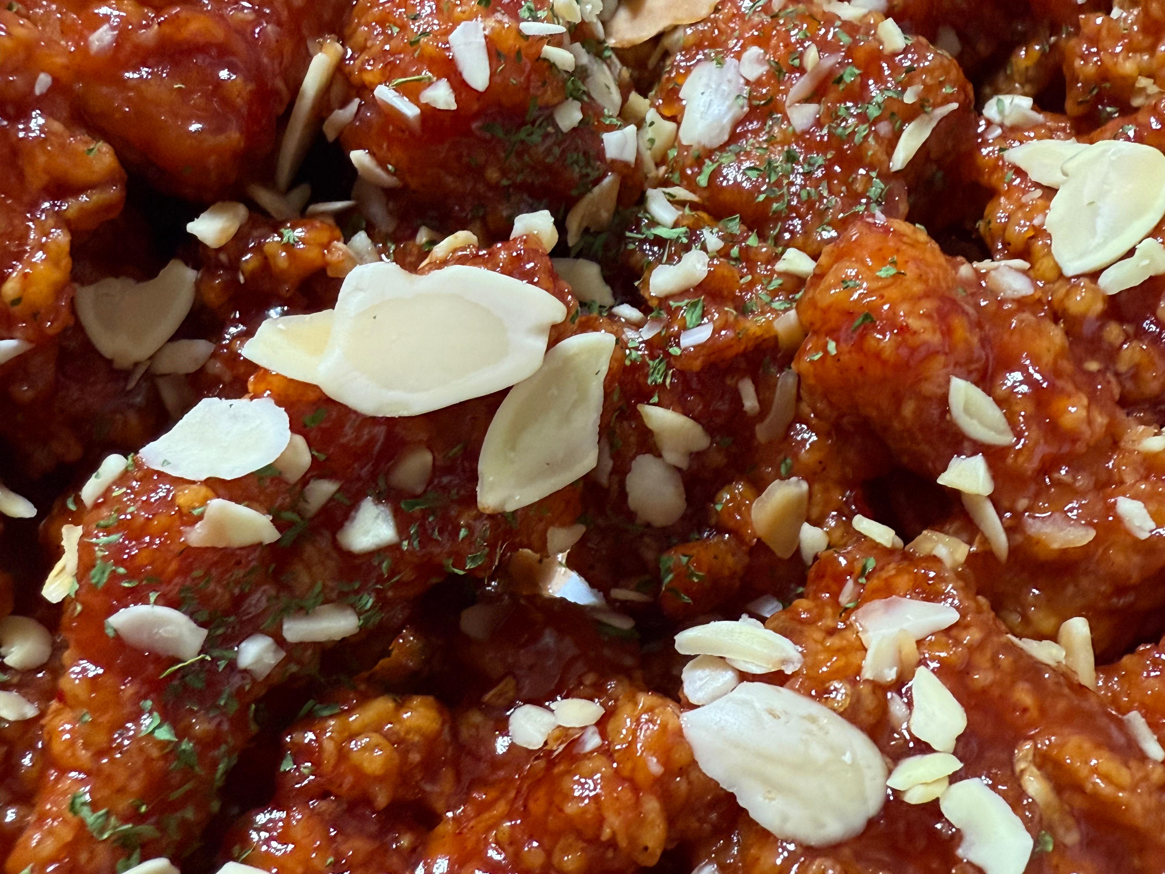 역시나 종이를 걷어 보니 끈적한 닭강정 양념이 국물이 거의 없이 고르게 발라져 있고, 그 위에 아몬드와 파슬리로 보이는 가루가 뿌려져 있습니다. 양은 여느 배달 치킨집보다 많아 보였습니다. 특히나 뼈 없는 순살 메뉴였기 때문에 더 많게 느껴진 걸 수도 있겠지만 실제로 홈페이지에서 확인한 정보로는 1.4kg 짜리 닭을 사용한다고 합니다. 1kg이 채 되지 않는 작은 닭을 쓰는 일반 프랜차이즈 업체들에 비해서 양이 많은 것은 확실하네요.