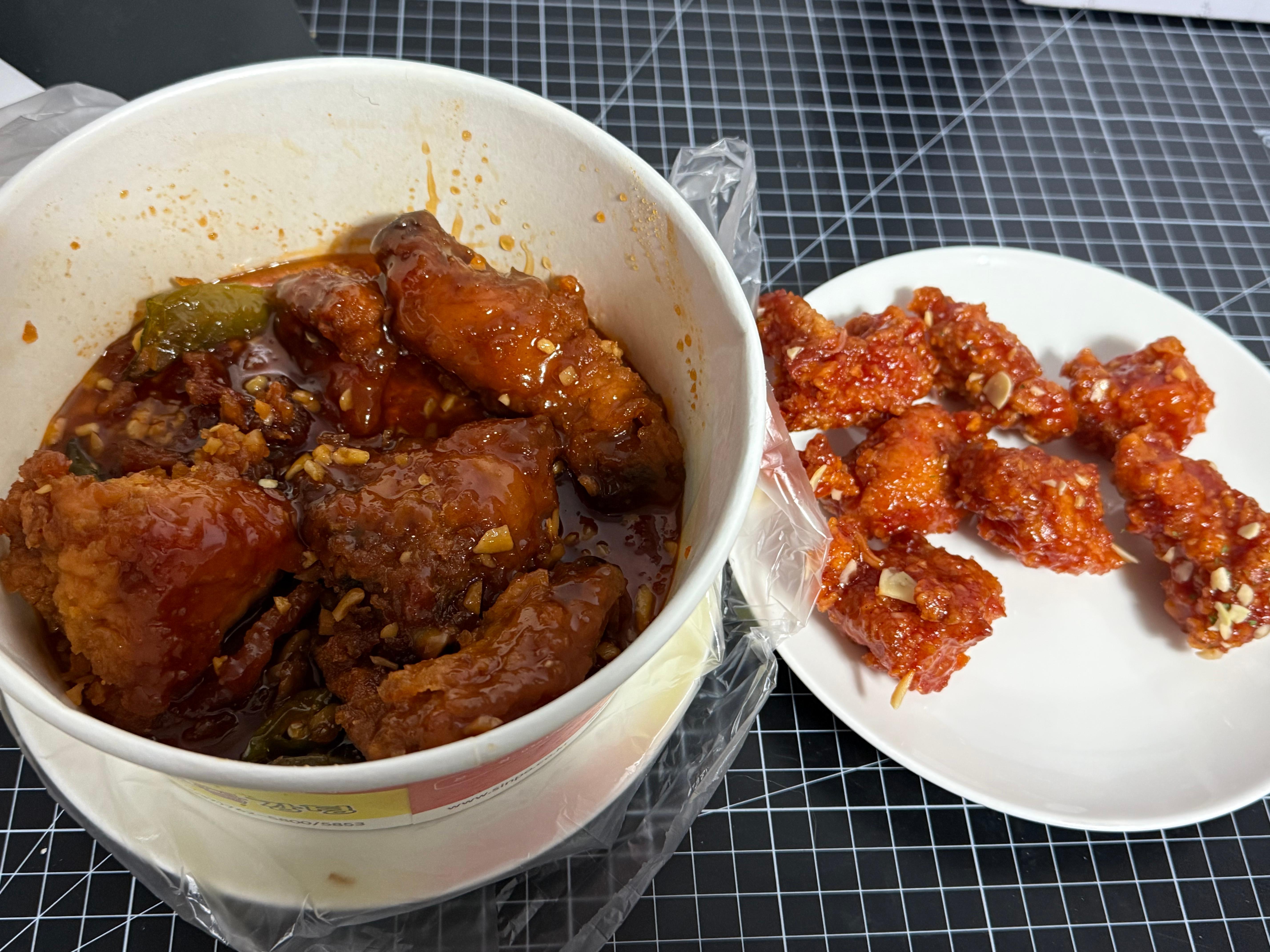 자, 이게 바로 문제의 신포닭강정입니다. 국물이 한가득입니다. 이건 하루가 지나고 안 지나고의 문제가 아닙니다. 처음부터 국물이 밥을 비벼 먹을 정도로 많았으니까요. 닭강정이지만 양념치킨보다 양념이 걸죽합니다. 도대체 이게 어떻게 닭강정의 비주얼인지 모르겠습니다.