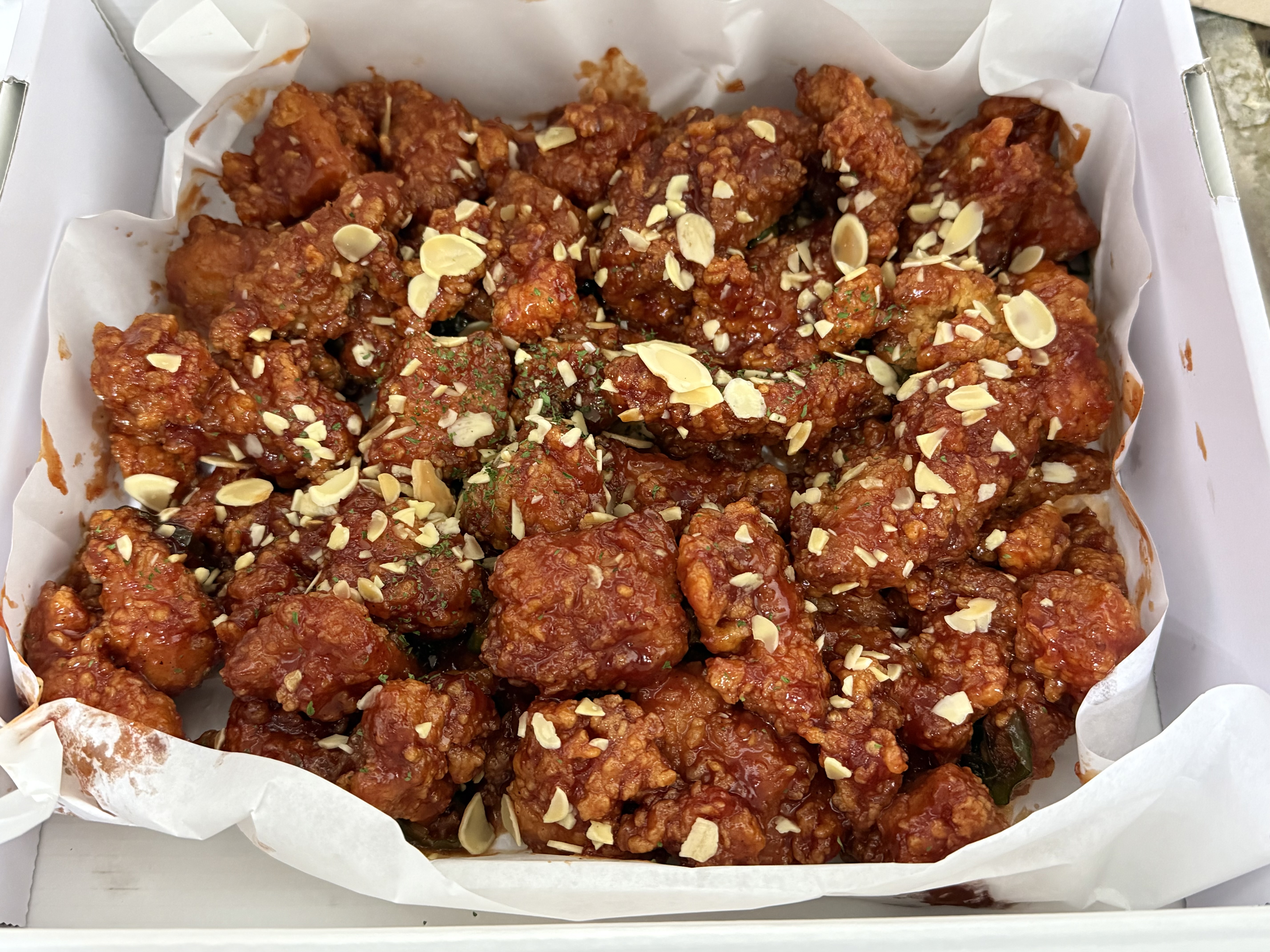 역시나 종이를 걷어 보니 끈적한 닭강정 양념이 국물이 거의 없이 고르게 발라져 있고, 그 위에 아몬드와 파슬리로 보이는 가루가 뿌려져 있습니다. 양은 여느 배달 치킨집보다 많아 보였습니다. 특히나 뼈 없는 순살 메뉴였기 때문에 더 많게 느껴진 걸 수도 있겠지만 실제로 홈페이지에서 확인한 정보로는 1.4kg 짜리 닭을 사용한다고 합니다. 1kg이 채 되지 않는 작은 닭을 쓰는 일반 프랜차이즈 업체들에 비해서 양이 많은 것은 확실하네요.