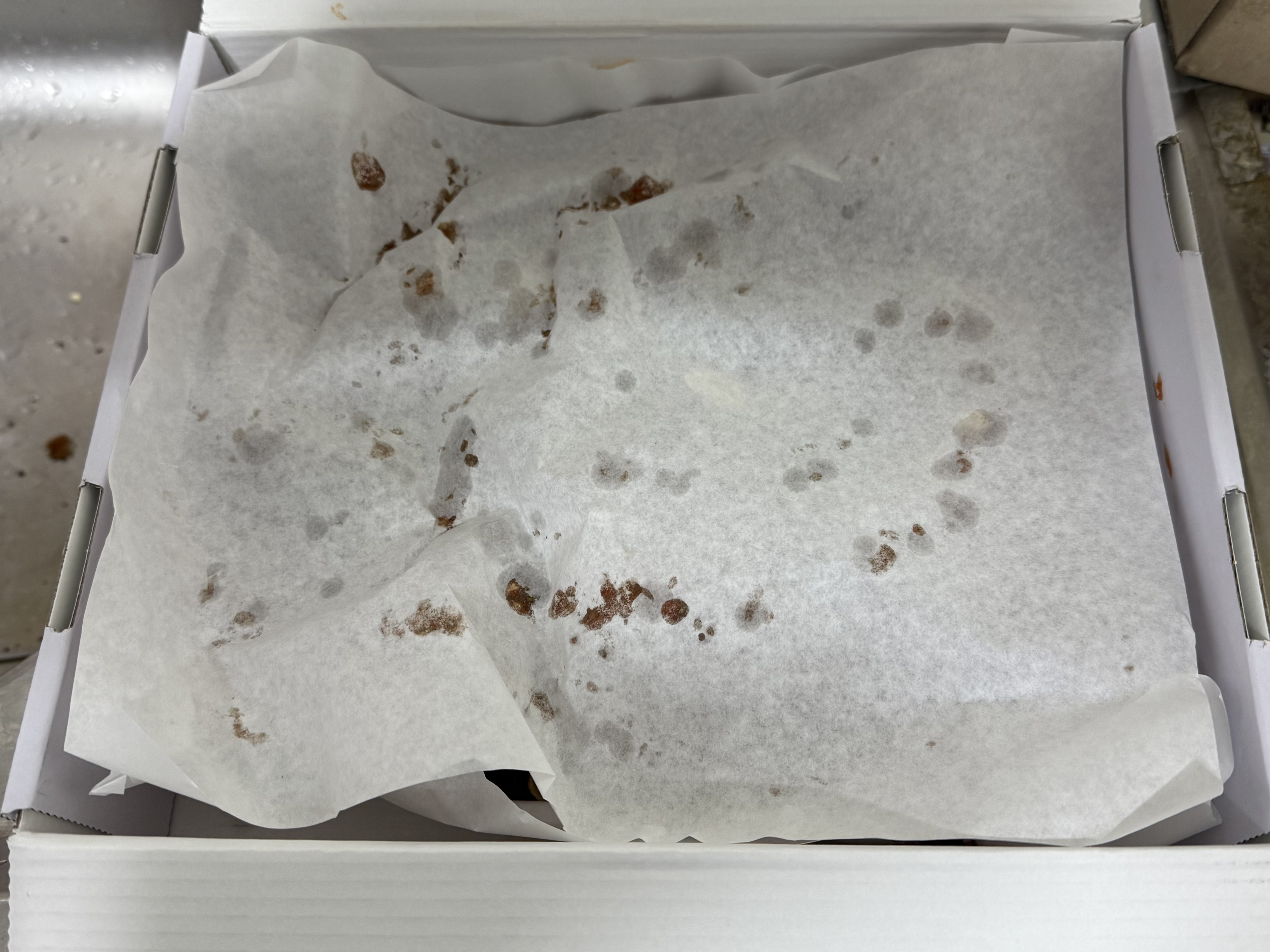 박슬르 열어 보면 얇은 종이가 한 장 덮여 있습니다. 아무래도 겉 박스와 직접 닿지 않게 함으로써 오염을 방지하고자 하는 목적인 것 같습니다. 1박2일에 걸쳐 택배로 도착했음에도 종이에 그리 많은 양념이 묻어져 있지 않은 걸 보면 닭강정이 국물 없이 되직한 양념만 묻어 있는 걸로 짐작할 수 있습니다.