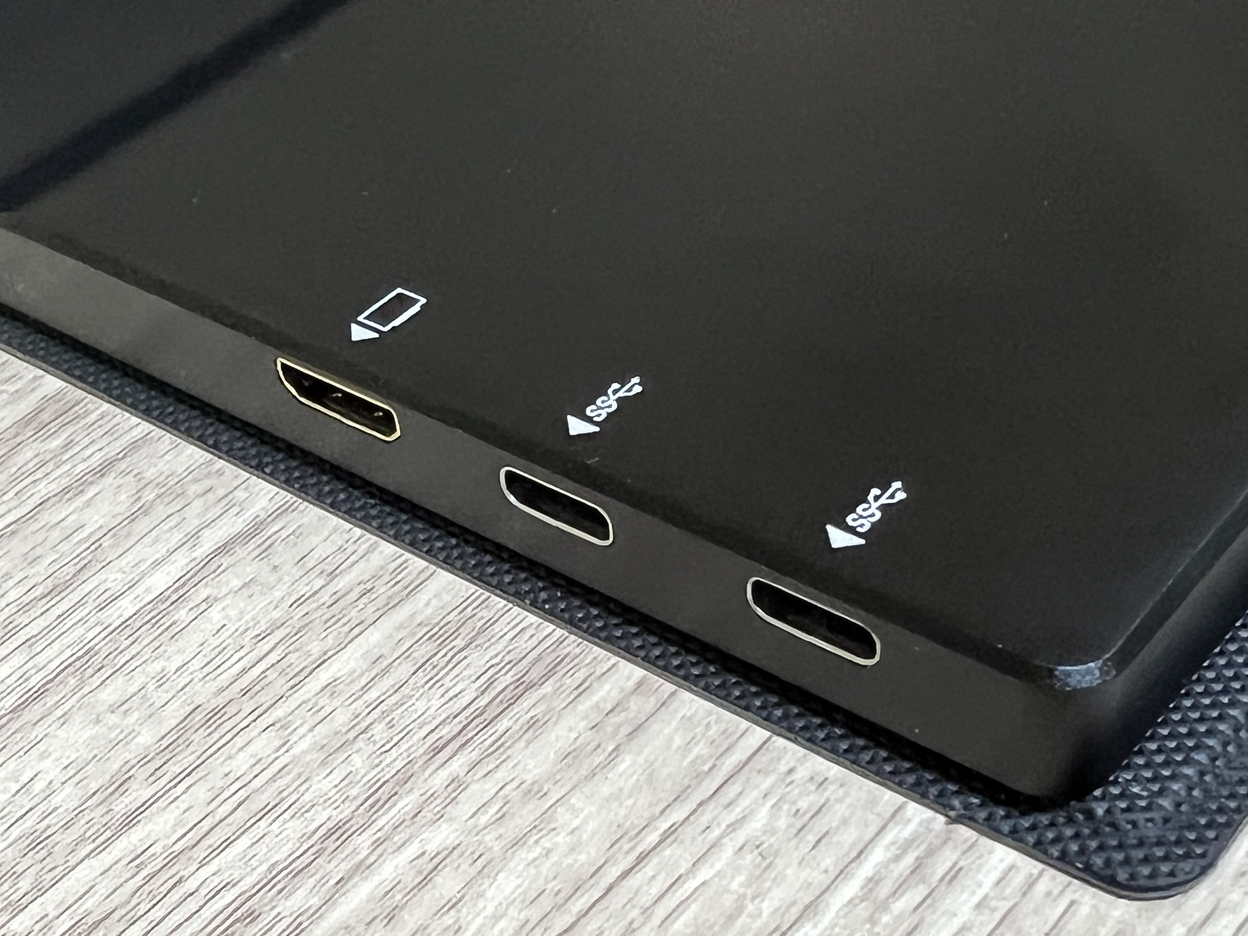 휴대용 모니터와 그것을 ㄷ 자 모양으로 감싸고 있는 케이스입니다. 모니터와 자석으로 붙는 다른 제품들과 달리 XD156-4K는 케이스에 붙어 있는 양면 테이프로 모니터를 붙이는 방식입니다. 장점으로는 단단하게 고정이 된다는 것, 그래서 케이스를 ⊓ 이런 모양으로 잡았을 때 디스플레이가 떨어져서 파손되는 불상사를 미연에 방지할 수는 있습니다. 그러나 다른 제품에서 제공하거나 별도로 구입할 수 있는 받침대는 사용할 수 없는 단점도 있습니다. 이건 개인의 취향 문제겠지요.