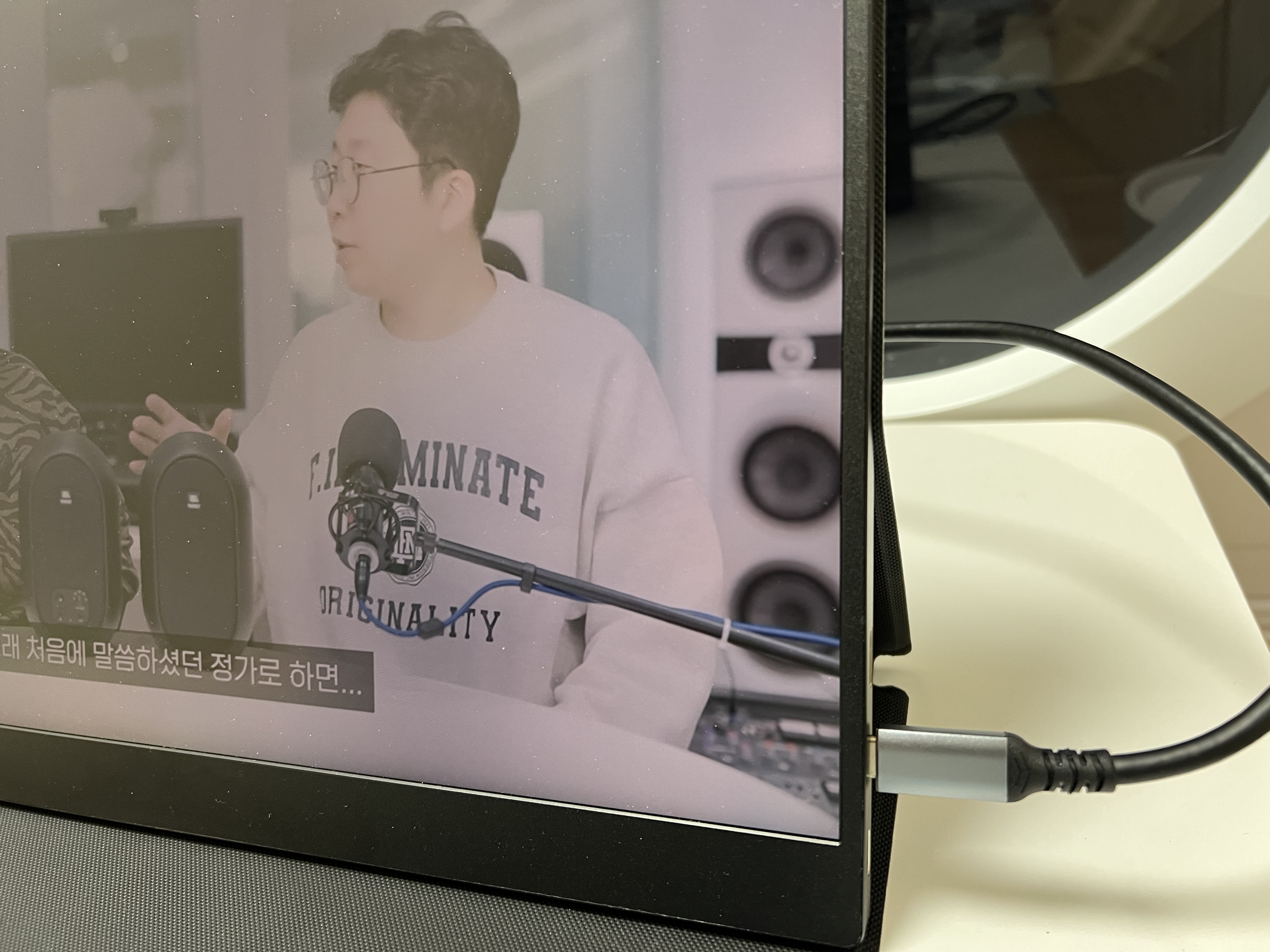 USB C 케이블 하나만 연결해도 화면은 잘 나옵니다. 다만, 이렇게 연결하면 화면의 밝기를 100% 활용할 수가 없고, 설정값보다 살짝 어두워집니다. 물론 사용하는 데는 전혀 지장이 없습니다.