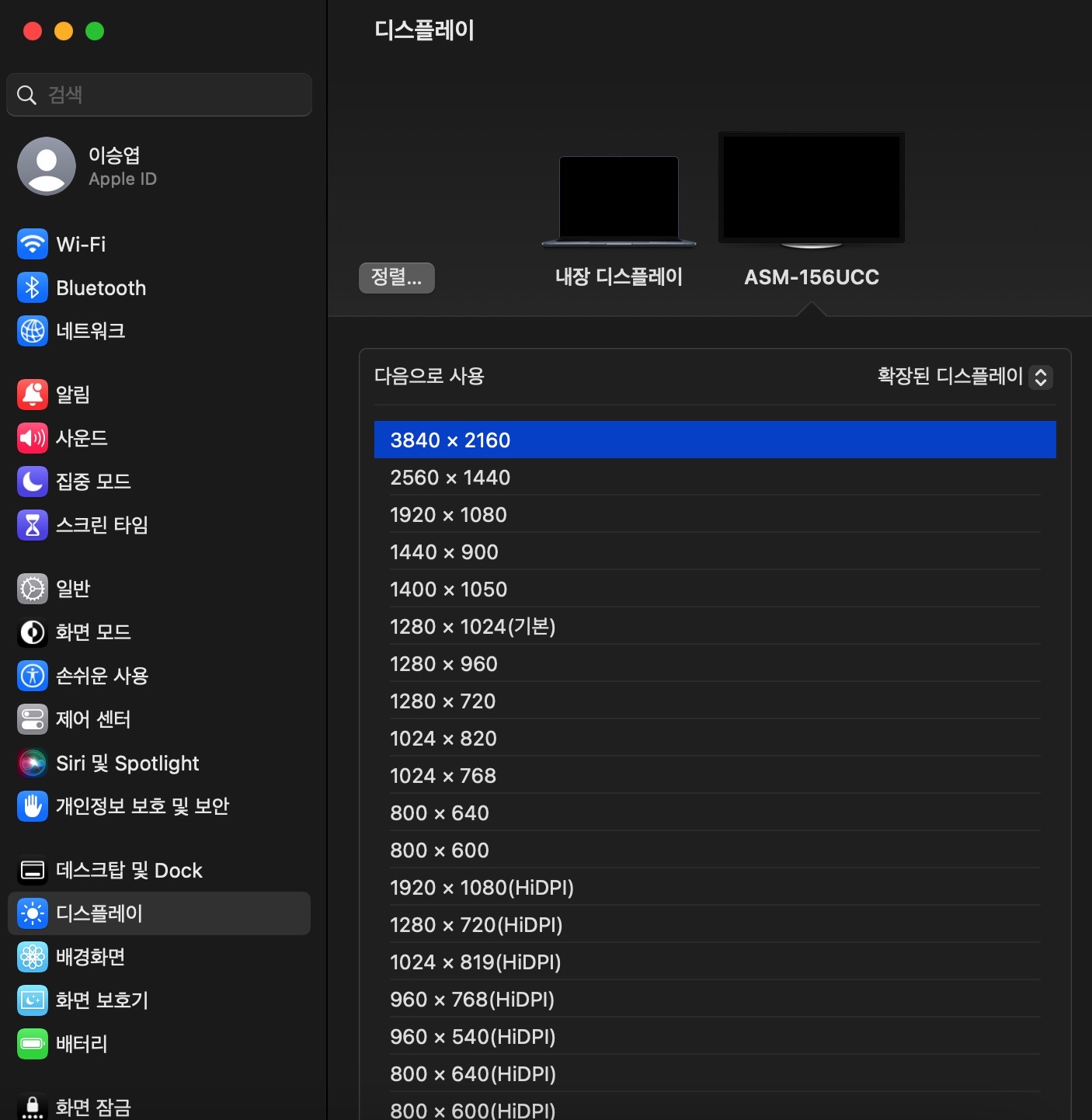 USB로 연결을 해서 디스플레이 설정에 들어가 보면 4K 해상도까지 이상없이 지원을 합니다. 오른쪽 사진은 4K 해상도로 창을 띄워 놓은 것입니다. 15.6인치의 모니터에서 역시 4K는 실제 사용하기에는 무리입니다. 그래서 1920x1080 해상도의 HiDPI 기능을 사용해서 보면 정말 선명하게 보여 줍니다. 일반 1920x1080으로 놓으면 화면이 뿌옇게 흐리게 나옵니다. 가급적 HiDPI 기능을 켜고 사용하는 걸 권장드립니다.