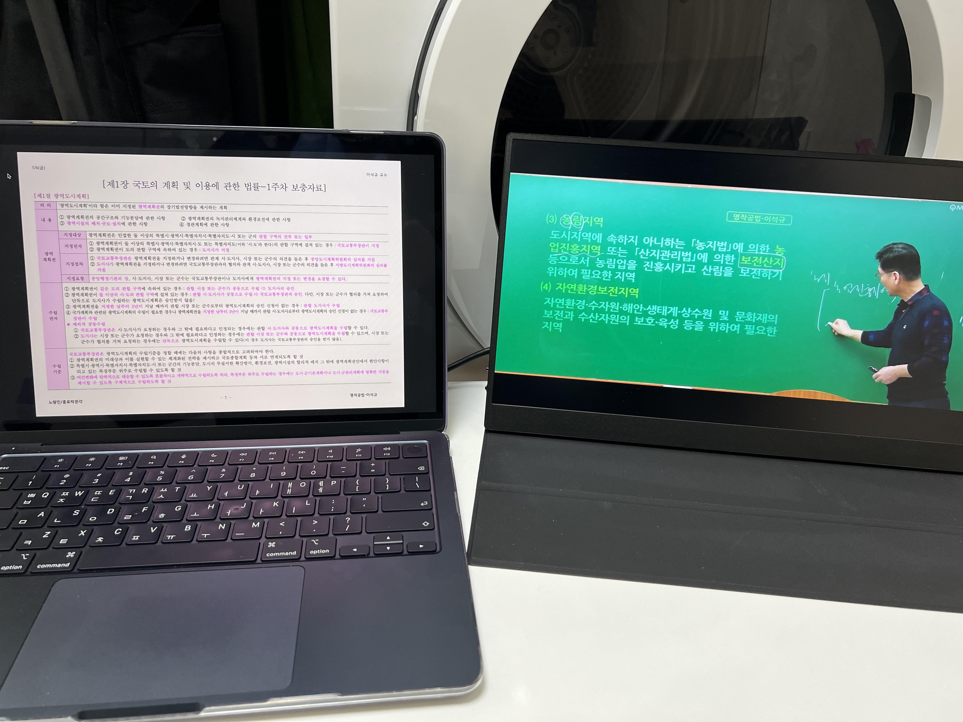 동영상 강의를 들으면서 한쪽에 참고자료를 열어 놓고 보는 목적으로는 정말 좋습니다. 반대로 영상을 맥북에어로, 참고자료를 XD156-4K로 봐도 무방합니다만, 가급적이면 큰 화면으로 영상을 보는 게 판서를 알아보기도 수월하기 때문에 이걸 기본값으로 사용했습니다.