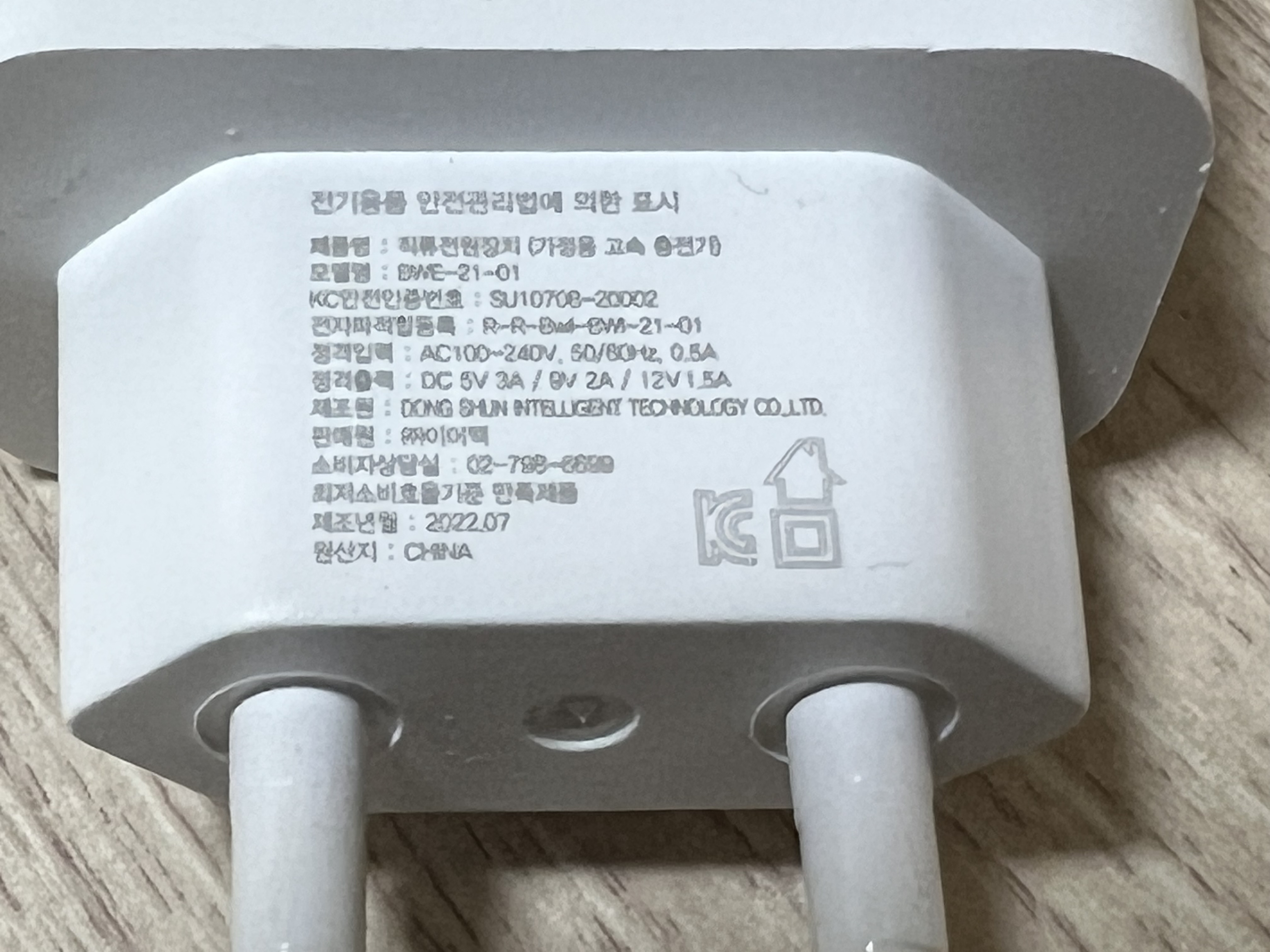 제공되는 케이블은 HDMI to mini HDMI, USB C to C 입니다. 다만 케이블의 길이는 1M 내외로 짧기 때문에 노트북과 멀리 떨어뜨려 놓고 보기는 쉽지 않고, 나란히 붙여 놓고 써야 합니다. 어댑터는 USB A 타입의 커넥터를 가지고 있어서 USB A to C 케이블을 제공하고 있습니다. 어댑터 플러그는 한국형이 아니라 EU형입니다. 물론 EU형을 꽂아도 문제없이 동작합니다만, 약간 유격이 발생하게 됩니다. 어댑터의 스펙은 18W입니다.