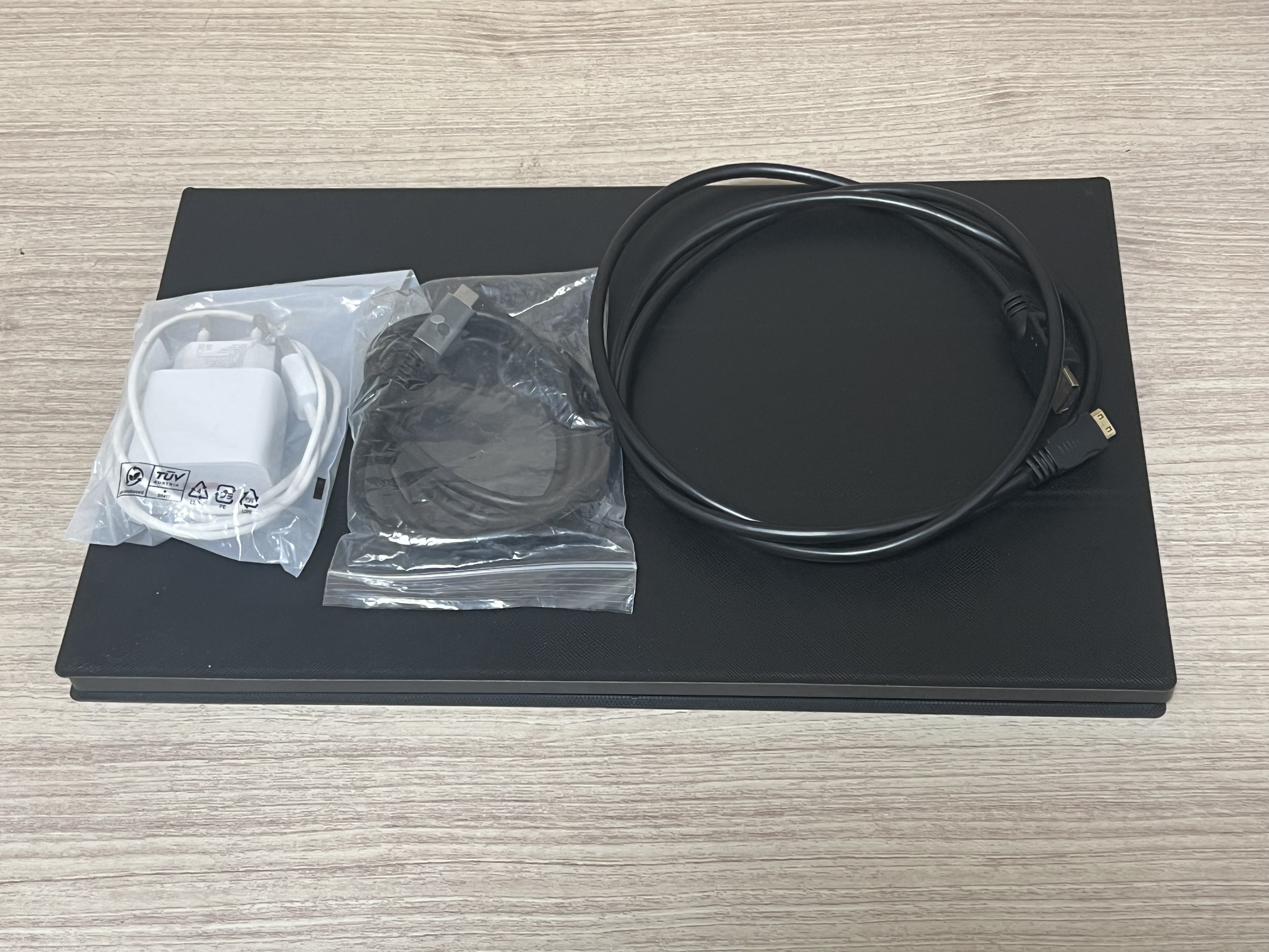 중고거래여서 박스는 받지 못했습니다. 휴대용 모니터와 커버, HDMI to mini HDMI 케이블, USB C to C 케이블, 18W 어댑터와 USB A to C 케이블이 들어 있습니다. 구성은 필요한 것들이 모두 들어 있어 별도로 구매할 필요가 없습니다.