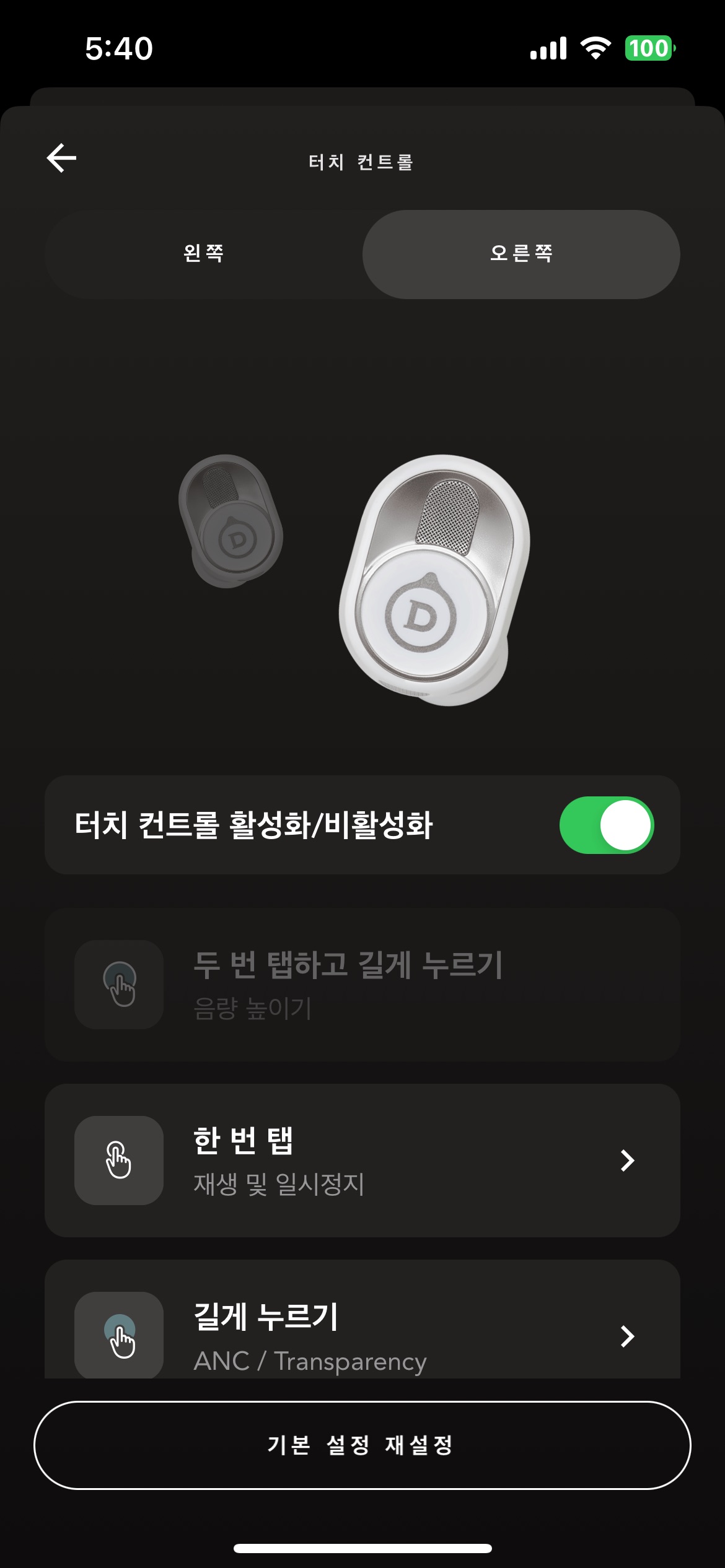 이어폰 케이스는 크롬 도금이 되어 있어서 상당히 고급스럽습니다. 지문이 묻어나는 단점이 있긴 하지만 허리춤에 잘 닦아주면 거울로도 쓸 수 있습니다. 케이스는 무선 충전을 지원하고 아래쪽에는 USB-C 단자가 있습니다. 제품의 뚜껑을 열면 드비알레의 스피커를 닮은 이어폰이 자리하고 있습니다. 드바일레 팬텀을 쏙 빼닮은 디자인이 참 예쁩니다. 디자인은 예쁘지만 기본적으로 이어버즈의 빵이 두껍기 때문에 이어폰을 귀에 꽂으면 정면에서는 약간 튀어 나와 보입니다. 그래서 여러 모로 이어팁의 디자인이 아쉽게 느껴집니다. 더 깊숙하게 집어 넣어 고정할 수 있는 재질이었어야 합니다.