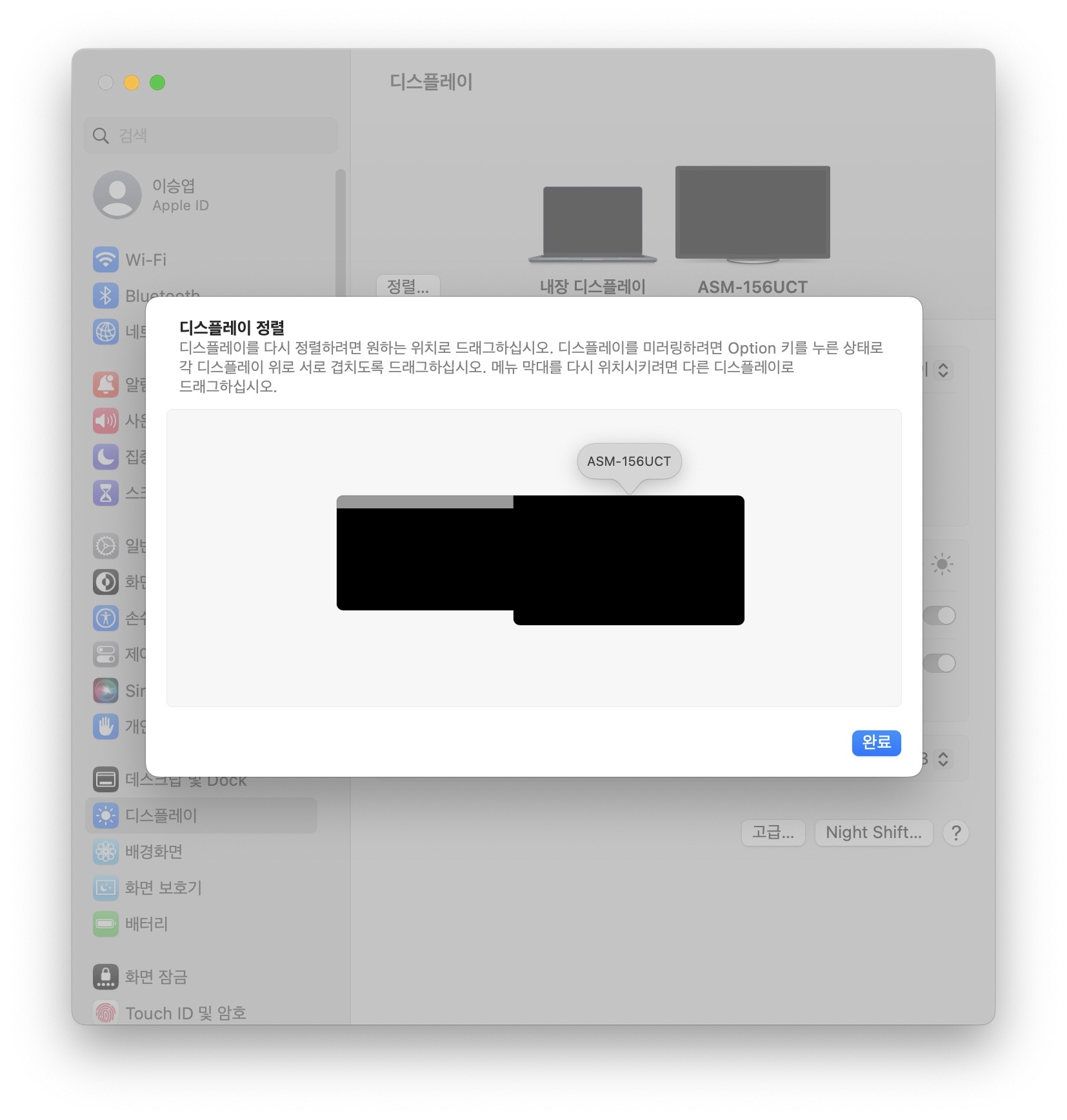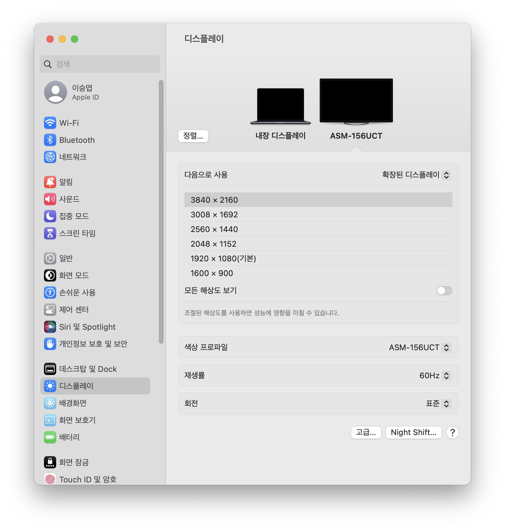 디스플레이 설정에 들어가면 맥북의 기본 모니터와 함께 확장 모니터가 연결되어 있는 것을 확인할 수 있습니다. 여기서 기본 내장 디스플레이가 아닌 ASM-156UCT 모니터를 클릭하면 모니터의 해상도를 설정해 줄 수가 있습니다. 기본적으로 15.6인치 모델이지만 4K 해상도를 지원합니다. 이전의 제품에서도 확인한 바가 있지만 15.6인치에서 4K 해상도로 놨을 때는 글씨가 너무 작아서 제대로 된 작업을 하기는 사실 힘듭니다. 하지만 4K 기능이 필요할 때가 있긴 합니다. 엑셀이라든가 동영상 편집, 사진 편집에서는 필요할 수도 있습니다. 굳이 그런 작업이 아니더라도 유튜브에서 4K 영상을 볼 때 정말 말도 안 되는 화질을 경험할 수 있습니다.