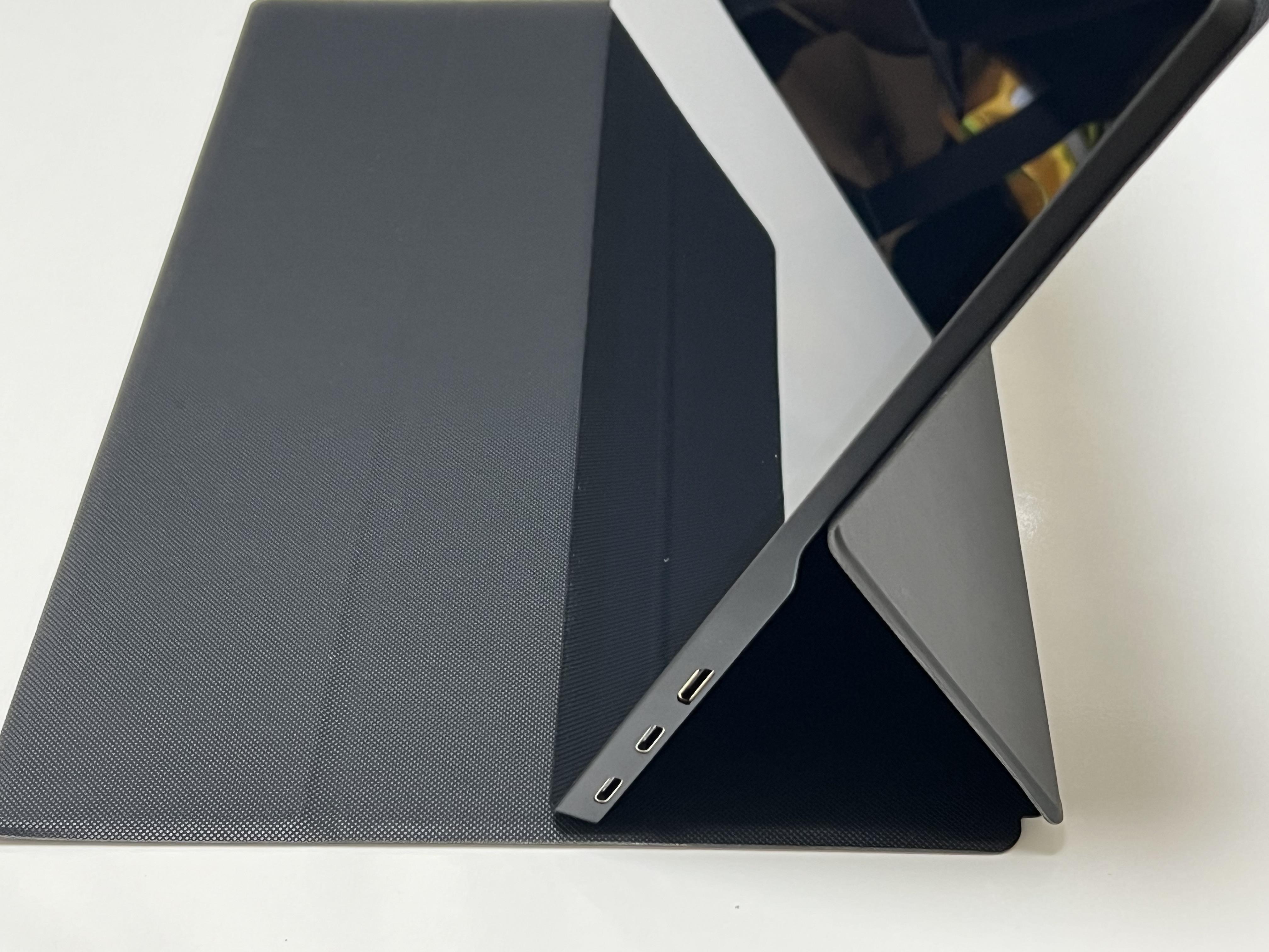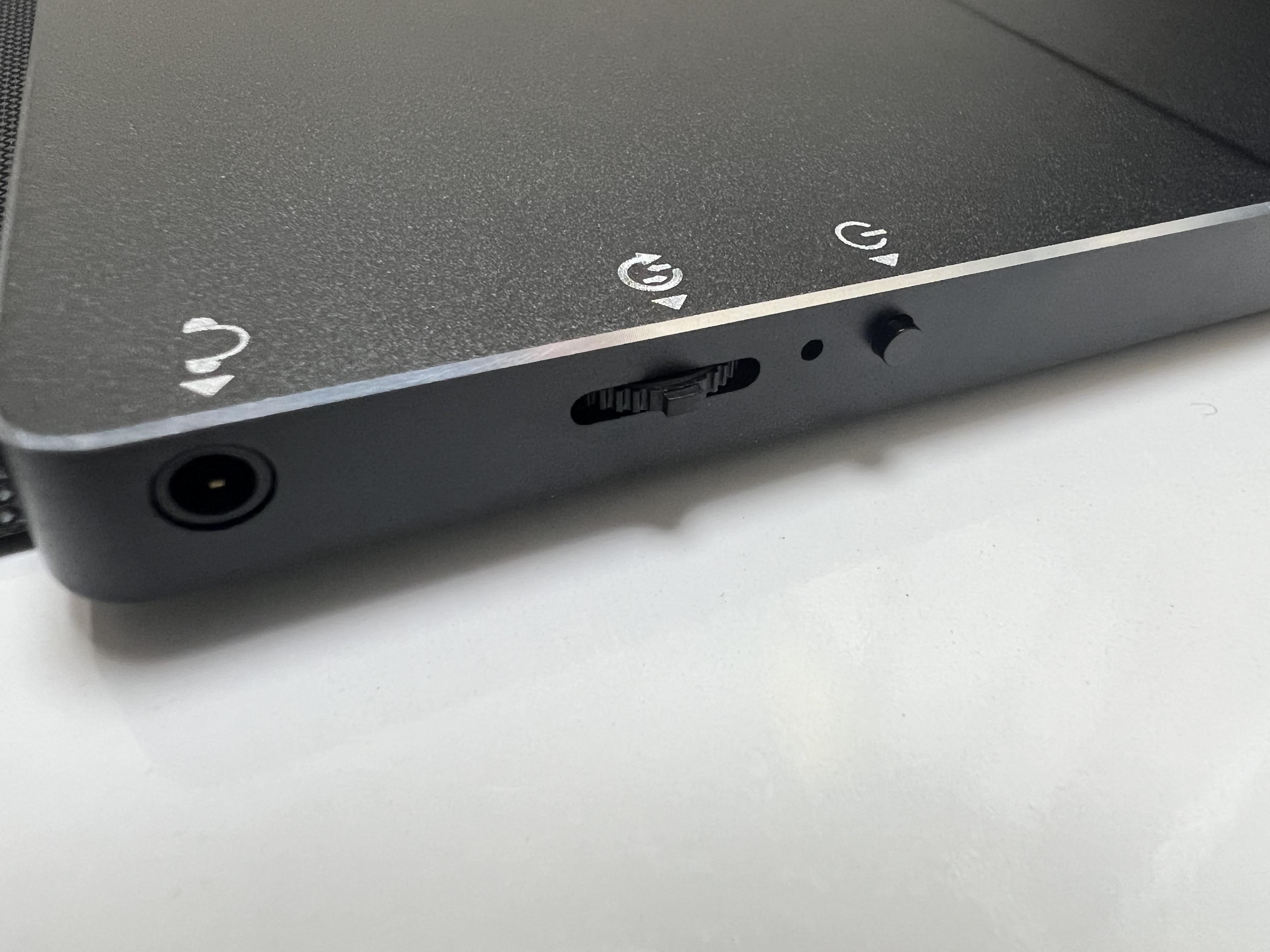 모니터 우측에는 위에서부터 miniHDMI 단자, USB-C2, USB-C1 입력 단자가 있습니다. USB 단자를 통해서는 전력의 출력도 가능합니다. 스마트폰 연결시 충전이 되더라고요.