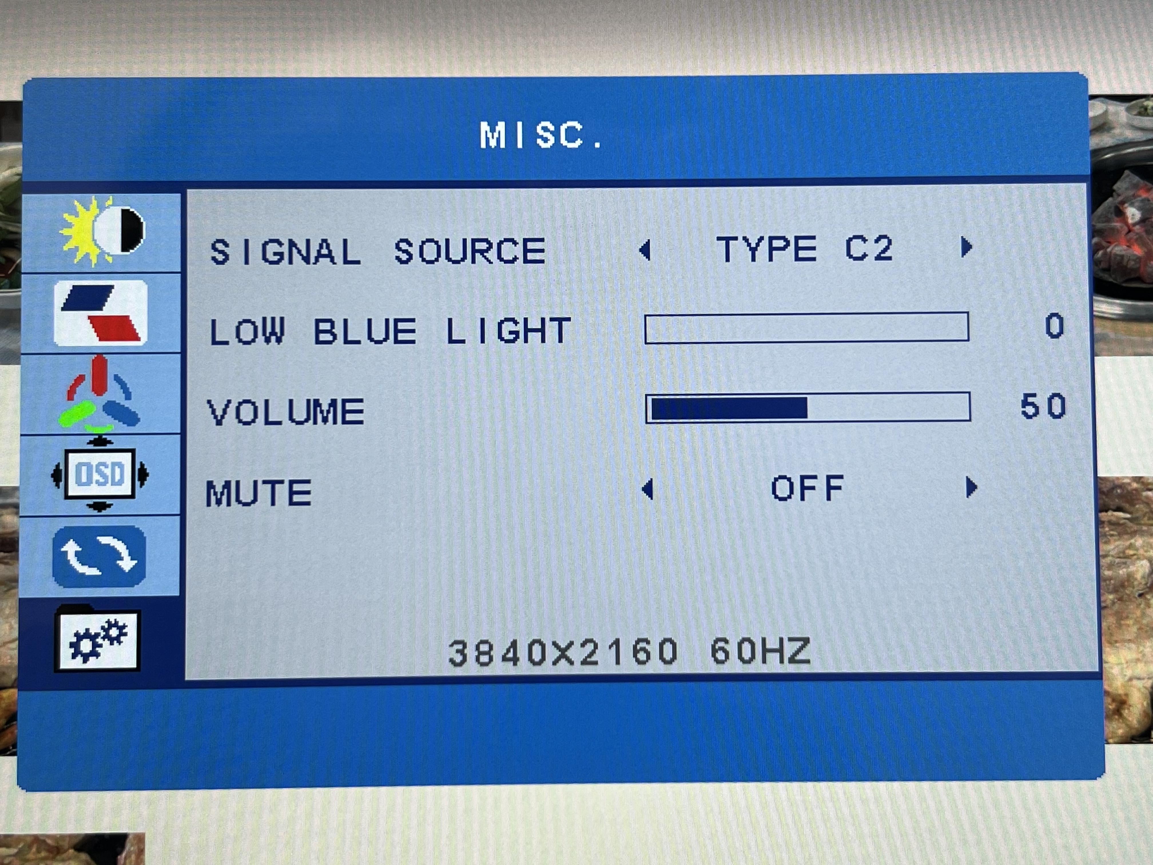 전원 버튼을 짧게 누르면 모니터의 입력 단자를 설정할 수 있는 OSD가 뜹니다. 저는 C2를 입력단으로, C1을 전원 어댑터 입력으로 사용하고 있습니다. 맥북에어에는 HDMI나 DP 단자가 없기 때문입니다.