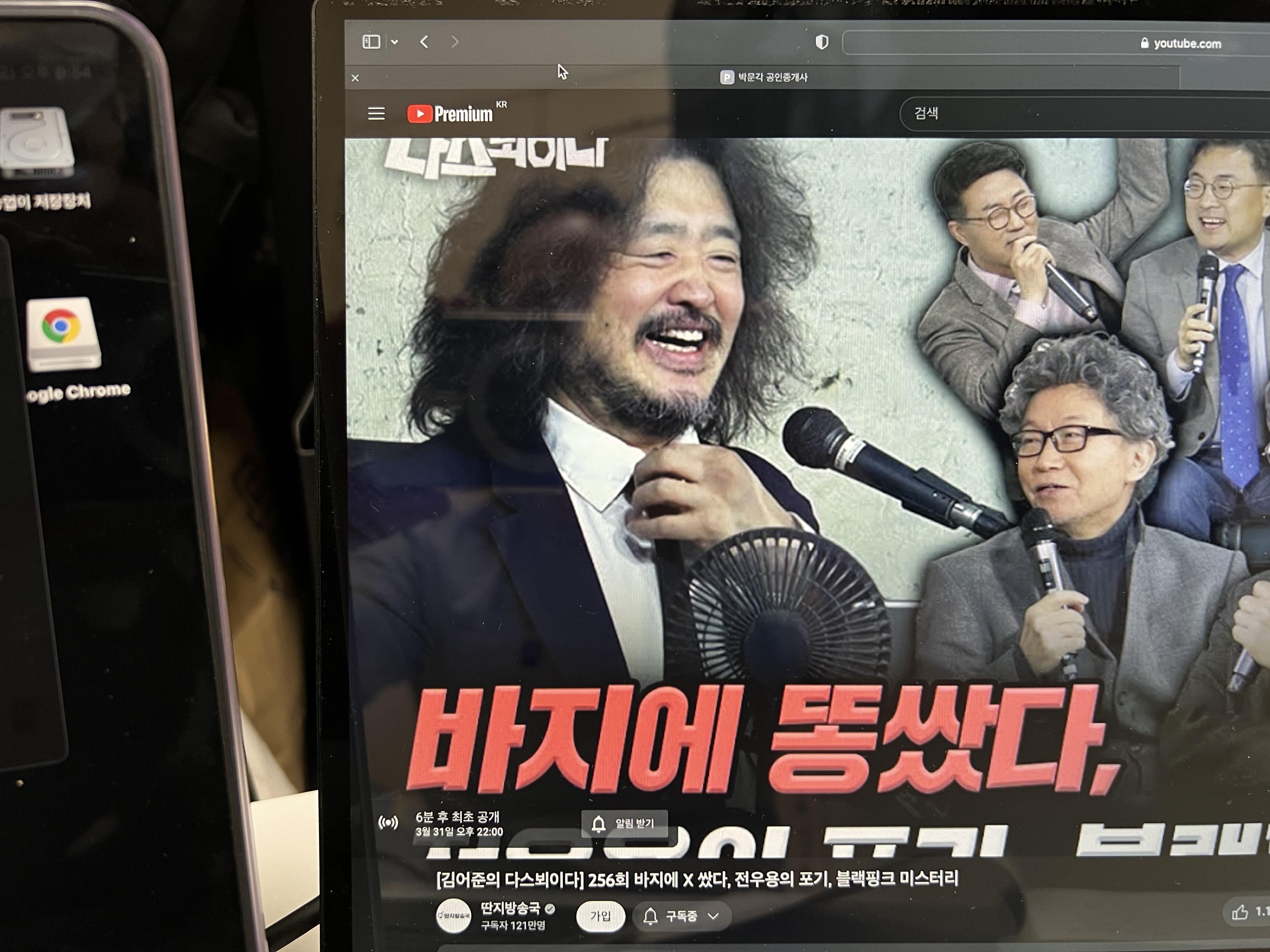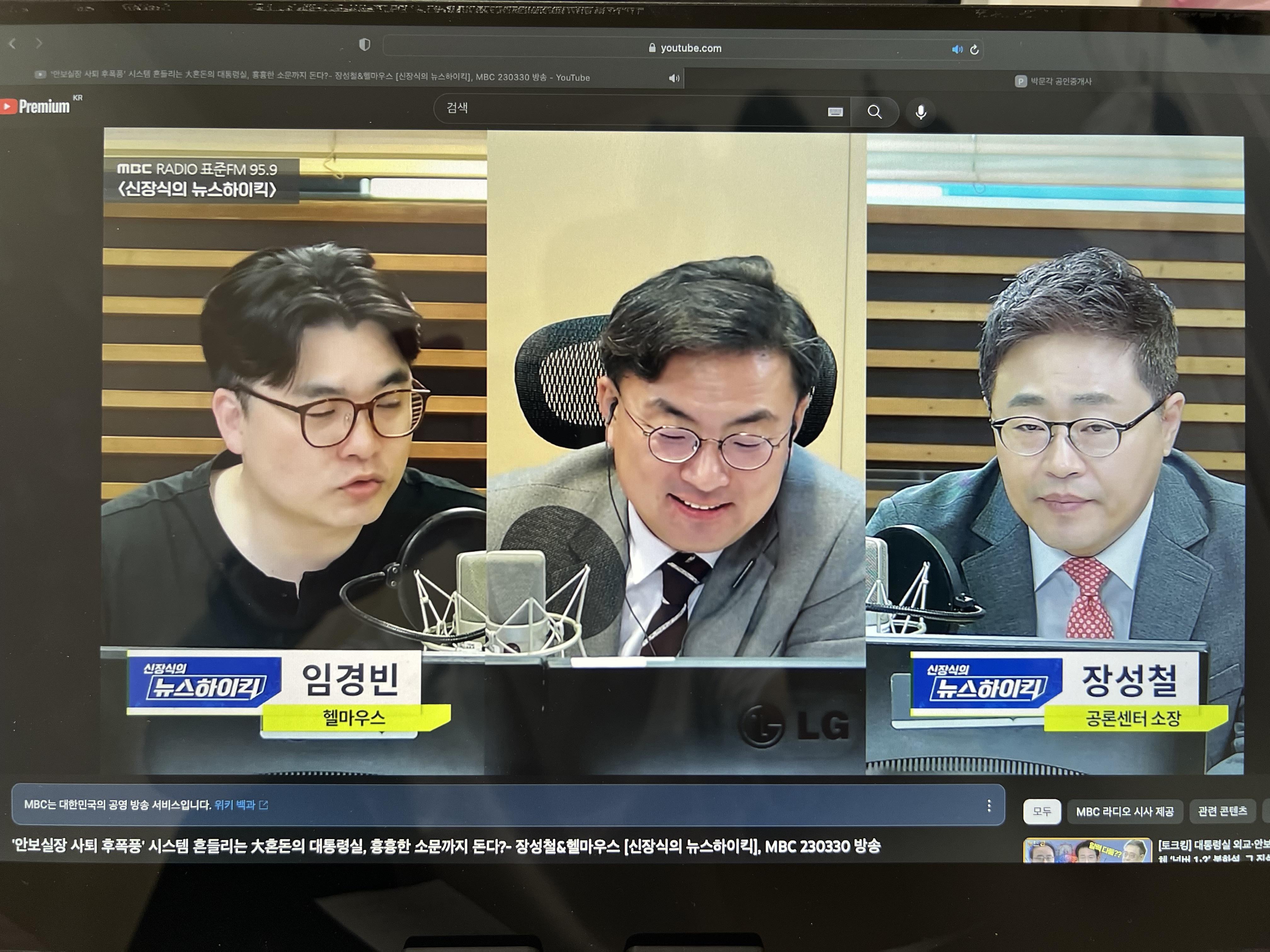MC 신장식 변호사와 좌측 임경빈 작가, 그리고 오른쪽의 장성철 소장의 피부색을 비교해 보면 차이가 느껴지지 않나요? 물론 사람의 피부색이라는 게 사람마다 조금씩은 다르기 때문에 장성철 소장의 피부가 고운 거 아니냐 할 수도 있겠지요. 하지만 분명 우측에 있는 분의 얼굴이 창백해 보이더라고요. 피부가 하얀 게 아니라 '물빠진' 색상이라고 생각이 들었습니다. 터치 패널이 시야각에 문제를 야기하는 것은 아닌가 싶은 거죠. 그래서 몇 가지 테스트를 해 봤습니다.