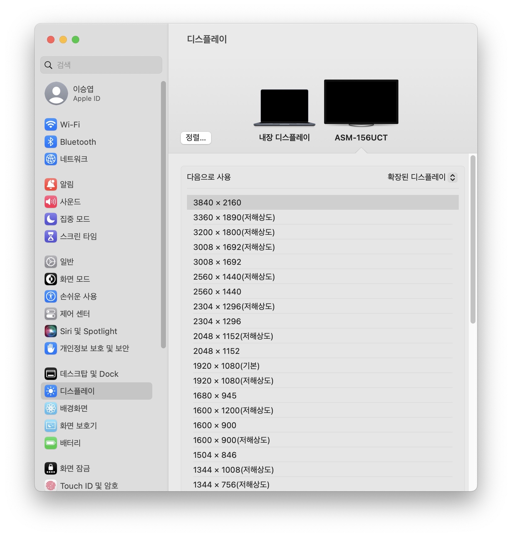 모니터의 해상도는 기본으로 UHD, QHD, FHD 등의 몇몇 해상도만 설정을 할 수가 있습니다. 모든 해상도 보기를 선택하면 모니터가 지원하는 모든 설정값을 선택할 수가 있습니다. 이전에 사용하던 모니터의 경우 기본값이 저해상도이고 별도의 HiDPI 모드를 지원했었습니다. 그러나 ASM-156UCT는 기본이 HiDPI 모드이고 별도의 저해상도 모드를 따로 지원하고 있습니다. 그래서 저는 1920x1080(기본) 해상도로 놓고 쓰고 있습니다.
