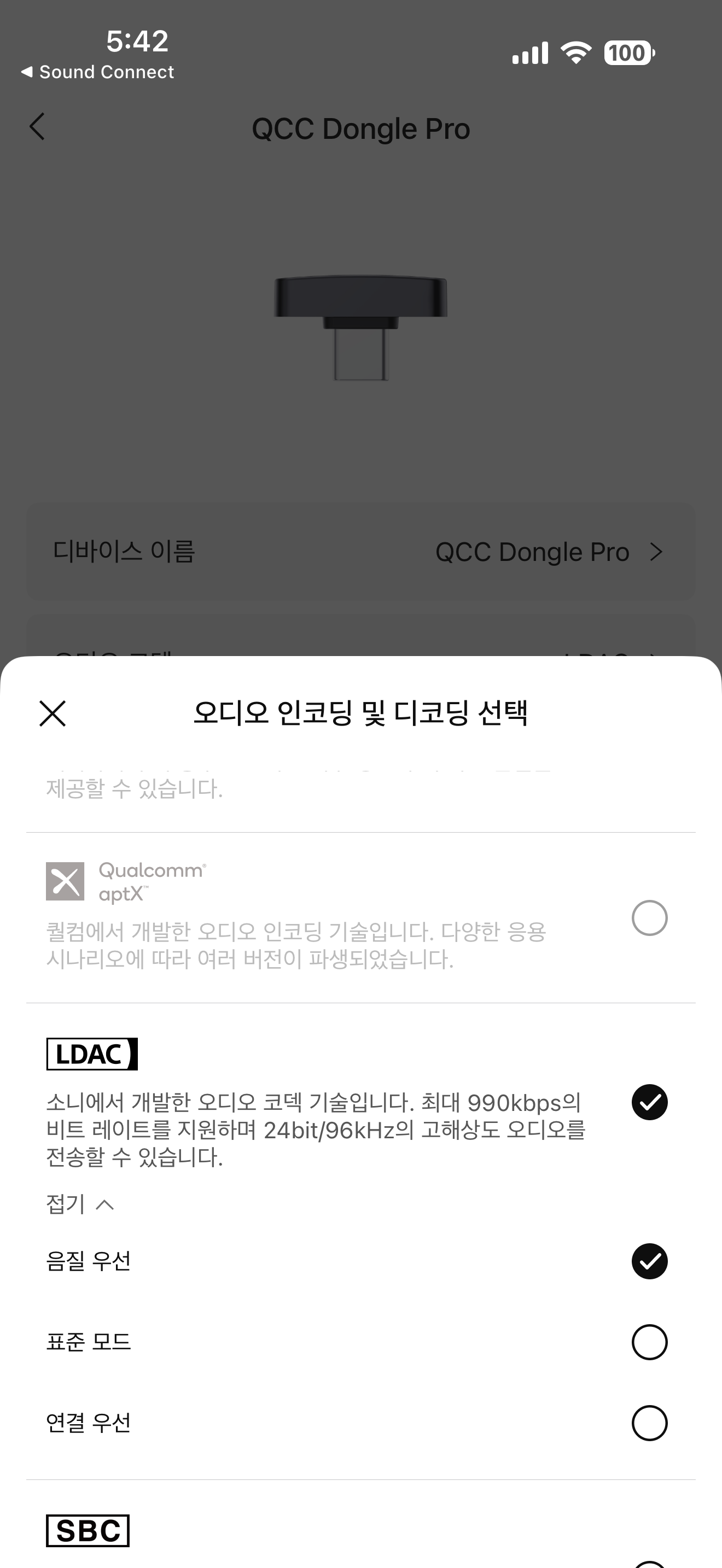 저는 아이폰 유저이기 때문에 기본 아이폰으로 듣기 보다는 QCC Pro 동글로 페어링을 한 후, 소니의 자랑 고음질 코덱 LDAC의 음질 우선 모드로 음악을 들었습니다. 확실히 소니 기기는 AAC가 아닌 LDAC으로 들어야 제대로 된 소리를 들을 수 있습니다. 그건 AptX Adaptive 코덱을 지원하는 기기들도 마찬가지이긴 하니 가급적 고음질 코덱 지원 동글을 하나 정도 구입하시는 게 어떨까 조심스레 추천합니다. 갤럭시도 LDAC은 지원하지만 AptX Adaptive나 Lossless는 지원하지 않으니까요.