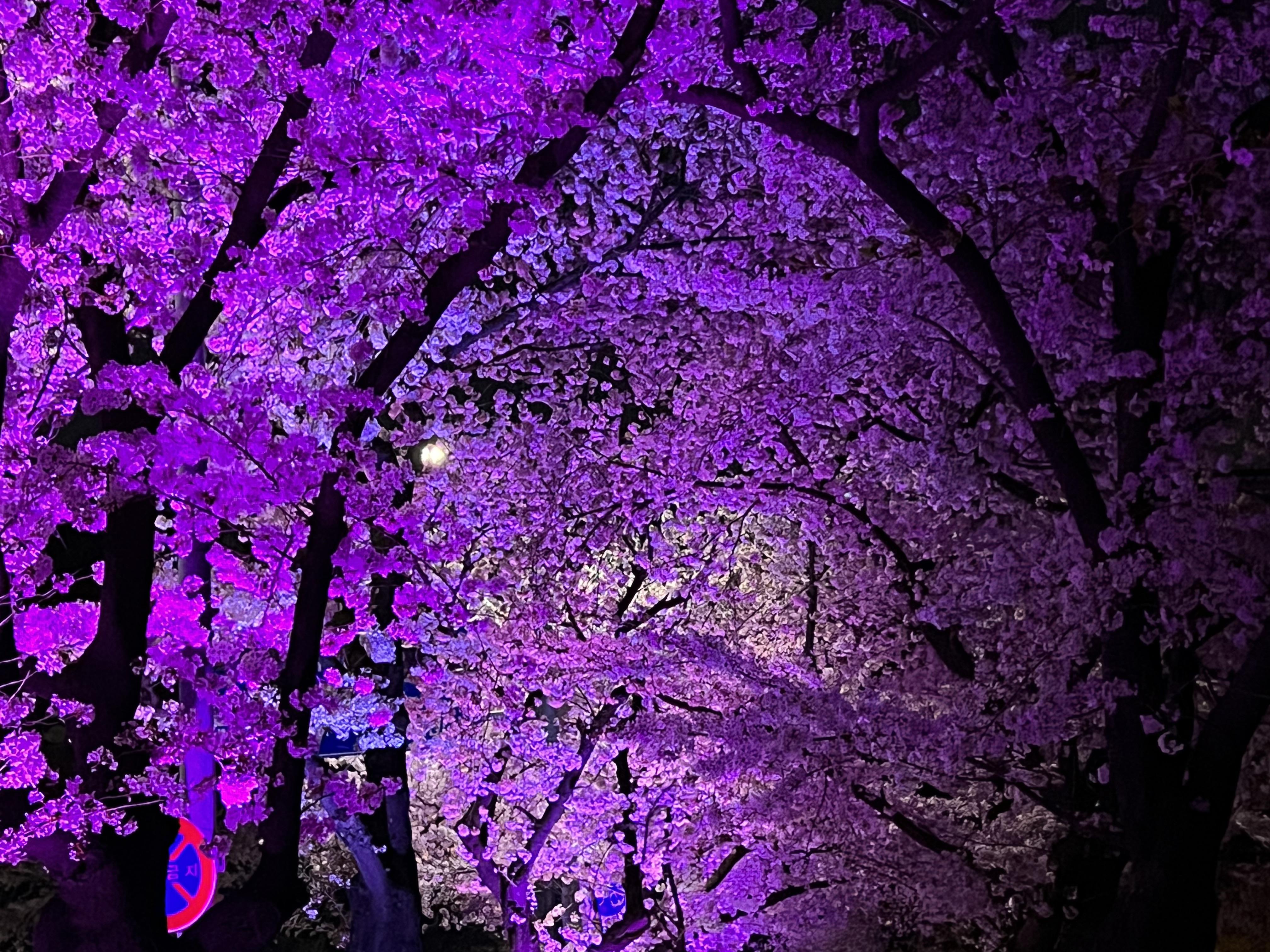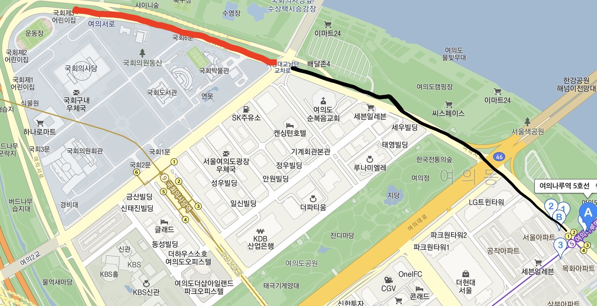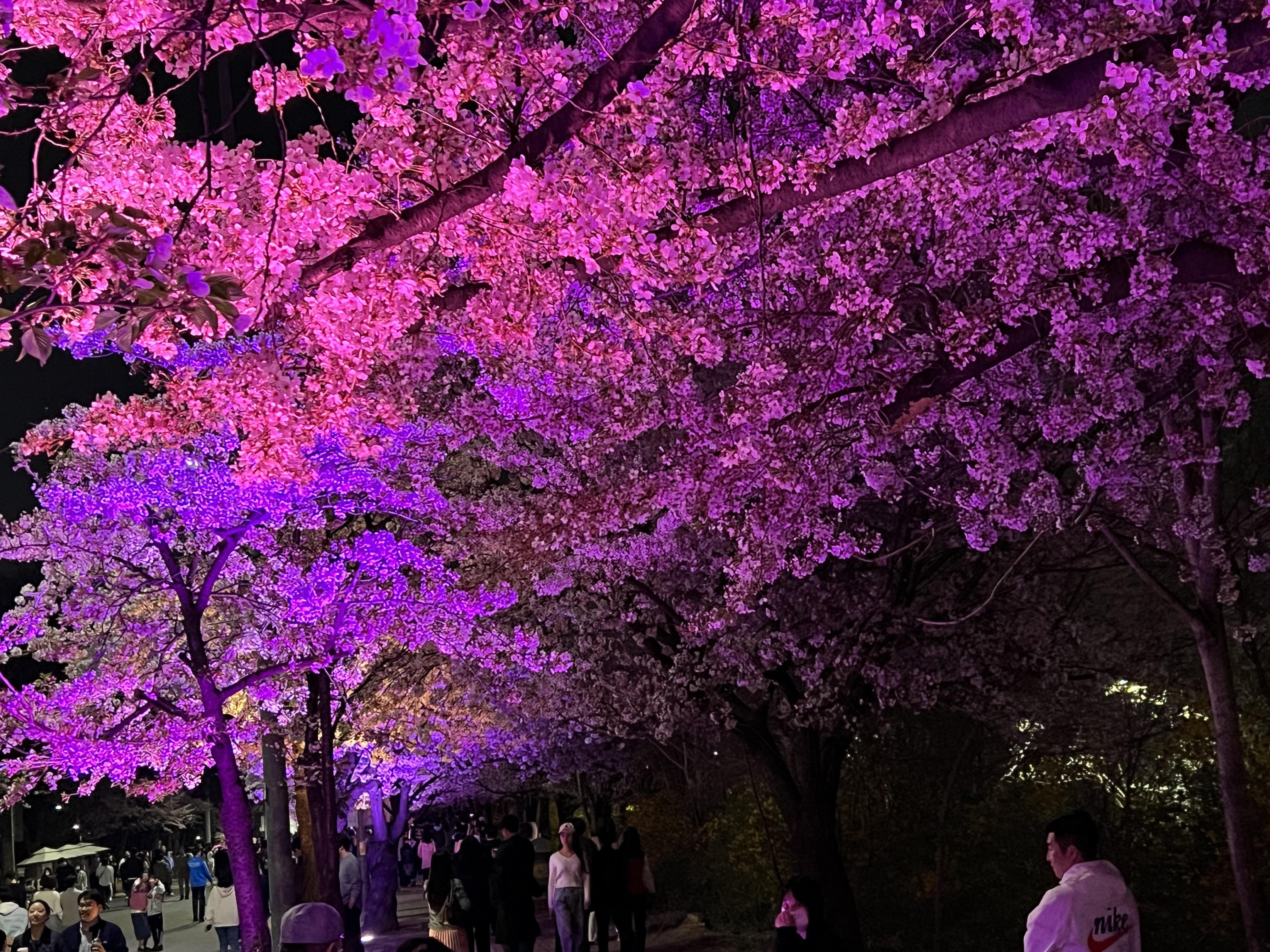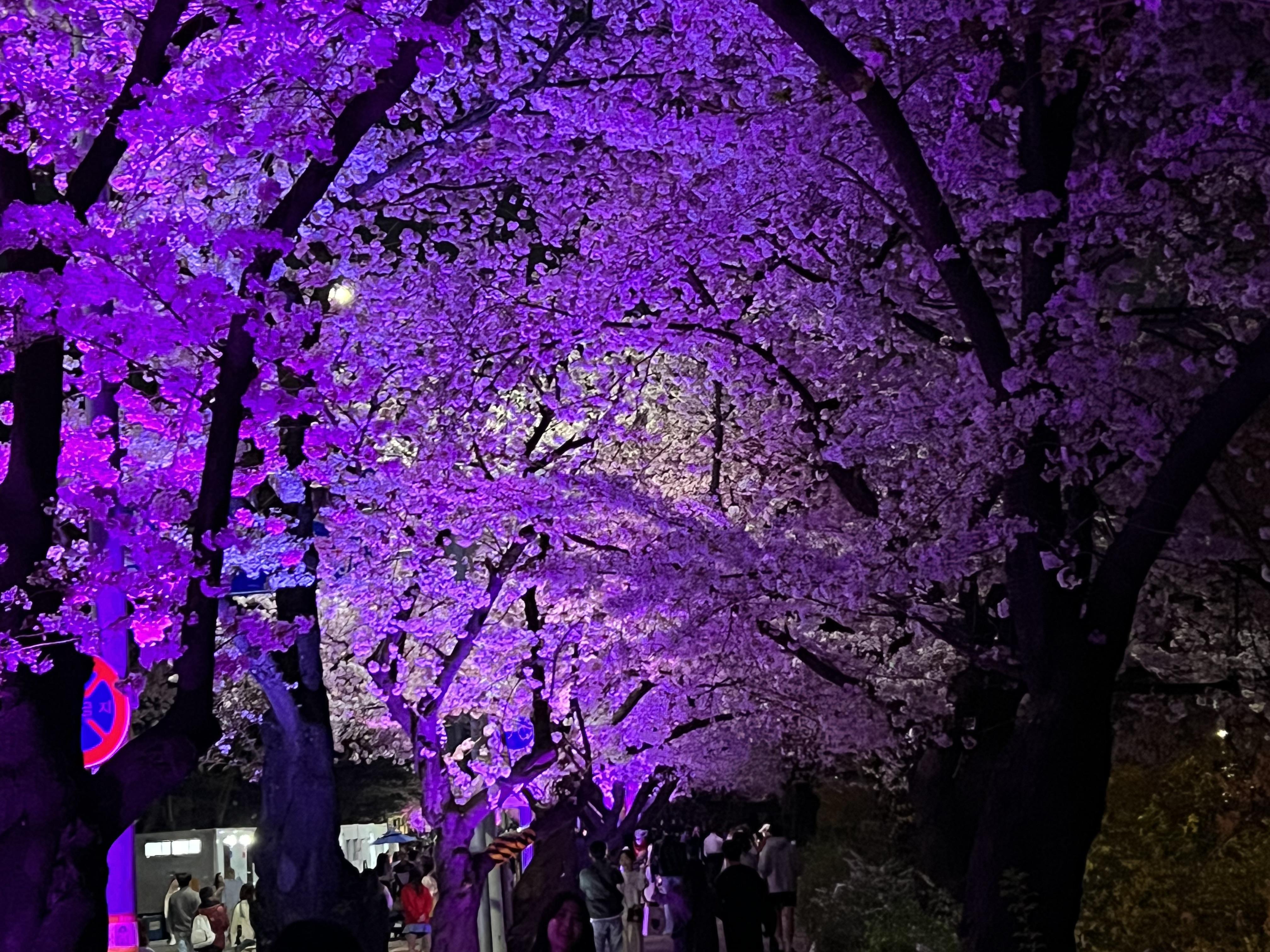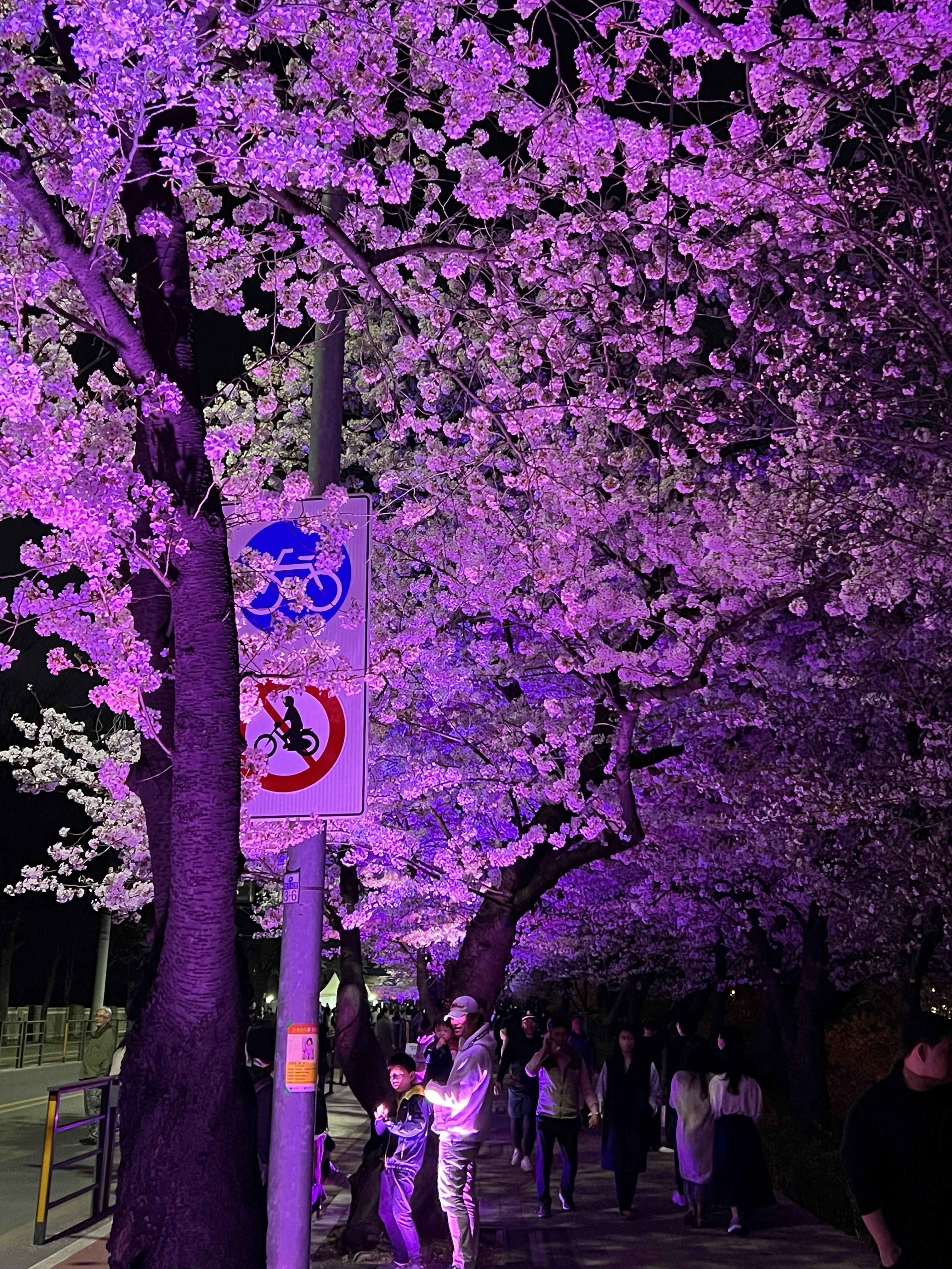 저 지도 그림을 기준으로 해서 여의나루역에서부터(물론 여의동로에도 벚꽃나무는 있지만) 여의도순복음교회가 있는 교차로까지의 검은색으로 줄 그어 놓은 길은 조명이 없어서 가로등에 비치는 벚꽃을 구경해야 합니다. 물론 그 자체로도 수묵화 같고, 예쁜 게 벚꽃이긴 하지만 그래도 빨간색으로 줄 그어진 국회 뒷길은 인도 바닥에서 하늘을 향해 비추는 LED 조명 덕분에 정말 황홀할 정도로 아름다운 벚꽃을 구경할 수 있습니다.