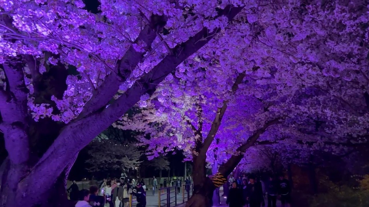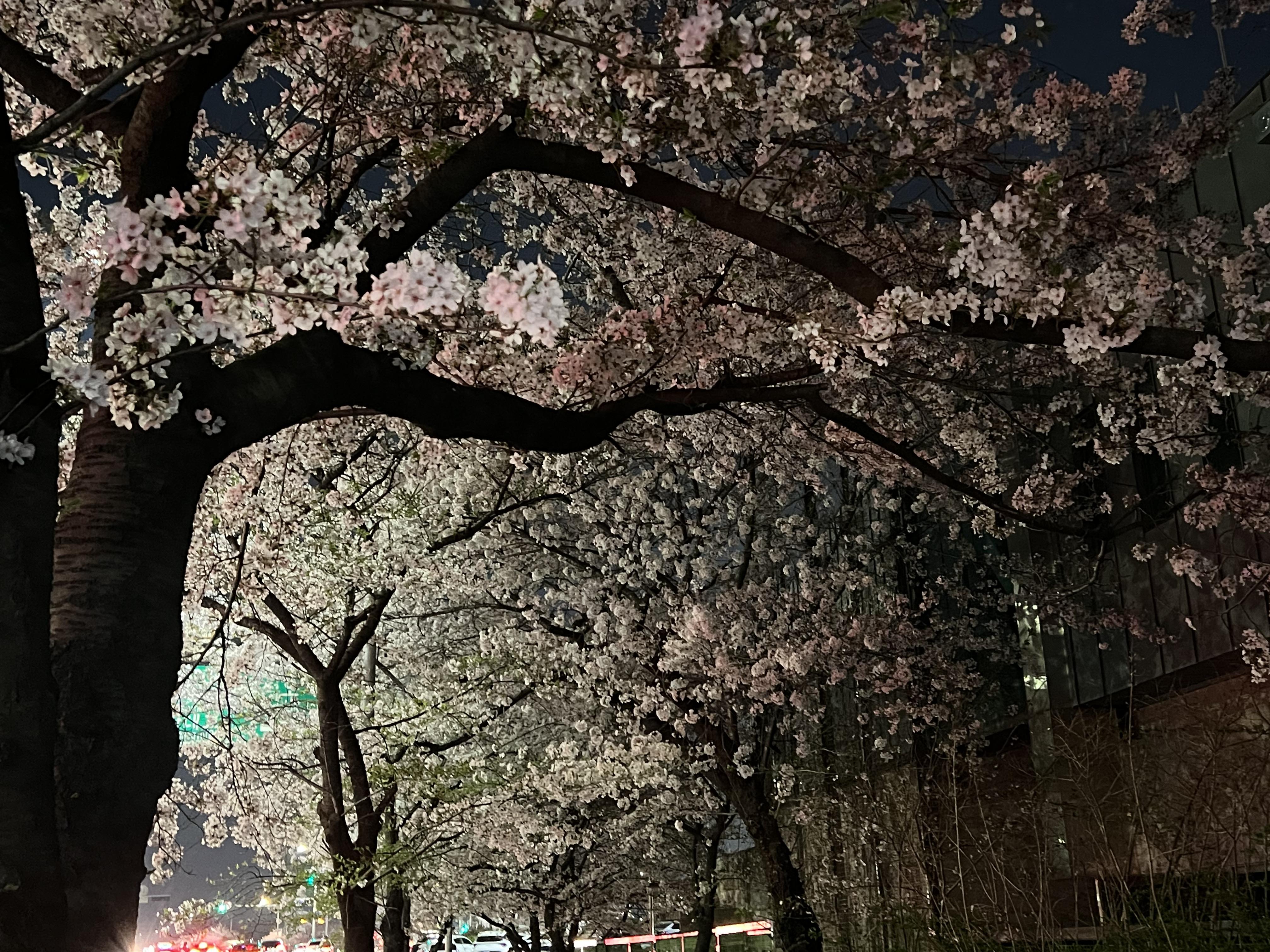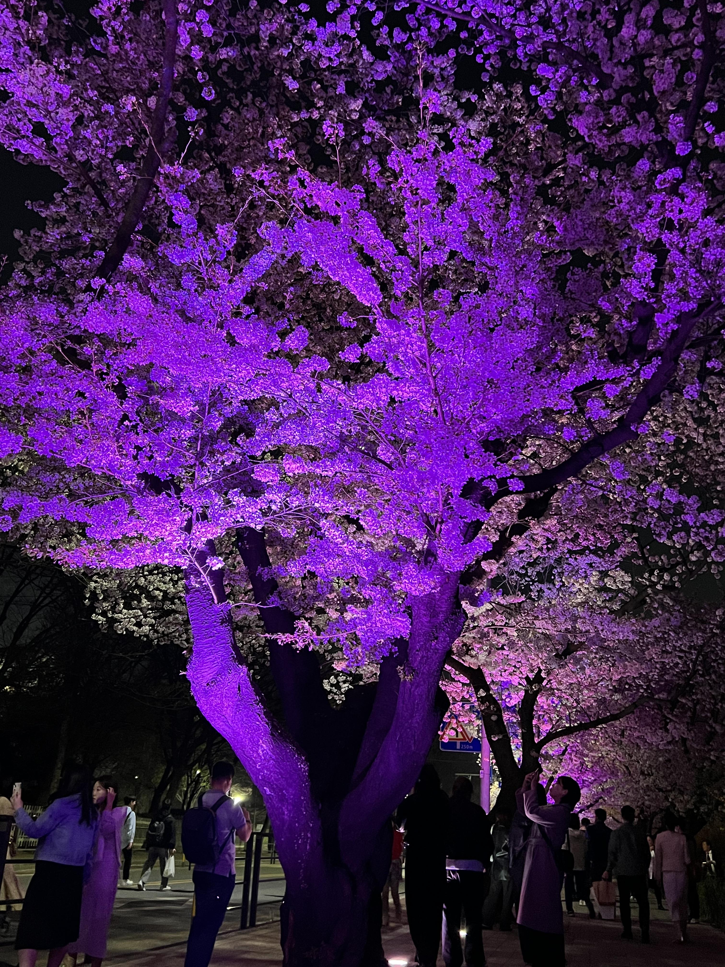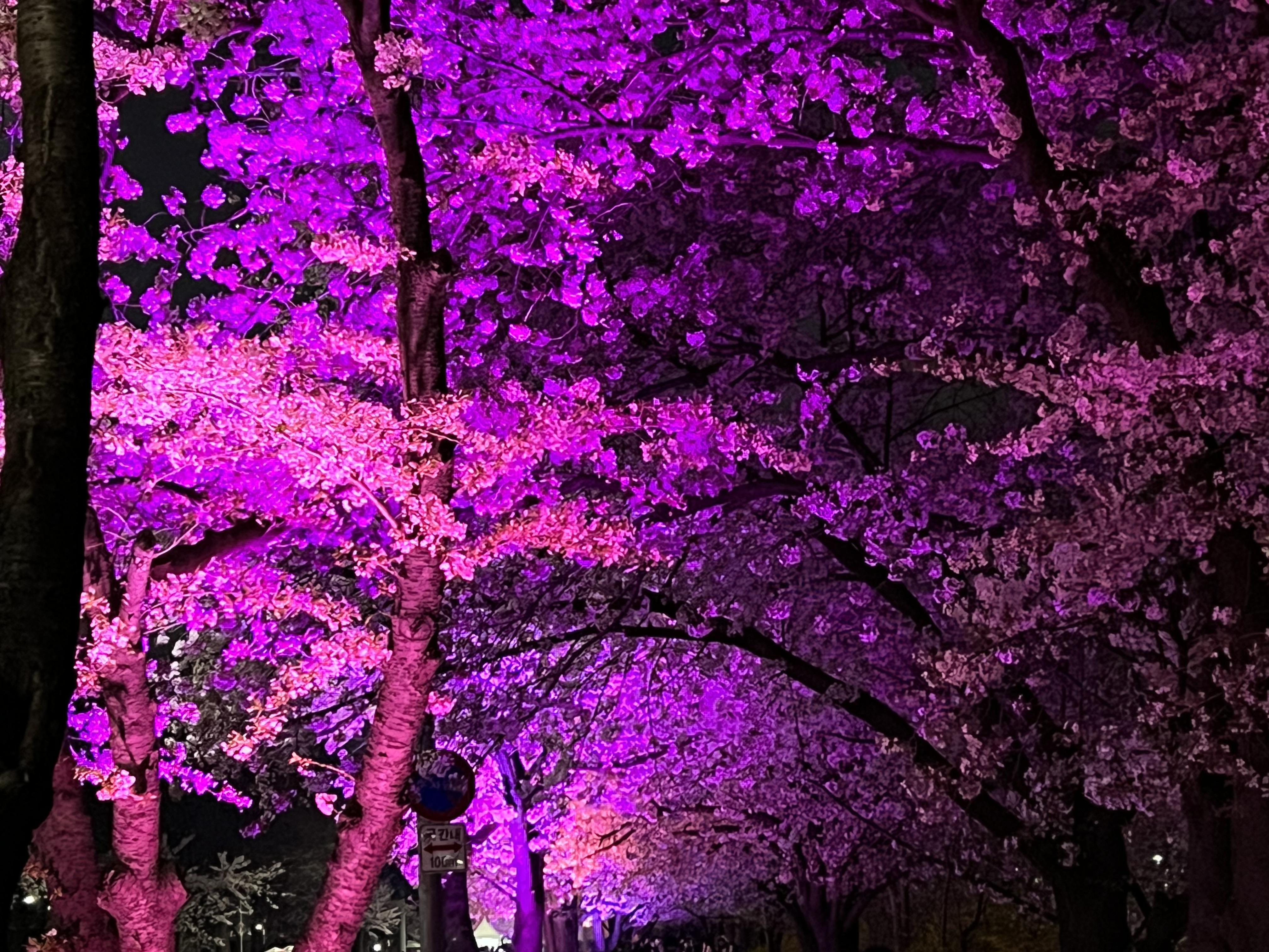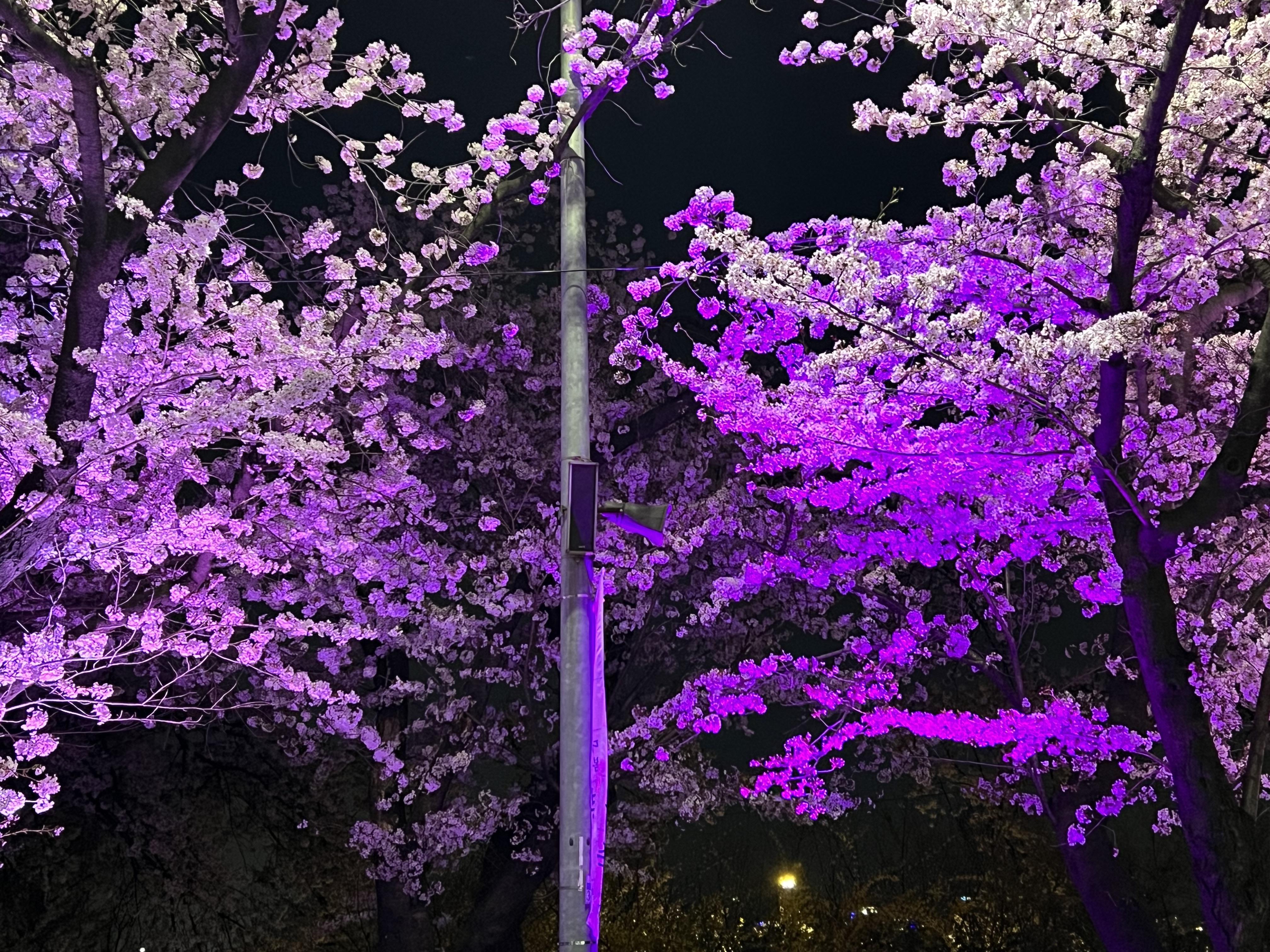 저 지도 그림을 기준으로 해서 여의나루역에서부터(물론 여의동로에도 벚꽃나무는 있지만) 여의도순복음교회가 있는 교차로까지의 검은색으로 줄 그어 놓은 길은 조명이 없어서 가로등에 비치는 벚꽃을 구경해야 합니다. 물론 그 자체로도 수묵화 같고, 예쁜 게 벚꽃이긴 하지만 그래도 빨간색으로 줄 그어진 국회 뒷길은 인도 바닥에서 하늘을 향해 비추는 LED 조명 덕분에 정말 황홀할 정도로 아름다운 벚꽃을 구경할 수 있습니다.
