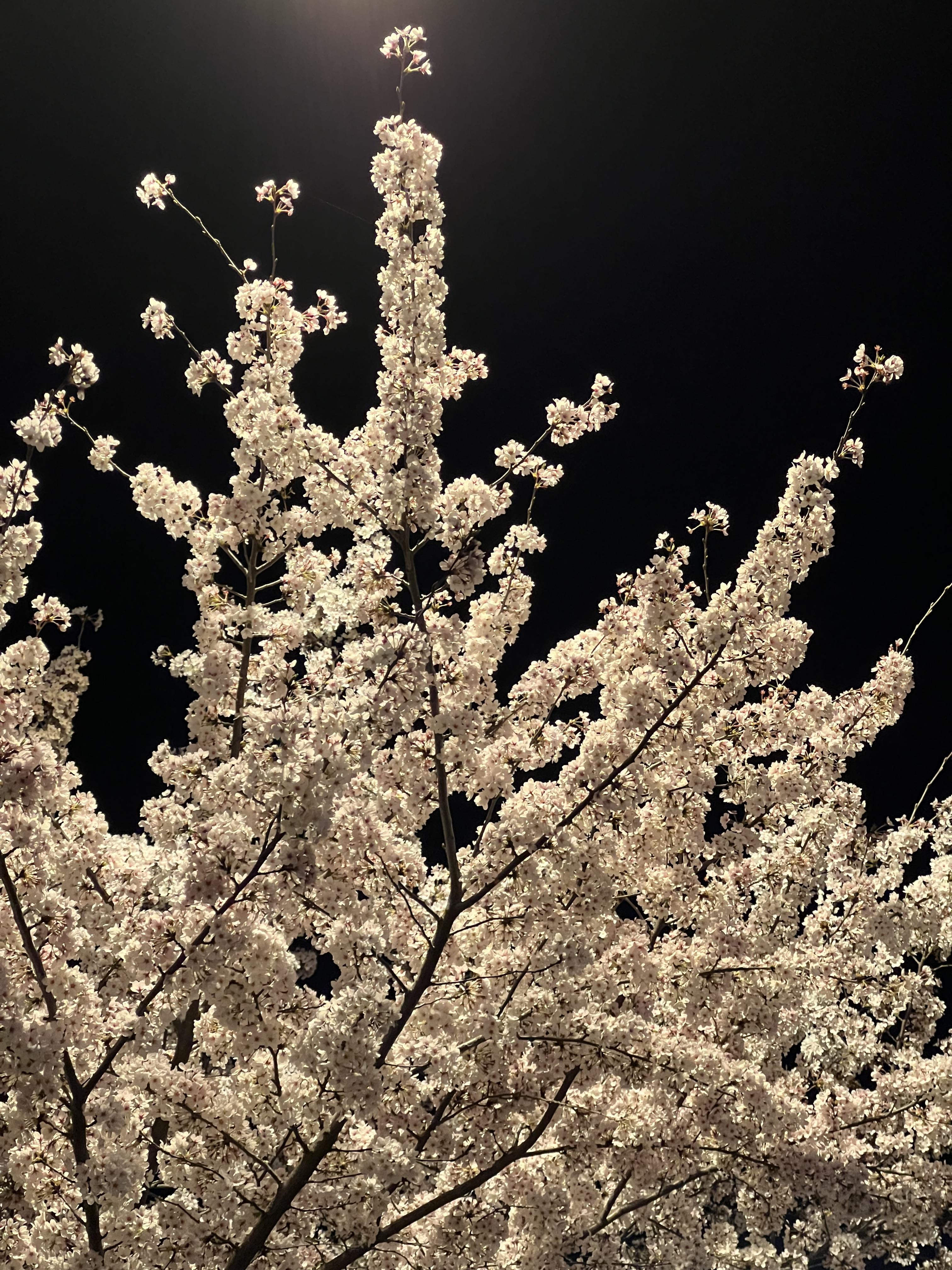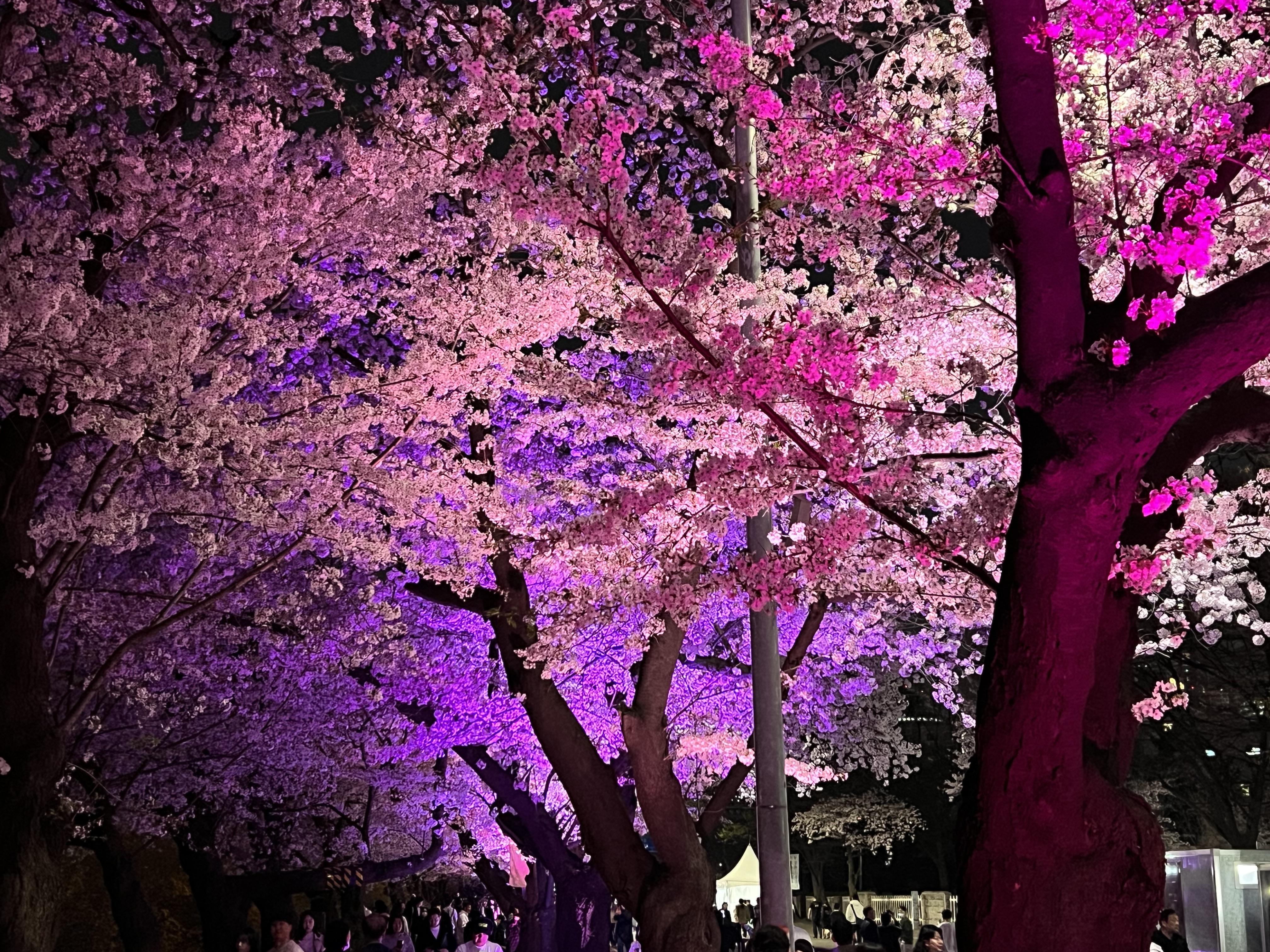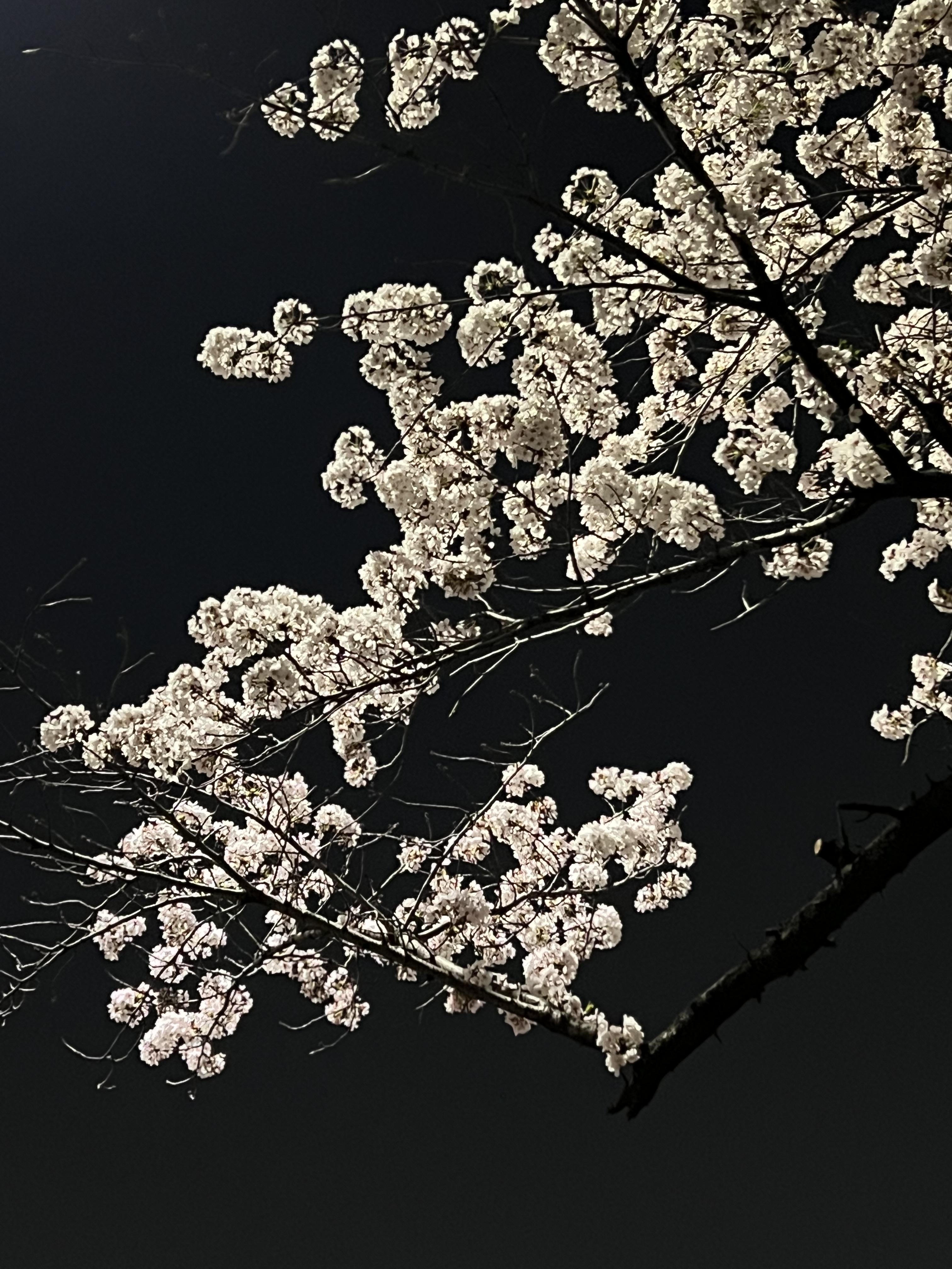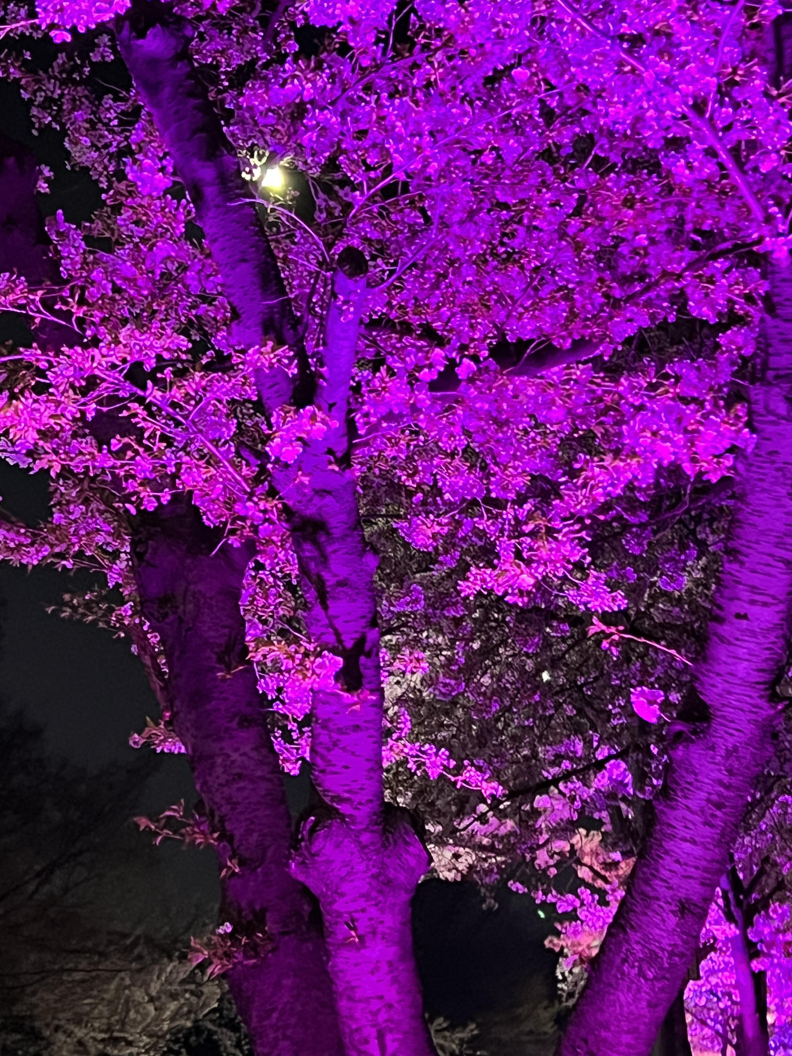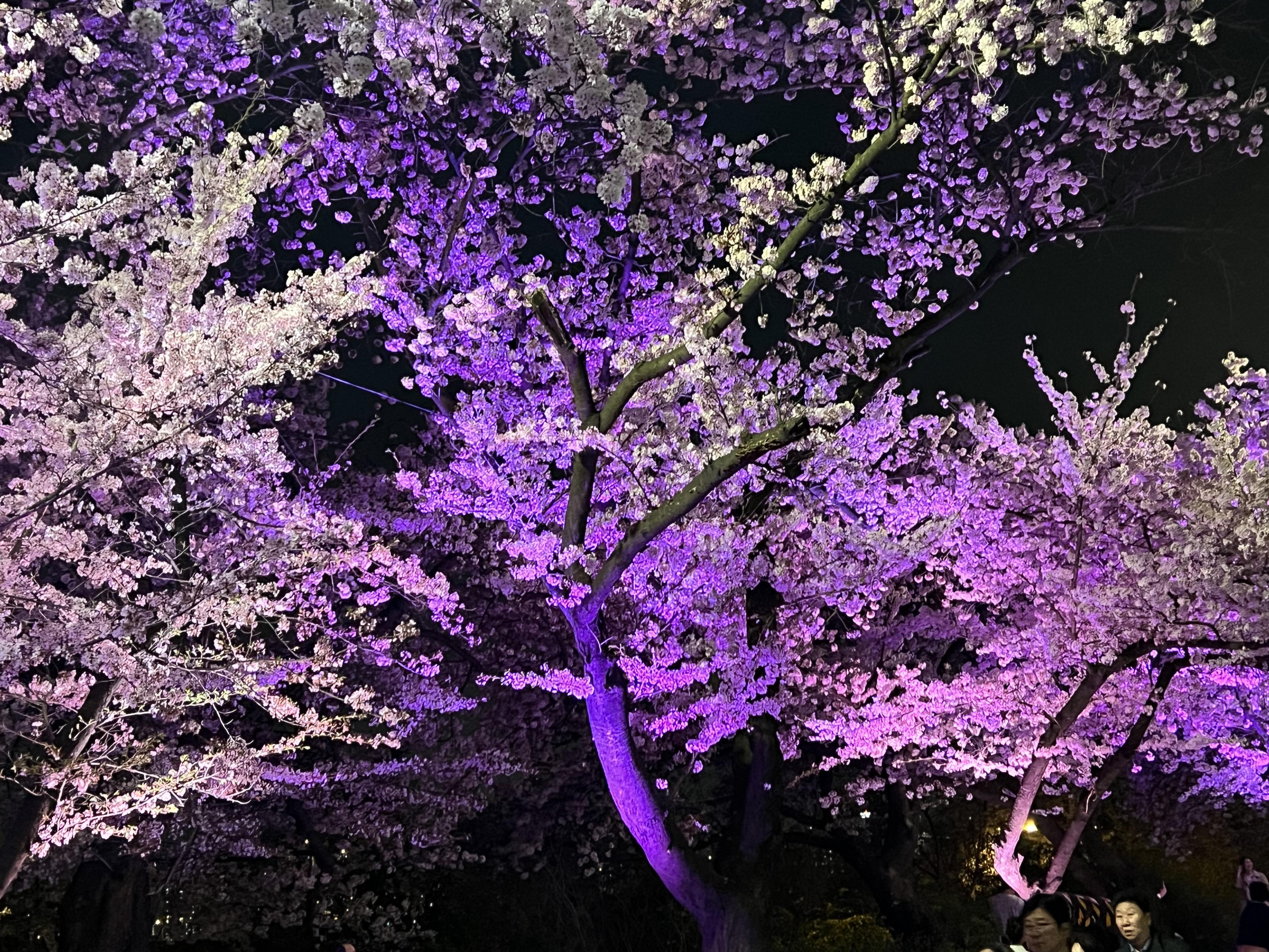 저 지도 그림을 기준으로 해서 여의나루역에서부터(물론 여의동로에도 벚꽃나무는 있지만) 여의도순복음교회가 있는 교차로까지의 검은색으로 줄 그어 놓은 길은 조명이 없어서 가로등에 비치는 벚꽃을 구경해야 합니다. 물론 그 자체로도 수묵화 같고, 예쁜 게 벚꽃이긴 하지만 그래도 빨간색으로 줄 그어진 국회 뒷길은 인도 바닥에서 하늘을 향해 비추는 LED 조명 덕분에 정말 황홀할 정도로 아름다운 벚꽃을 구경할 수 있습니다.
