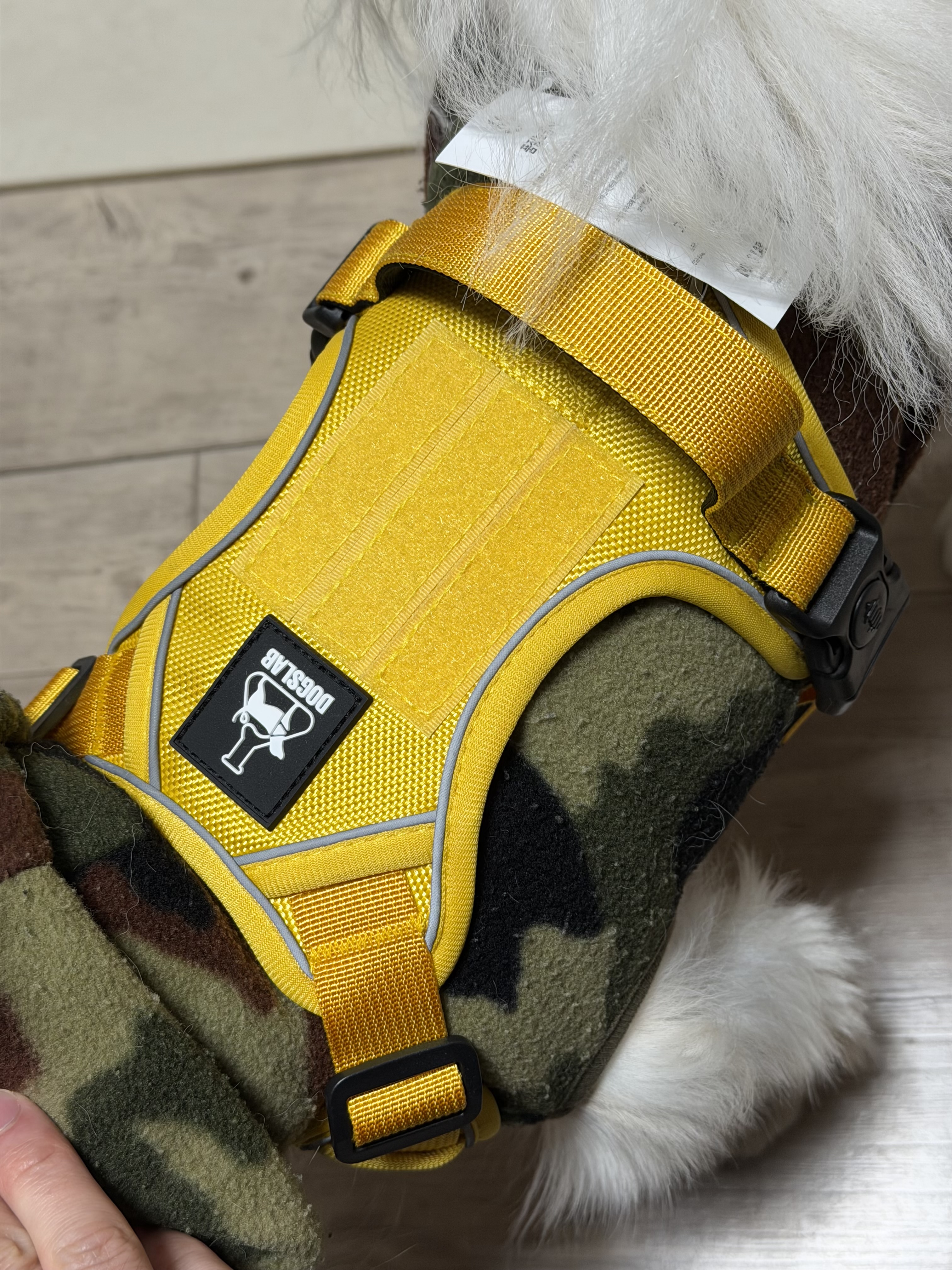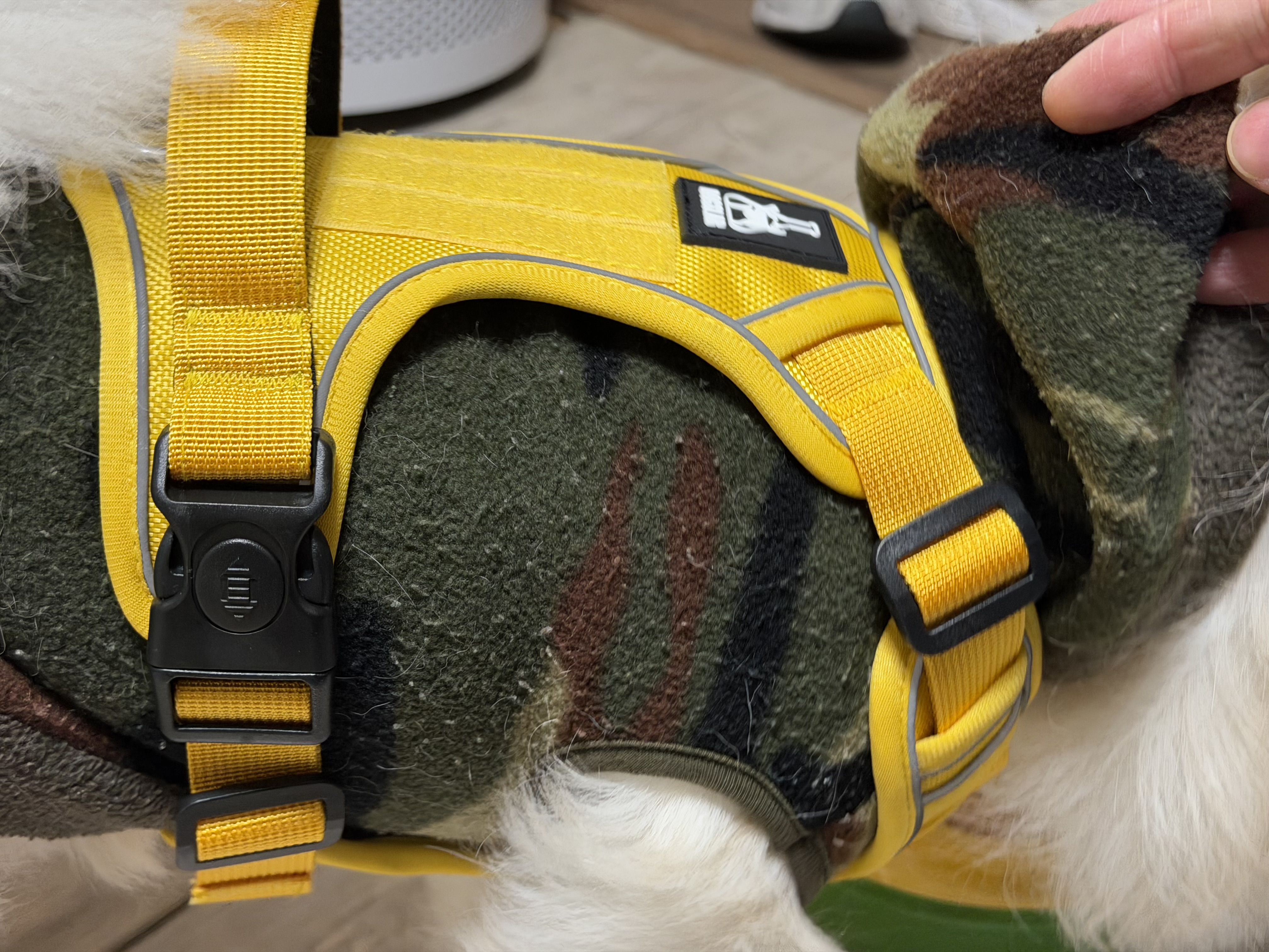 하네스를 채우는 버클이 빠지지 않도록 고정을 할 수 있는 것도 독스랩 컴포트 앞섬방지 하네스의 특징 중 하나입니다. 천 자체도 튼튼하고, 박음질도 잘 되어 있는데 거기에 이런 버클에까지 고정력을 더해 주고 있어서 가격에 비해서는 마무리가 매우 좋은 제품이라는 생각이 듭니다. 제가 직접 착용하는 입장이 아닌 상황에서는 매우 만족스럽네요. 그래서 밥풀이에게 바로 입혀 봤습니다.